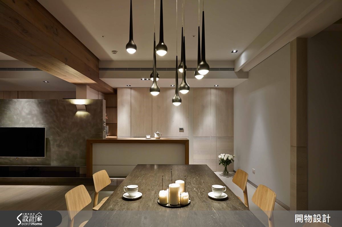 在这项设计中,屋主期望能拥有一个自由、多互动的居住空间,于是设计师采以开放格局与穿透式的立面设计,让不同区域之间保有区隔、但仍相互连结,呈现出开阔的居家视野。【风化实木,彰显天然气息】走进空间中,可见到客、餐厅大量留白的设计手法,以开放格局形成宽敞的感受,同时于电视主墙采用通透的立面规划,藉此保有视线穿透,也界定出玄关与客厅区域。在公共区域之中,在天花板加入风化实木材质,彰显质朴的天然气息,并藉由梁体的延伸,区隔公共空间的使用领域。卫浴则以清玻做隔断,规划舒适的干湿分离。并以大量大理石铺陈空间,同时加入蓝绿色彩与深色砖材,在异材质的相互搭配之下,释放出一股冲突的摩登美感。整体设计中,设计师以木素材、大理石等建构清浅色调,但同时点缀深色的造型灯具,凸显出抢眼张力。