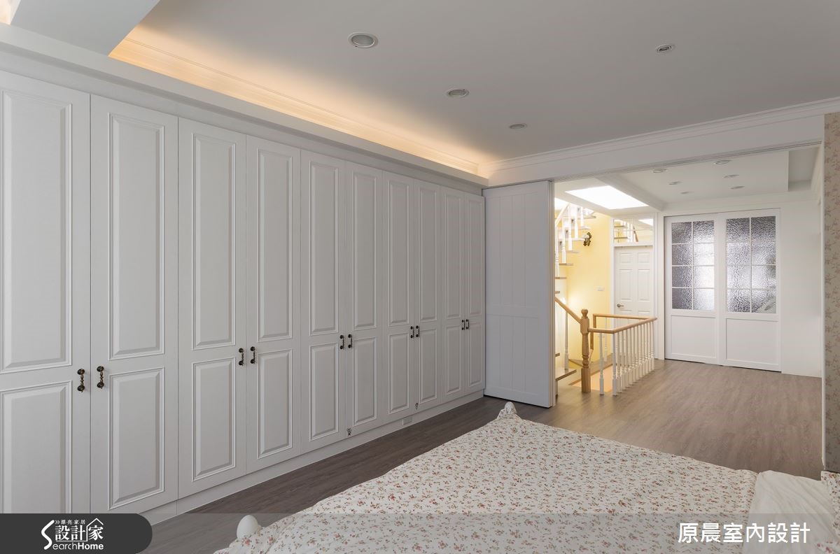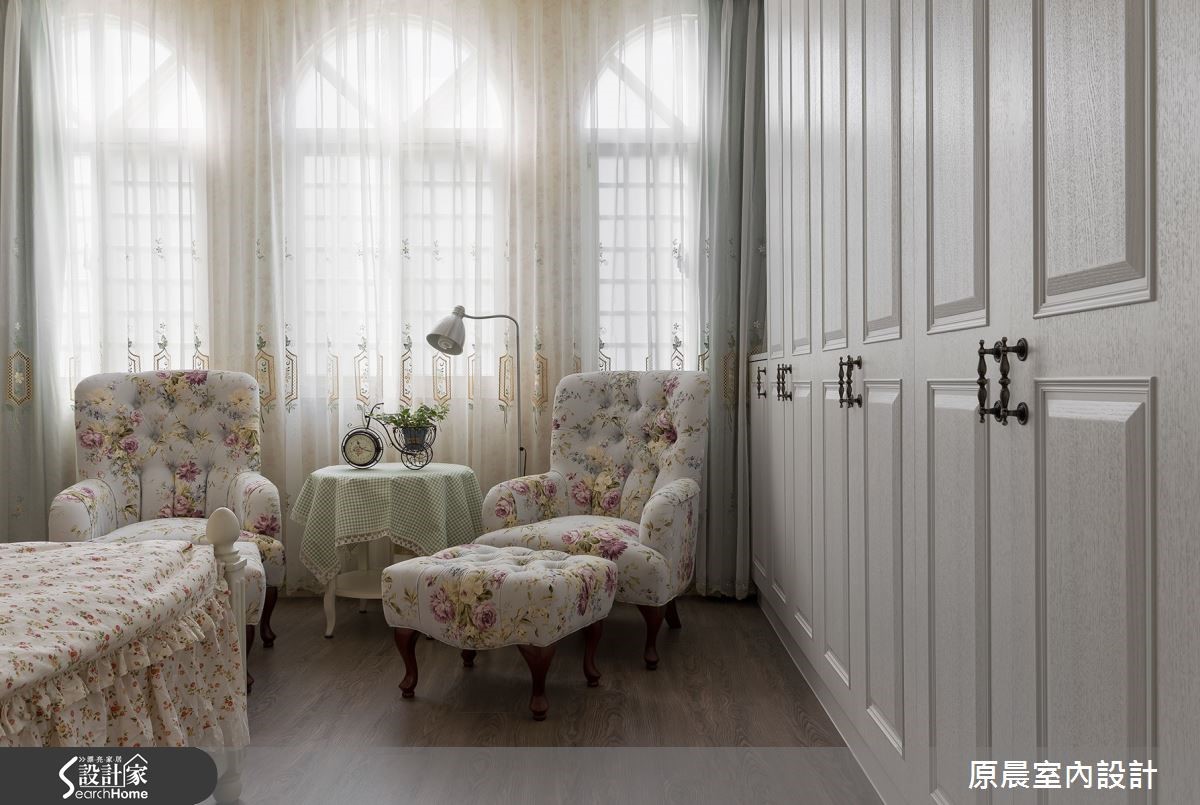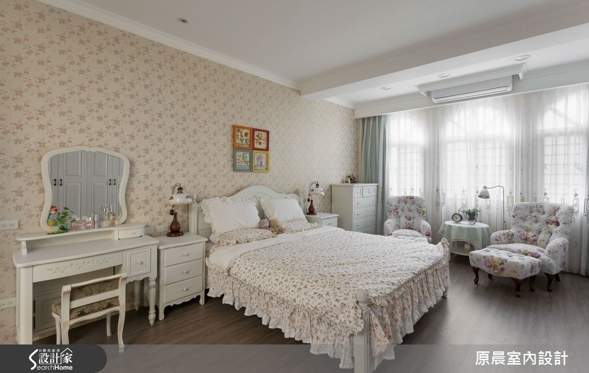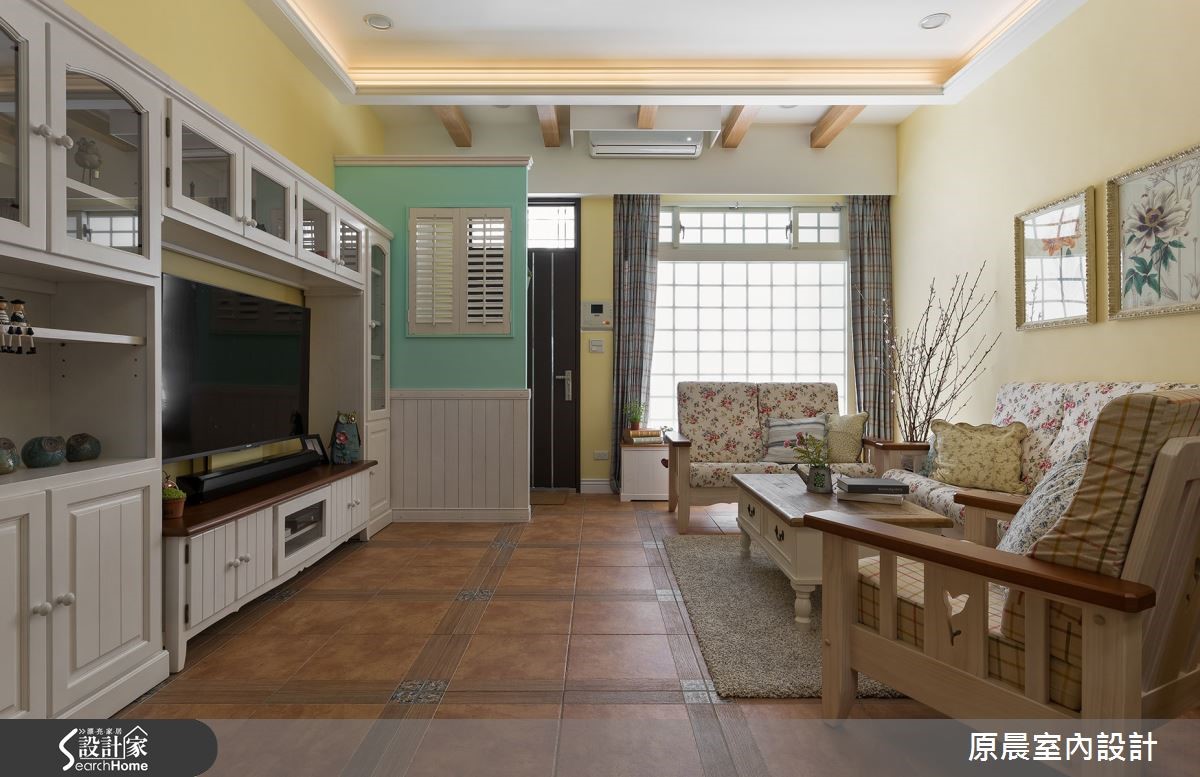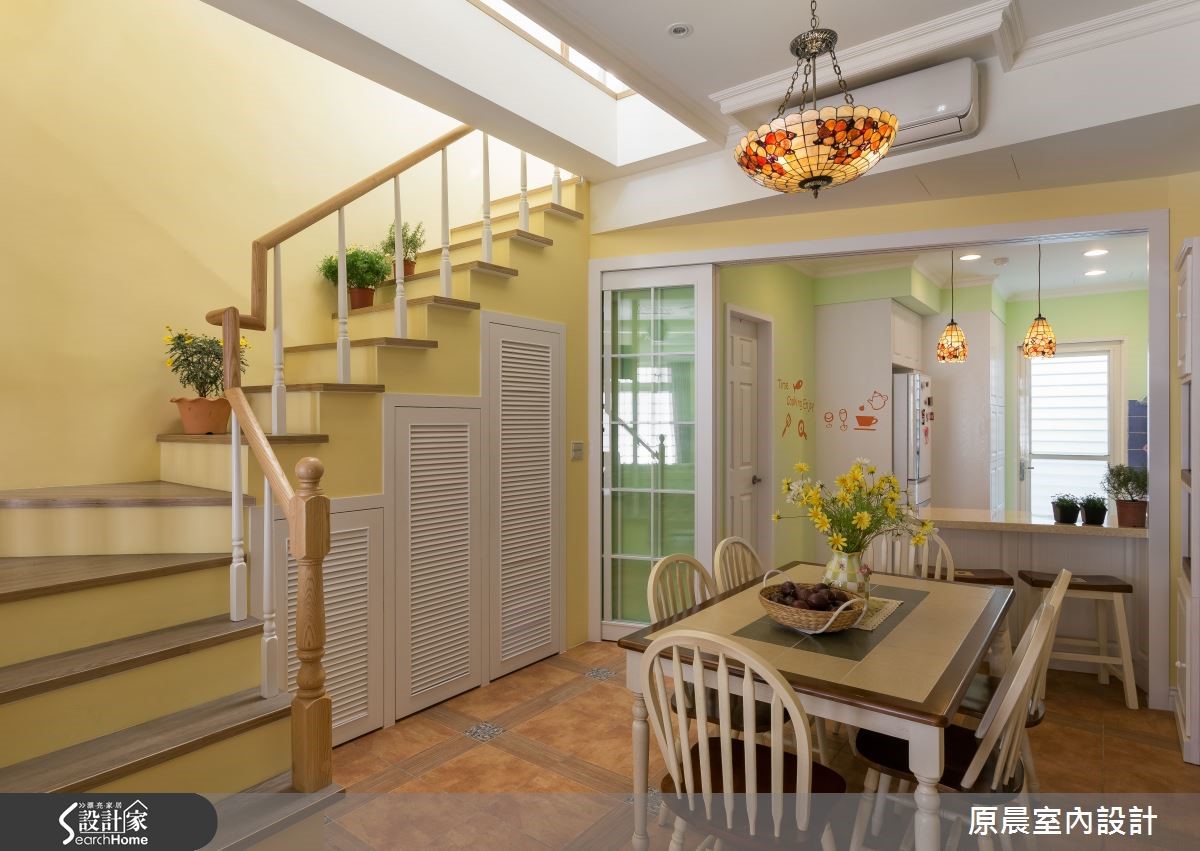 浪漫优雅的乡村风,带有度假悠闲的风情,也充满家的温馨气息,这样的设计质感,是不是也掳获你的心呢?这次的案例,因屋主夫妻长年在国外工作,希望能帮自己与家人打造出一个绝佳的居住环境,特别购入位于郊区的独栋楼。【运用天井设计,解决采光问题】设计师先将顶楼加盖的铁皮改成透明质材,不仅提升空间质感,同时保有原先遮雨的优点,更能改善采光问题,此外再结合天井的设计思维,从顶楼天花的造型设计,一路将阳光顺势带入室内,直到一楼空间,一举解决了一楼采光不佳的问题,无形中也能让室内空气流通。随着时间的递嬗,阳光也能巧妙妆点出空间的氛围,显得格外浪漫。 因屋主夫妻讲求个人隐私,设计师利用格局的特性,将一楼空间安排为公共空间,沿着楼梯向上,才是私人住卧空间,透过公私区隔的设计,保有屋主所追求的生活质量。【暖阳暖黄色,诠释客厅空间】位在一楼的客厅空间,设计师挑选暖黄作为电视背墙的壁色,温暖的色调就像是托斯卡尼的暖阳,再利用白色柜体作为收纳小物的陈列柜,地板铺设复古砖,搭配上白色碎花的布质沙发,利用木质格栅、白色壁板墙,一同烘托出乡村风的典雅。【蓝天白云意象,妆点餐厨区】餐厨空间,因造型灯饰更有画龙点睛的细腻感,利用白色格栅拉门区隔餐厨空间,让空间更富有机动性,下厨时只要将拉门拉上,就能阻隔油烟。厨房空间以白色橱柜配合蓝色马赛克砖,挥洒出有如蓝天白云的度假感,此外还有中岛吧台,让厨房功能更加完备。 【乡村风寝居,营造温暖气息】二楼私领域,设计师改用耐磨木地板配搭文化石墙,营造出温润的气息,整排内嵌柜体,大大提升收纳机能,柜体除可摆放书籍,也可收纳私人物品,让走道空间也能充分运用。主卧空间壁纸选采乡村风碎花的款式,再以白色线板装饰柜体相互映衬,甜美又带有浪漫情怀。【专属一家三口的空中小花园】因考虑屋主夫妻工作忙碌,除了专属打造的风格美宅之外,更应有个能休憩身心的空间,所以设计师特别在顶楼处,以木作打造出有如空中花园的梦幻空间。娇艳欲滴的花儿配上翠绿的植栽,晴空万里暖阳入宅的情境,一家三口快乐地在午后说说笑笑,是多么惬意!