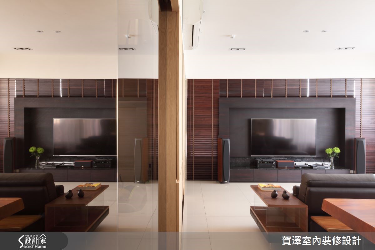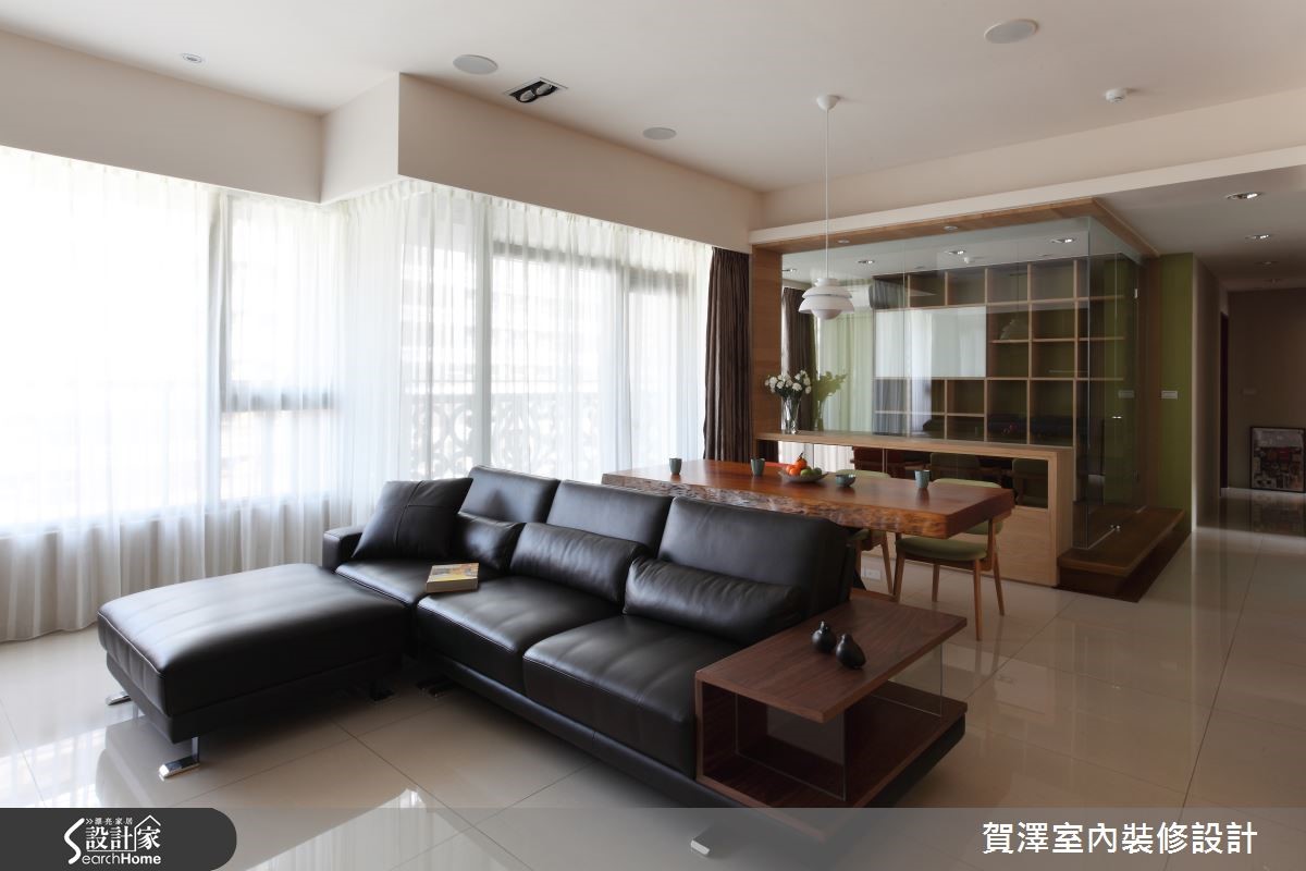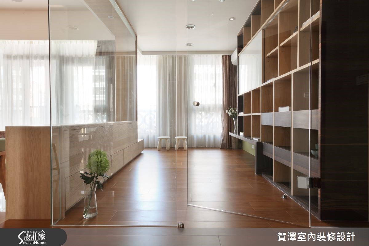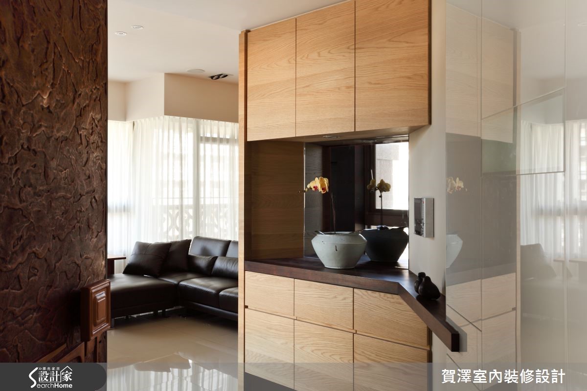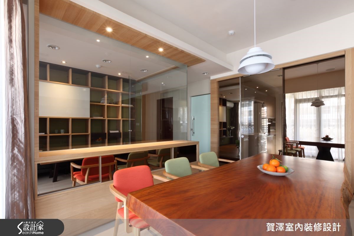 现代宅里住着一对开朗、亲切的屋主夫妻,设计师将两人的新家以现代风为定调,并以深浅色木皮做出疗愈感设计,同时加入实用的机能规划,透过流畅的洽谈过程、贴心到位的服务,打造出屋主深受喜爱的居家空间,快一起走进看看吧!【木纹与细节堆叠,渐层视觉美感】从玄关进入居家,设计师于入口处做出展示柜设计,以镜面为背景,赋予居家一幅静谧的风景意象;客厅则以深色木质铺陈电视墙面,表面刻划出细腻纹理,搭配深色沙发,呈现稳重而对称的空间视感。餐厅在采光、原木调、彩色软件陪衬下,跳脱温柔而活泼的氛围;同时于后方架高地平,规划出多功能书房,以清玻璃围塑空间,打造出延伸通透的居家视野;草绿色为墙面色彩,嵌入收纳木隔板,在满足收纳机能的同时,也为一幅美好画面!