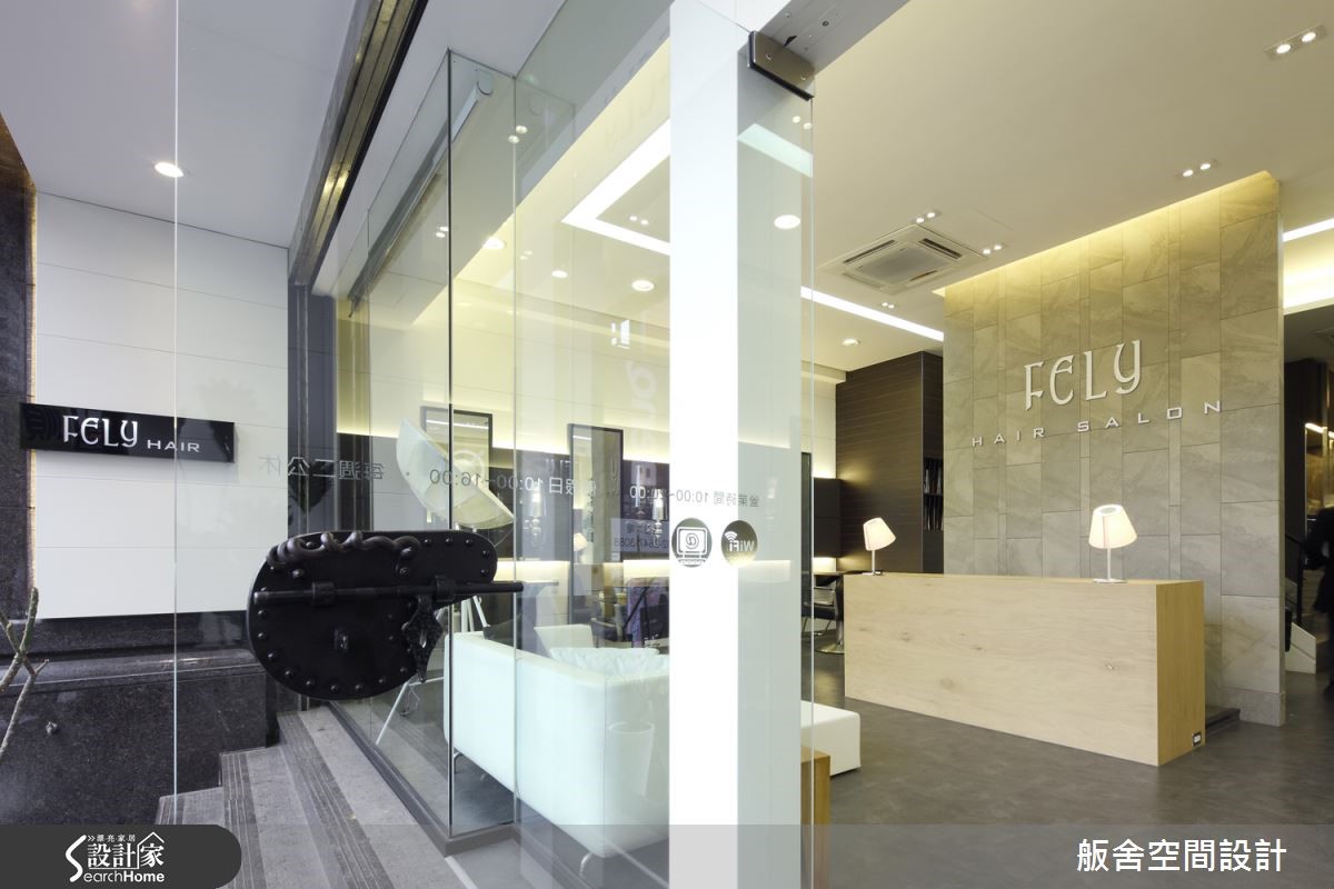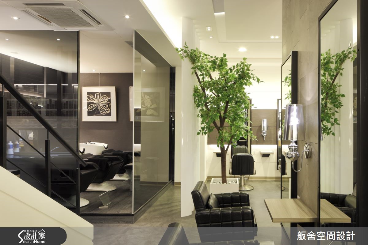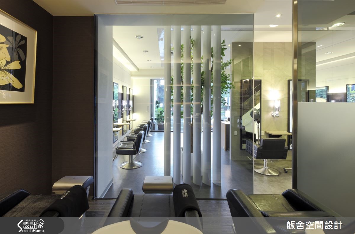 89平方米的发廊空间,整体以轻浅色调提升视觉广度,将楼板采高挑规划,并善用材质、格局营造视野通透感,打造大尺度风范,无论是形式上的发型,又或者是空间视觉的体验,皆带给顾客简约不失格调的生活美学! 【大器板岩隔断,打造醒目景象】店面以清玻璃为门片,形成延伸且通透的视野,内部空间则以深色意大利板岩砖铺陈地坪,并加入间接光源形成天花板框架,营造沉稳却明亮的空间基调;柜台区后方则配置隔断墙,并于墙的表面刻画LOGO字样,搭配灯光透射,形成简约却醒目的墙面风景。【照明设计好纾压,就像在家享受】座位区则配置于空间两侧,于墙面上点缀壁灯,使雅致的居家元素融入商业空间内,注入放松且纾压的感受;冲水区则以玻璃作为隔断,但在通透的隔屏之外,也巧思加入白色格栅元素,让光影、视线可透过穿透的形式,流泻于空间之中。