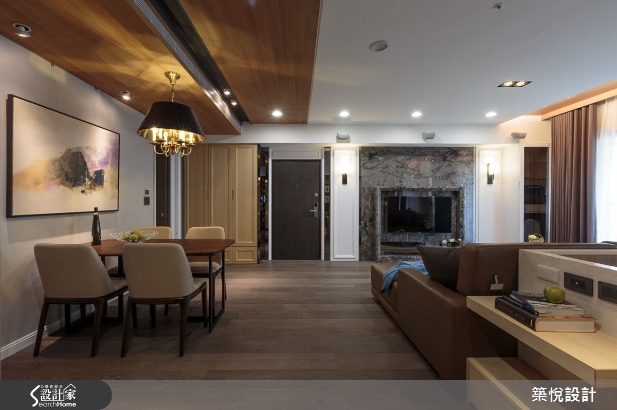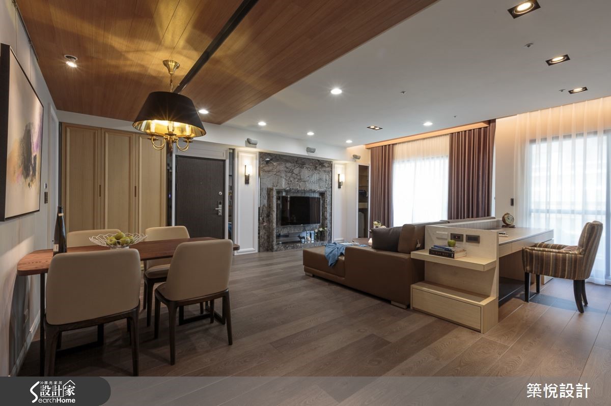 99平方米的新成屋,屋况格局方正且采光佳,但却因原有的木作装潢动线、设计跟材料的选择上不甚理想,未能充分实现对家的梦想与期待。屋主希望在设计师重新规划下,利用动线规划与风格,找回理想的生活格局。【定制线板与大理石打造美式风格】空间以美式风定调,并纳入现代风的简洁,打造出优雅又内敛的居家。客厅电视墙以壁炉为发想,左右两边的造型墙面,采客制化定制线板,并以此概念延续至屋内的各扇门片,引导出细腻专属的精品气息,再搭配大理石墙,天然的石材纹理之美,流泄出低调奢华的情致。【造型天花板设计无形划分场域】为提升公共空间的开阔感,设计师将客厅、书房与餐厅,以开放式的空间规划来做安排,利用造型天花分隔出客厅、书房与餐厅两大空间,餐厅的天花选择木质建材,搭配造型吊灯,温暖的灯光与木色的温润相辅相成,烘托出温馨和乐的用餐情境。