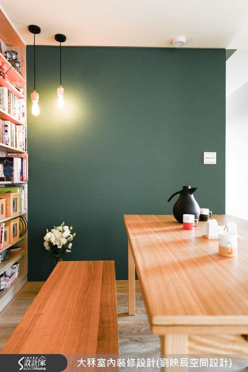 132平方米的空间虽然格局方正,屋龄却为中古屋,加上想要保留原有的厨具,不过因厨具配色较重,与屋主期待的清新北欧风易形成冲突,针对这样的困境,设计师要如何因应,打造出符合期待的居宅。【善用建材,营造清新空间气息】设计师利用相同建材,统一公共空间的风格属性,采用温润的木质地板和文化石墙,带出空间暖度,再将餐厅区的主墙,以墨绿色的黑板墙做为色彩的过渡区,巧妙将深色厨具的视觉冲突感降低。而黑板墙搭配上木质餐桌椅以及整面的书柜墙,让餐厅也能变身书房,融合多元的使用机能。主卧区则舍弃繁复的设计,以舒适为主要要求,简约的床头背墙,选用美耐板整合更衣间的门片,让空间显得更大方利落,创造出优质舒眠的住卧空间。