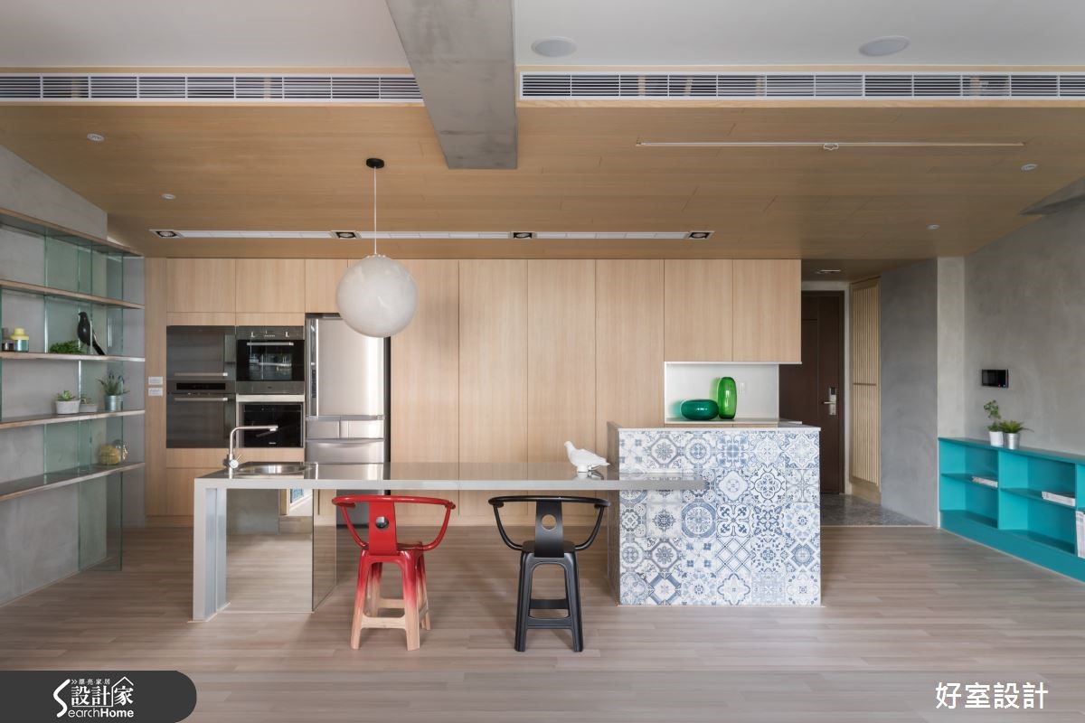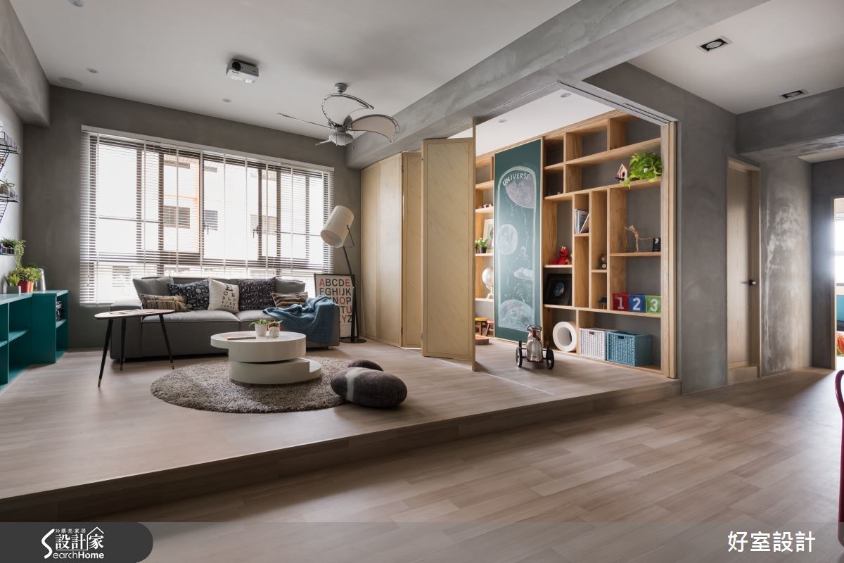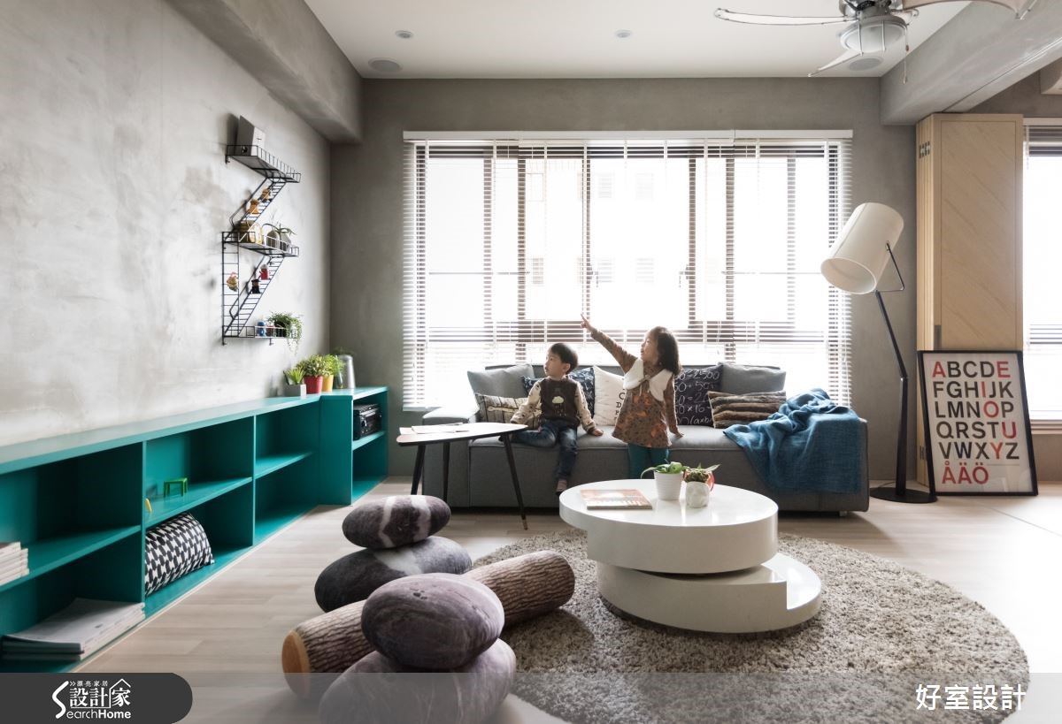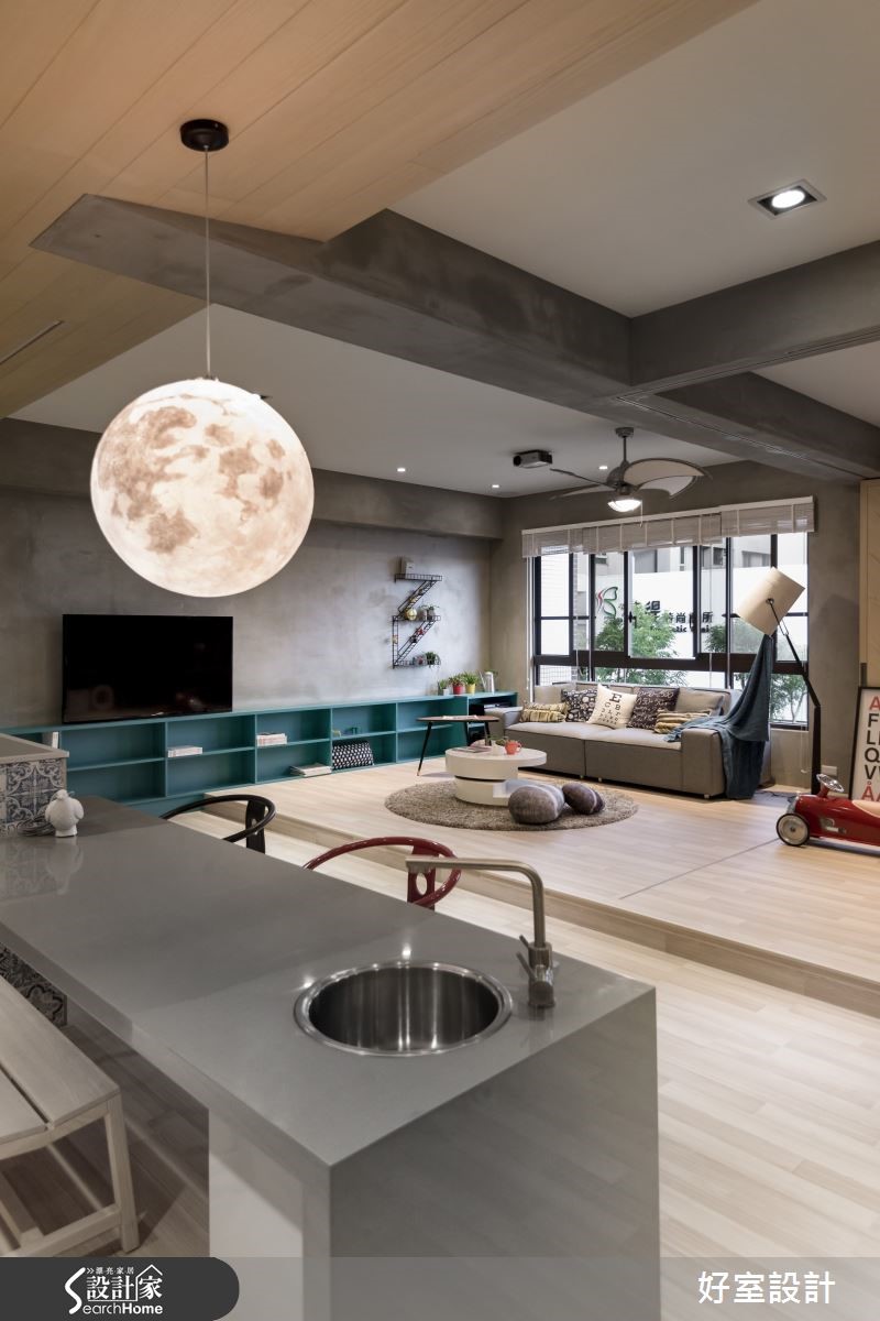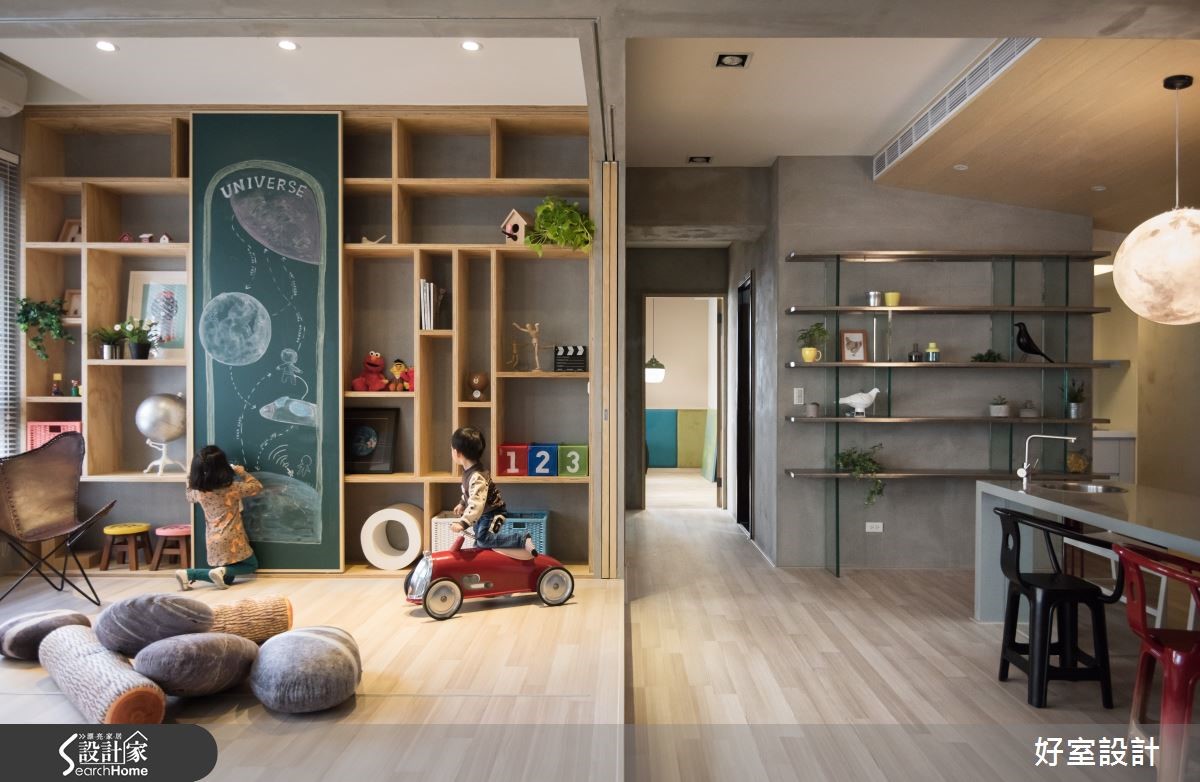 总是期盼让孩子可以在家里开心奔跑,拥有宽敞又舒适的成长空间吗?今天的案例是105平方米的空间里,拥有2室2厅的格局,并经由设计师的设计巧思下,运用清新感的北欧风,混搭上Loft的率性时髦感,成就出一家四口和乐融融的空间。【耐磨地板,让孩子尽情奔跑】开放式的客餐空间,充分实现屋主所企盼的开阔感,地面铺设超耐磨地板,让小朋友可以开心赤脚奔跑。垫高的地面空间,巧妙区隔出客厅与餐厅,沉稳的灰质电视背墙,利用墙上造型收纳小物,创造出具有童心的可爱感。为让空间能充分收纳,设计师设计一整排蓝色低矮柜体来因应,也可训练小朋友帮忙整理收纳的好习惯。设计师也帮小朋友安排了游戏室,只要将客厅与游戏室的推拉门拉起,就是两大独立空间,藉由推拉门的设计,更可弹性调整公共空间的运用性。 【复古彩砖,餐厅简约又优雅】餐厅空间的天花选用木质建材,使空间更具有整体感,也有扩容效果,再搭配西班牙复古彩绘砖的造型吧台,以及月球吊灯带来的想象情境,让餐厅简约中又不失优雅。考虑到动线与安全,将冰箱这类大型家电内嵌于墙面,也可避免小朋友碰撞受伤。主卧空间选用多色绷布色块搭配,再带入绿意与家饰,更使空间具有度假悠闲的舒适感。此外,再依据格局的特性,为屋主夫妻打造独立又时尚的更衣室,充分将屋主一家四口的各自愿望,落实于案例空间之中。