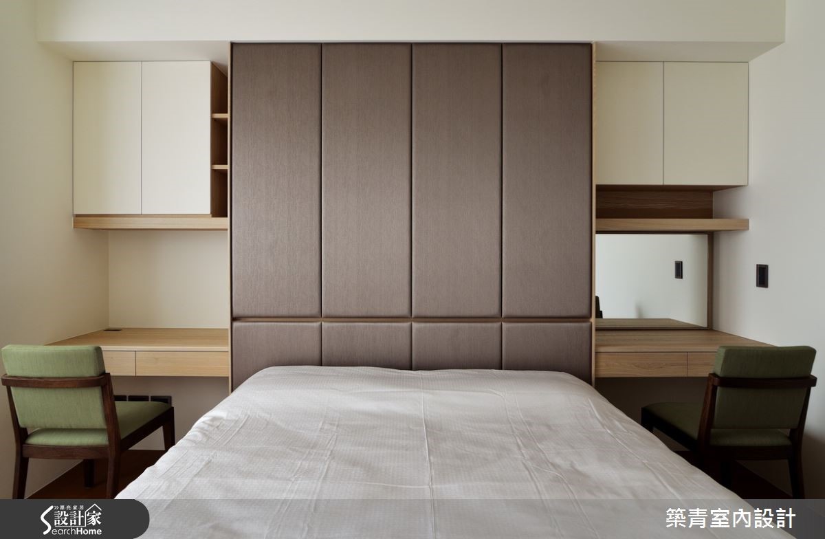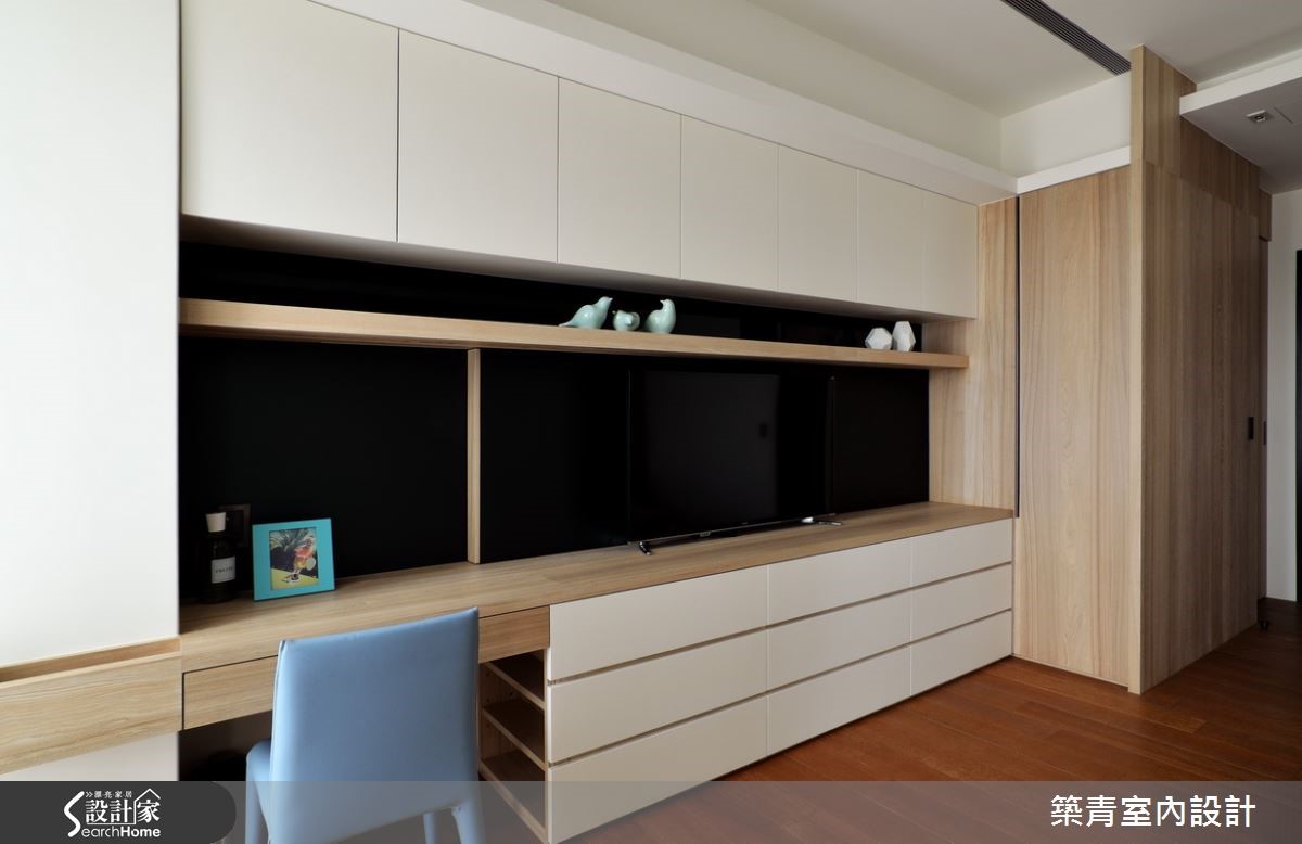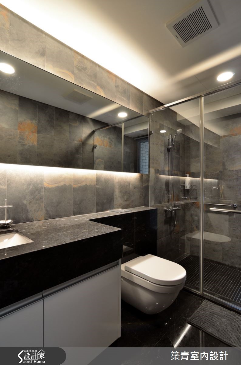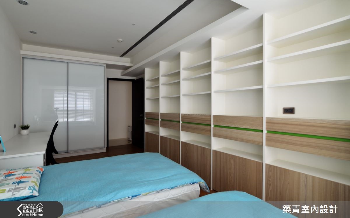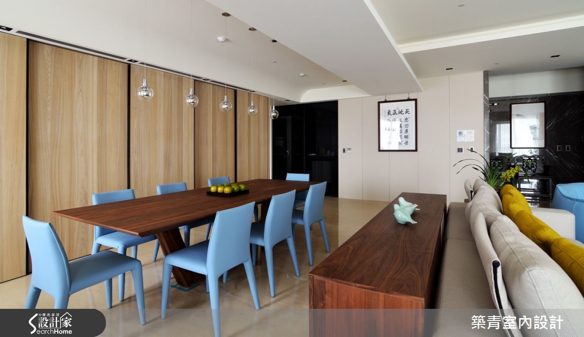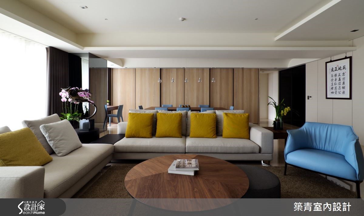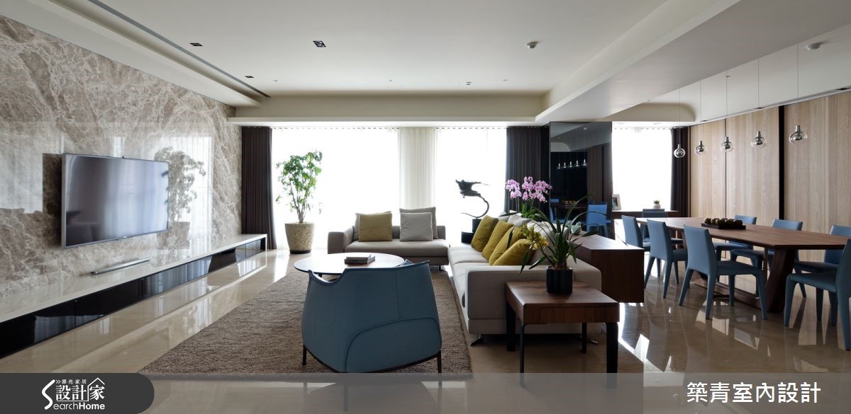 331平方米的宽敞格局,要如何展现空间之美?并满足这七口之家不同成员的喜好与期待?设计师在了解屋主一家的居住需求后,以现代风为主轴,建构出带有大器韵致的气派美豪宅! 【藉玻璃与石材,强化空间气势】玄关衣帽间选用灰镜作为门片,不仅可当穿衣镜,也有放大视觉的效果,再搭配石材营造出沉静内敛的入门意象。客厅以简洁线条为主,长达六米的石材电视背墙,突显出一气呵成的流畅,自然的纹理就像是名家所挥毫的写意水墨,映衬出空间的不凡品味。为减轻客、餐空间的量体感与压迫性,特别选择灰镜包覆柱体,利用镜面反射的特质,配合上开放式的客、餐空间设计,使空间更具有通透延伸的辽阔感。家具与家饰软件的选择,以明亮的黄与清爽的蓝来点缀,增添出活泼爽朗的气息。卧房依照屋主与家人的喜好,以量身打造的方式,创造出各自理想中的模样。不论是用绷布床头创造出出低奢的贵气;或以各式柜体满足收纳需求;多变化的空间规划,让屋主一家都满意。