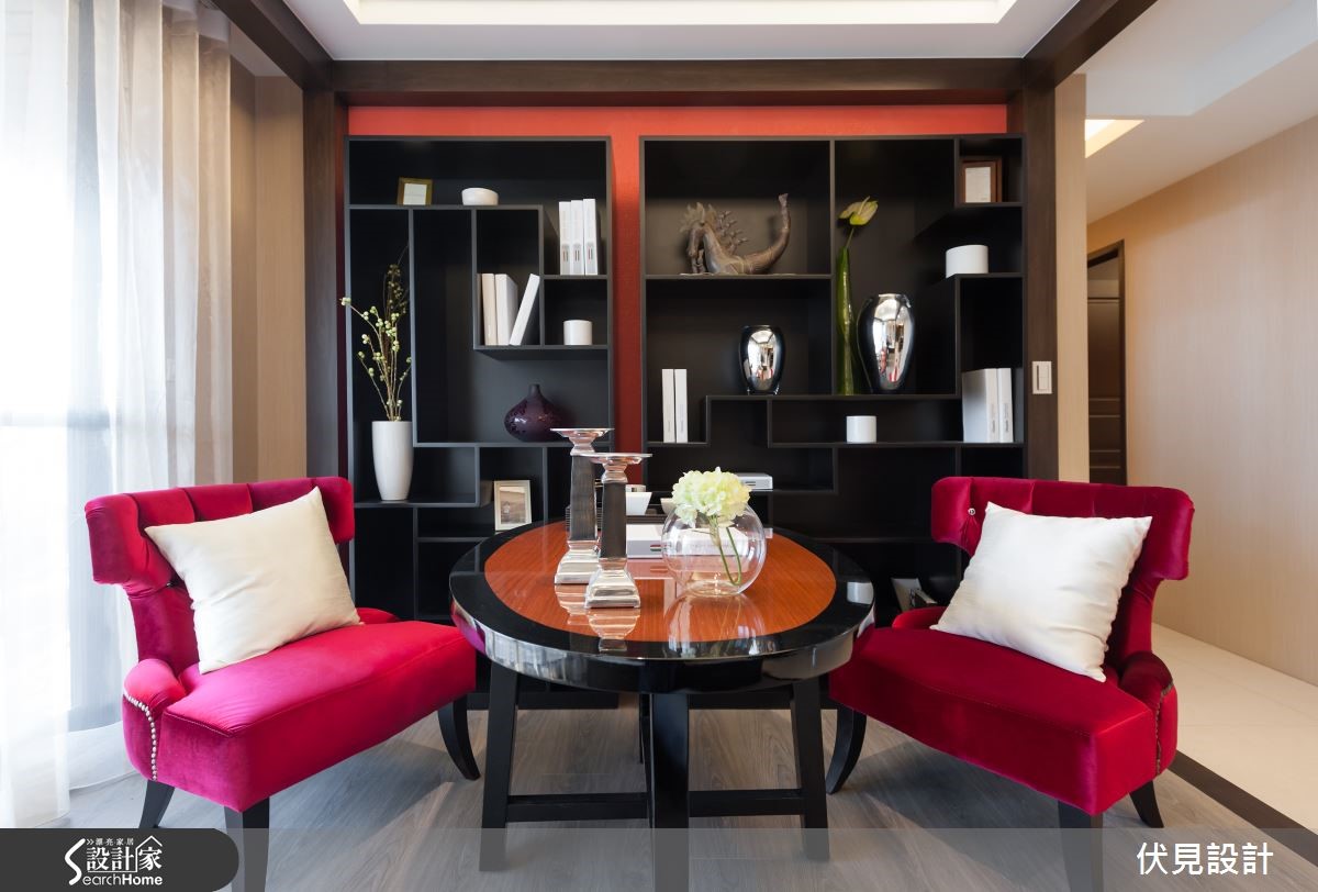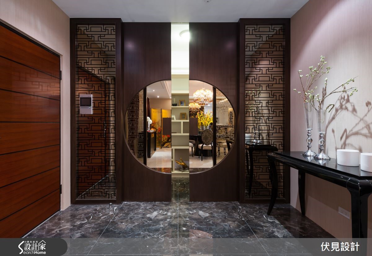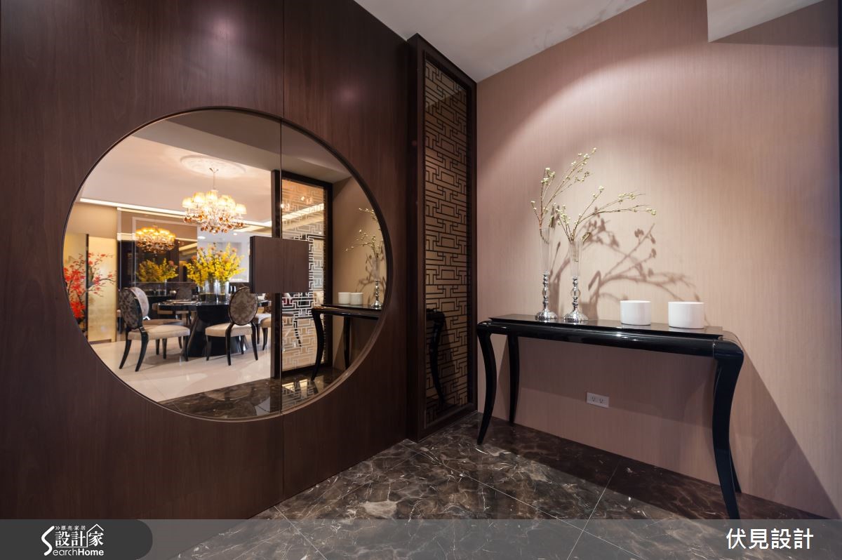 提到东方风,是不是联想到小桥流水与亭阁这类的意象呢?打破大家对于东方风的刻板印象,设计师巧妙运用东方风的元素,为屋主打造出奢华璀璨的东方风华美豪宅! 【以东方圆形贯穿全室】踏进玄关,大理石地砖配上明式家具,圆形造型门片配上一组长型窗花,巧妙地将东方圆满贵气的意境带入家的设计之中。来到客厅空间,大片落地窗,营造出明亮的空间感,利用大理石作为电视柜底座,屋主可陈列各式艺术精品,让客厅空间展现出艺术气质。悬挂的璀璨水晶灯饰,白色的布质沙发与躺椅,配合上黑色圆形茶几,营造出惬意中又深具品味的居家空间。喷砂图腾茶玻的沙发背墙,区隔出客厅与书房空间,让空间带有穿透的美感,极具东方之美的牡丹图腾,也为空间带入华丽的美韵。 图腾茶玻后方的书房空间,设计师在墙面安排了各种不同尺寸规格的展示柜,如同东方常见百宝格,除了可以摆放各类书籍,更能陈列屋主多年的珍品收藏。为了突显书房空间的视觉效果,设计师选择红色座椅,将东方元素中最经典的贵气红带入空间,成为令人瞩目的视觉亮点。餐厅空间,以圆形餐桌与深色图腾布质椅来搭配,上头的圆形雕花与水晶灯饰,点缀出空间的奢华气派,餐厅空间以东方风圆桌为主轴,适度纳入欧风的装饰元素,打造出东西方文化荟萃的融合之美。