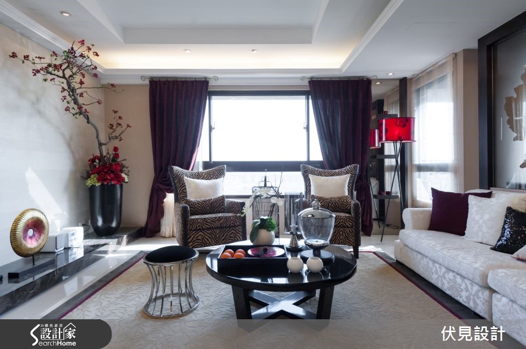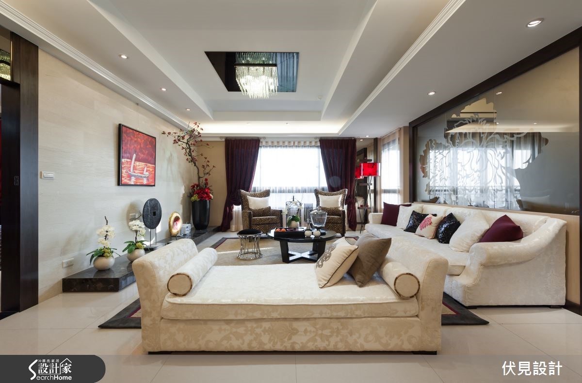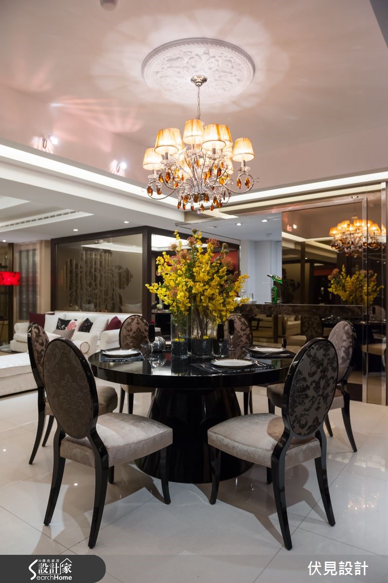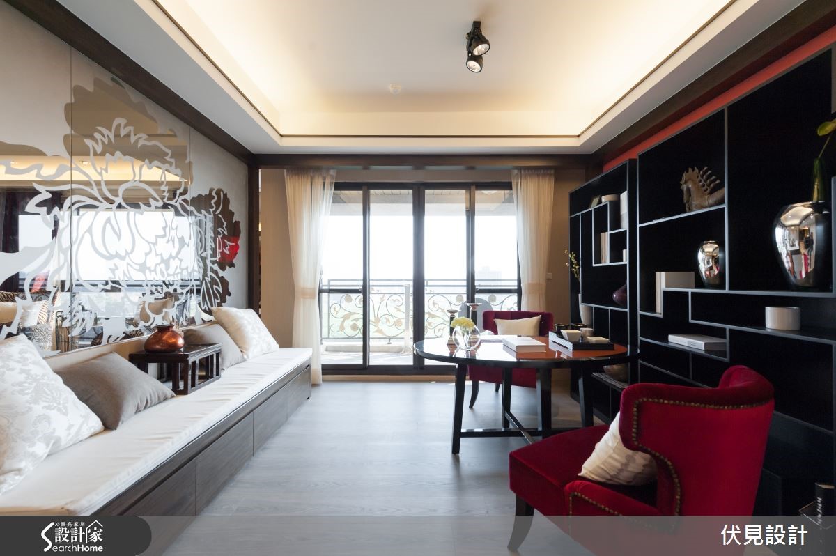 提到东方风,是不是联想到小桥流水与亭阁这类的意象呢?打破大家对于东方风的刻板印象,设计师巧妙运用东方风的元素,为屋主打造出奢华璀璨的东方风华美豪宅! 【以东方圆形贯穿全室】踏进玄关,大理石地砖配上明式家具,圆形造型门片配上一组长型窗花,巧妙地将东方圆满贵气的意境带入家的设计之中。来到客厅空间,大片落地窗,营造出明亮的空间感,利用大理石作为电视柜底座,屋主可陈列各式艺术精品,让客厅空间展现出艺术气质。悬挂的璀璨水晶灯饰,白色的布质沙发与躺椅,配合上黑色圆形茶几,营造出惬意中又深具品味的居家空间。喷砂图腾茶玻的沙发背墙,区隔出客厅与书房空间,让空间带有穿透的美感,极具东方之美的牡丹图腾,也为空间带入华丽的美韵。 图腾茶玻后方的书房空间,设计师在墙面安排了各种不同尺寸规格的展示柜,如同东方常见百宝格,除了可以摆放各类书籍,更能陈列屋主多年的珍品收藏。为了突显书房空间的视觉效果,设计师选择红色座椅,将东方元素中最经典的贵气红带入空间,成为令人瞩目的视觉亮点。餐厅空间,以圆形餐桌与深色图腾布质椅来搭配,上头的圆形雕花与水晶灯饰,点缀出空间的奢华气派,餐厅空间以东方风圆桌为主轴,适度纳入欧风的装饰元素,打造出东西方文化荟萃的融合之美。