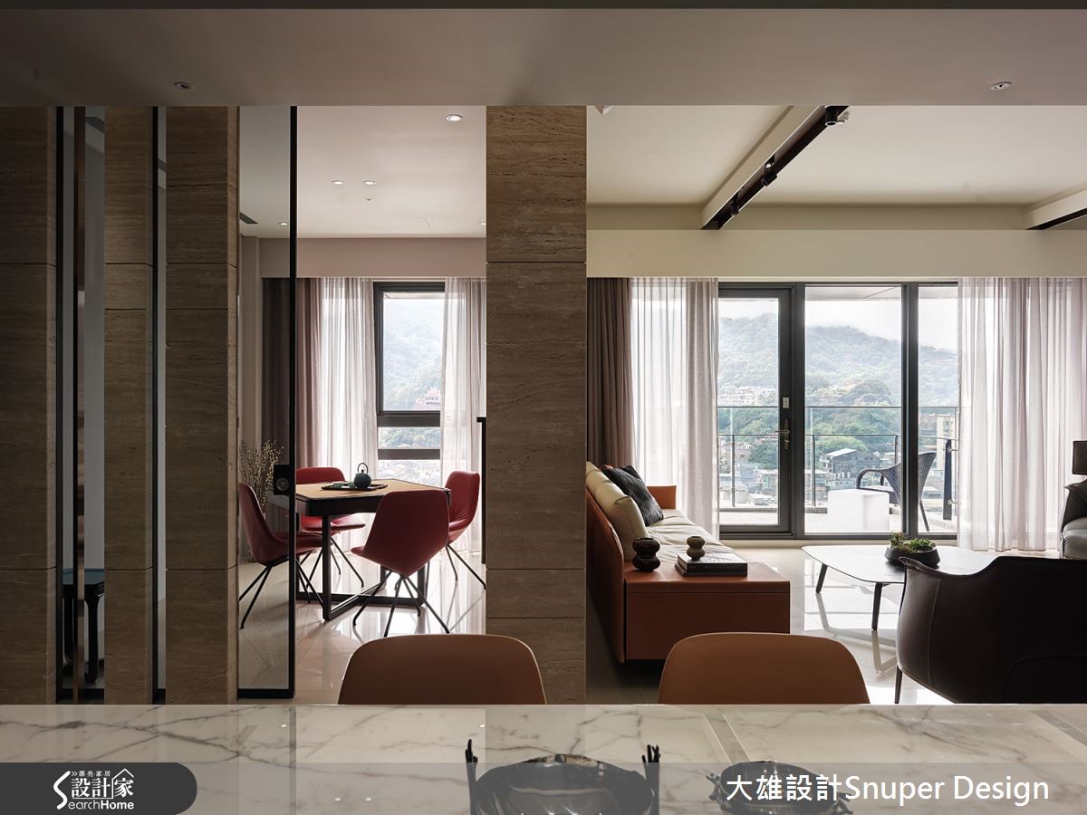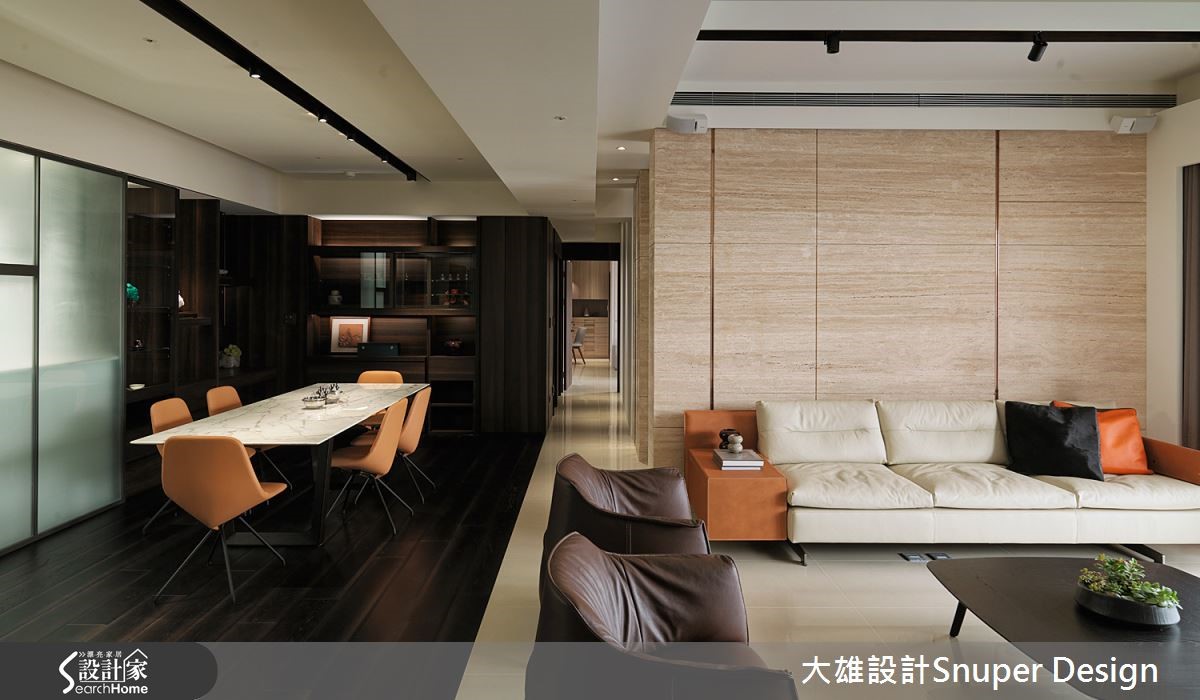 本案为148平方米居宅,设计师替居宅注入日式禅风美感,并让厨房的配置活动拉门,隐藏炉台,型塑简练美感的视觉感,并以地材取代地毯,做出领域分界,在稳重色彩的铺述之下,打造出夫妻二人的简约居家生活!【以木色为主视觉,营造沉稳气氛】从大门进入居宅内,可见玄关处陈列的木作展示端景,打造充满禅风感的宁静意象;延伸进入开放公领域中,则在餐厅铺陈木地坪,区分客厅与餐厅空间,并让餐厅地平连结深色柜体,形成沉稳的用餐气氛,在深浅不同调的地板色块差异之下,达到延伸廊道景深的效果。【独立泡茶区域,建构静谧感受】客厅则配置大片落地窗引进美好采光,并在沙发墙、电视墙加入浅色木作与大理石材质,注入天然气息,以雾面玻璃打造厨房活动拉门,让全室享有流通的居家采光;客厅后方则为独立的泡茶区域,陈列简单的一桌四椅,搭配阳台美好景色,建构出无限静谧的闲适感受。