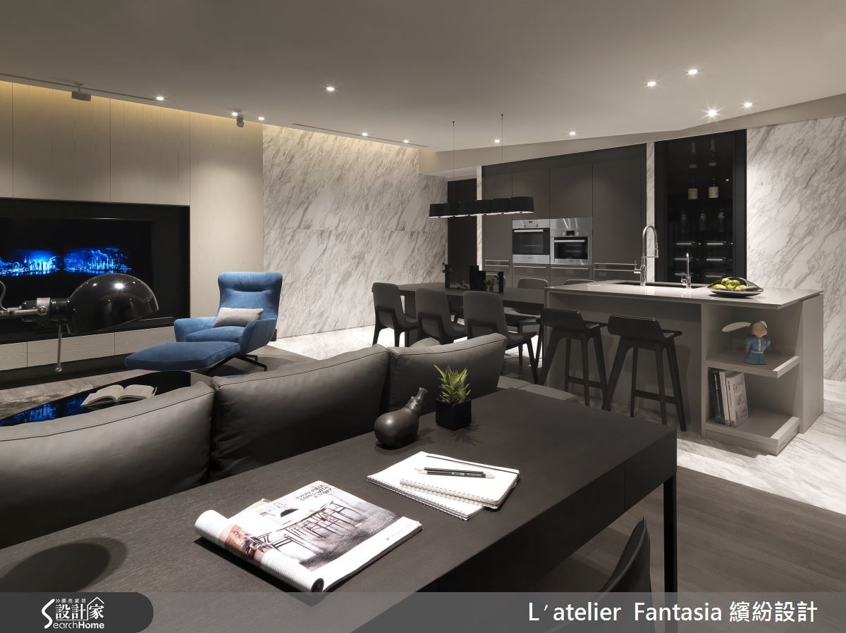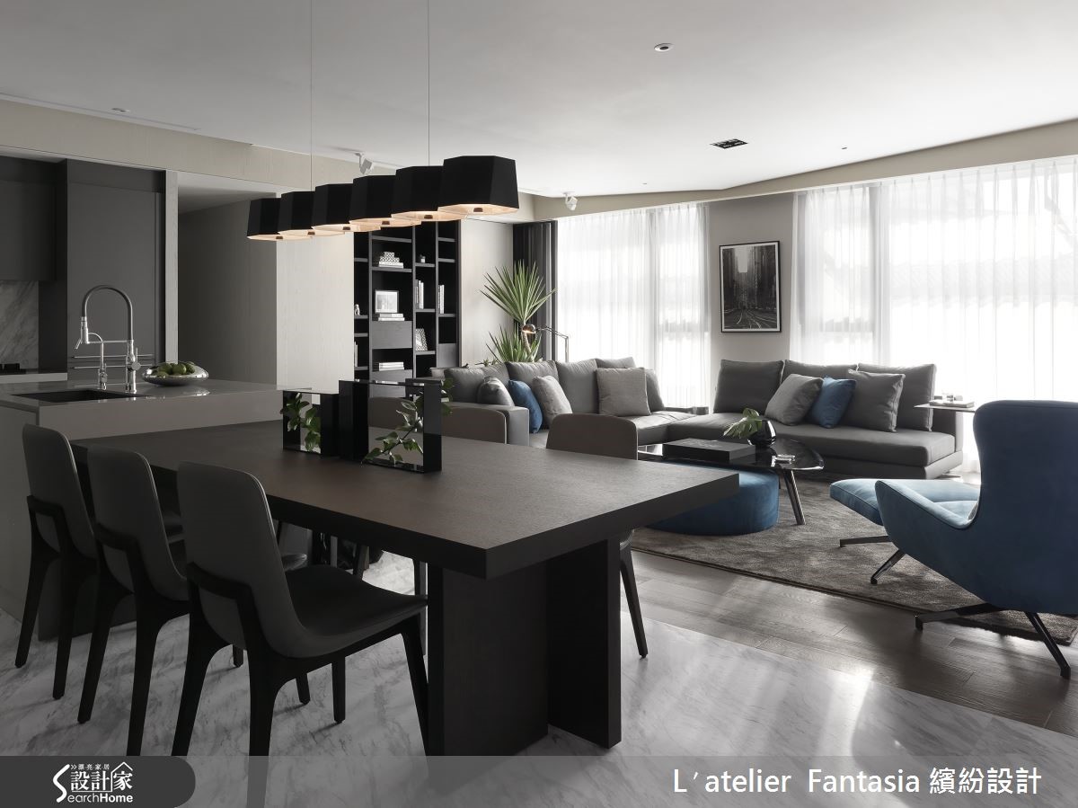 119平方米的现代宅,设计师考虑到屋主的生活背景与个性喜好,替空间注入了黑、灰、白等内敛色彩,并将重点放在较常活动的公领域,保留格局方正的优点,并隐藏横跨客厅的大梁,同时佐以开放式手法,打造出采光良好、深具品味的魅力好宅! 【以色彩搭配和书墙塑造高端品味】走进空间可见宽广的公共领域,感受到采光丰沛的敞朗视野,并于天花作降板隐藏横梁,维持居宅的高度与宽敞,而在大片灰调里,则以蓝色软件点缀,让色彩品味更为提升;客厅后方陈列简单的书桌椅,定义开放式阅读场域,并于墙面做出整面书柜,满足书籍收纳需求。【开放餐厨设计打造完美烹饪体验】餐厨空间则采以开放中岛规划,让客、餐厅可享有无碍良好互动模式,并透过延伸加长的中岛台面,满足多人餐聚的需求,并以进口厨具作为设计蓝图主角,发展出周边的规划设计,在配色美感与尺寸问题的考究下,将厨具设备、空间揉合成协调的画面。