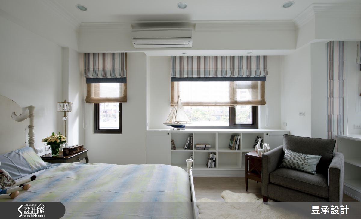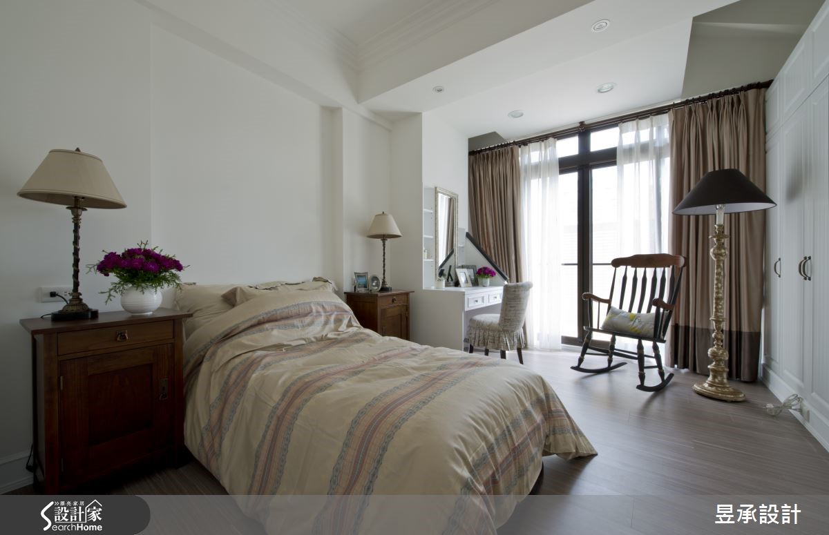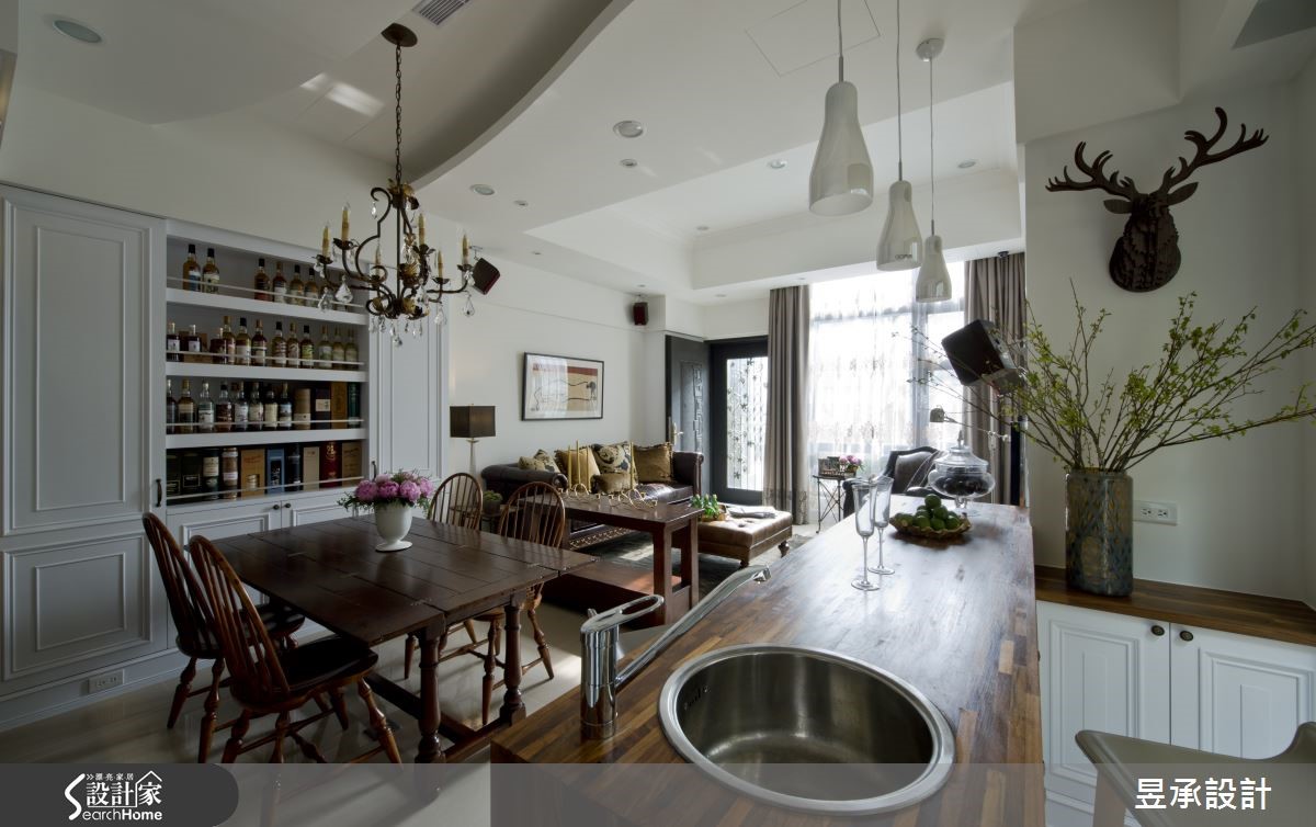 男主人因进口酒商职务往来各国洽公收集许多咖啡杯,将咖啡杯陈列柜变成开门端景,营造像洛克菲勒庄园般的艺术氛围,也似展示着每一段特殊的异国回忆。 【爬梯及壁炉书柜,型塑藏书室印象】设计师将经典美式风格完美融入原本的毛胚屋结构中;包括大面积窗景、壁炉以及各式木料建材,佐以皮件家具,充满60年代美式经典风格。玄关、客厅、餐厅以及吧台采开放式动线,使阳光与新鲜空气无遮蔽死角,增添屋内蓬勃气息。巧妙的利用壁炉上方空间规划成展示书柜,更以爬梯画龙点睛,将庄园藏书室气息带入设计空间当中。书柜与藏酒柜相映,也呼应了男主人的专业领域。三间卧室分别呈现不同风格,主卧采用四柱双人床与菱形墙面,流露轻奢华丽的气息,且主卧浴室有桧木浴缸,增添舒适洗浴氛围。小孩房天花板镶嵌着迪士尼人物照明,搭配纯白圆柜,去除锐角,加强安全性。而长辈房则以米色基调营造柔和优雅。