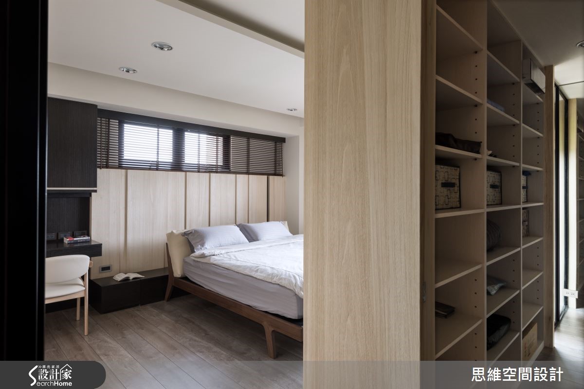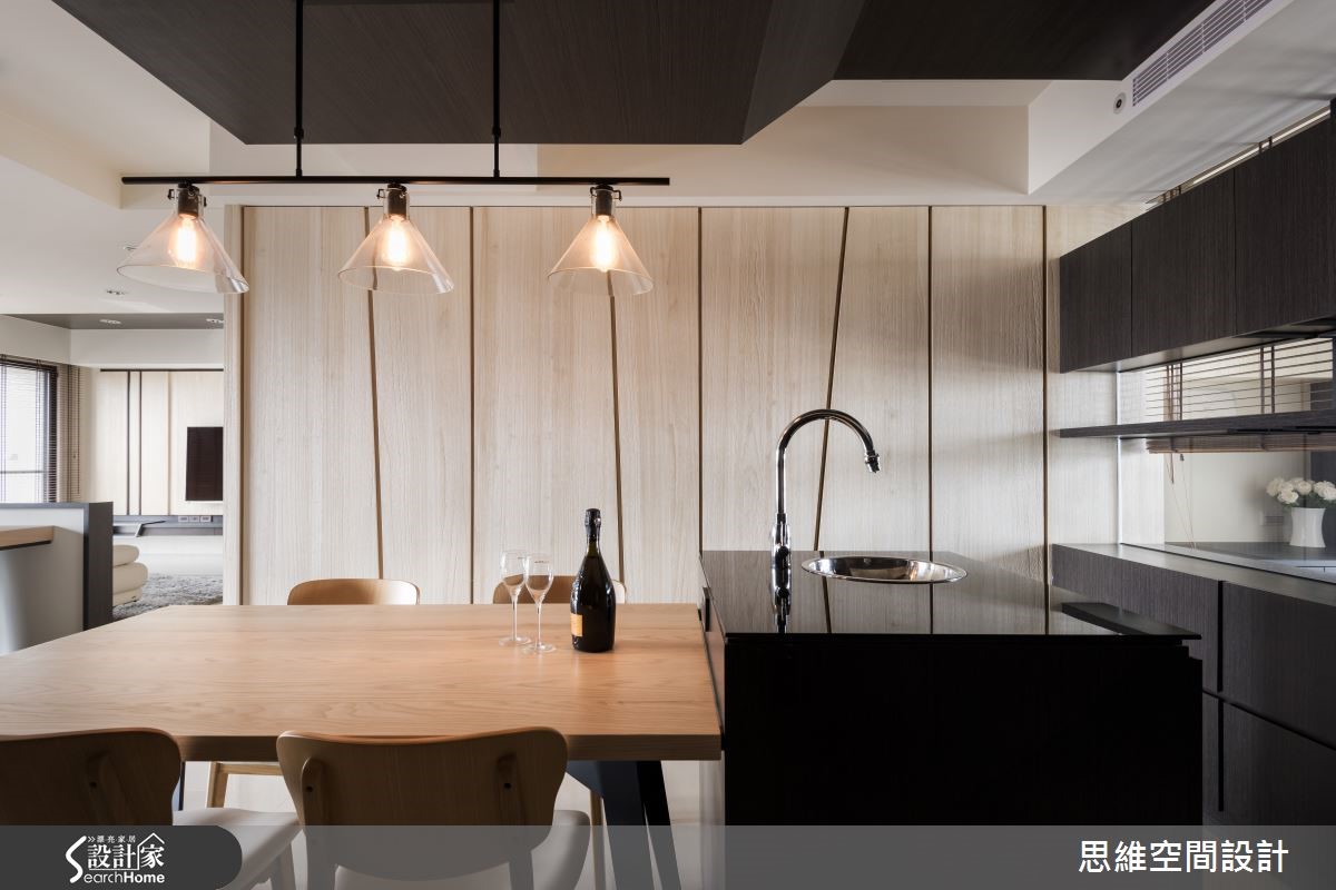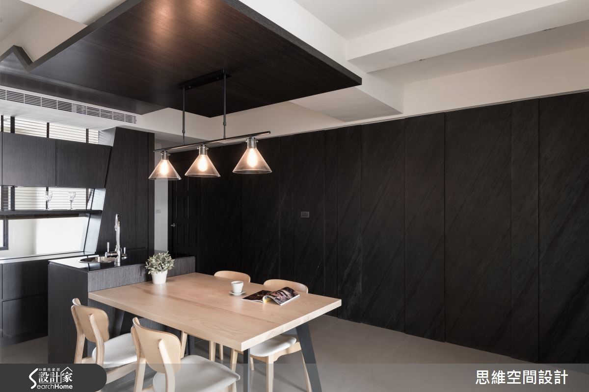 利落的线条与不假修饰的风格,一直都是现代居家典型的设计方向。设计师此次将各式木质材料搭配石面地板进行装修,不仅降低了过于冰冷生硬的可能性,更增添了如同身处森林般明亮温馨的氛围。 【墨黑石与浅色木质,造强烈对比】屋内的公共空间以开放方式呈现,较为特殊的是,设计师将书房纳进公共空间并紧邻餐厅。书柜运用错落的隔板设计,让收纳有更多选择。柜体采用墨色调和沉稳的气质,并利用大面积采光在窗边设置飘窗,多出一米休憩空间,享受阅读乐趣。餐厅以墨黑石材作为主要墙面,利用其立面的高低落差,使其中一道门片巧妙隐藏厨房空间,机能性十足。对面的浅色木柜,除有着大量收纳的功能外,更以不规则几何图形体现了现代居家风格。卧房与主卧更衣间皆以浅色系木柜与家具打造,使休憩空间充满惬意舒适的氛围。客卧仅用整面的木柜作为隔断,形成半开放的空间,适度遮掩隐私又能引入光线,营造出开阔明亮的氛围,令人眼睛为之一亮。