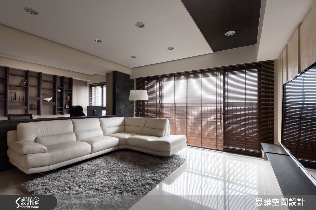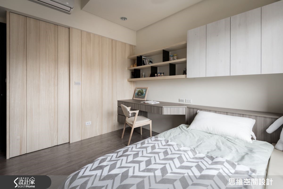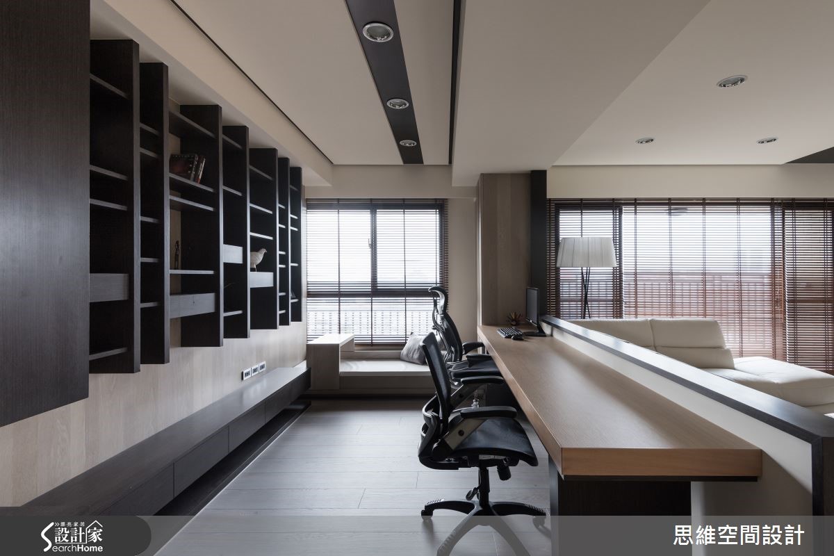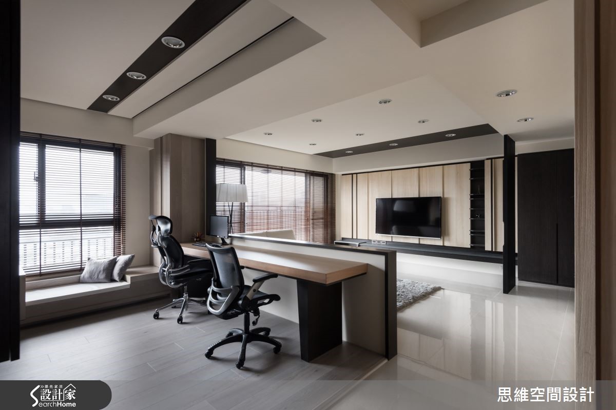 利落的线条与不假修饰的风格,一直都是现代居家典型的设计方向。设计师此次将各式木质材料搭配石面地板进行装修,不仅降低了过于冰冷生硬的可能性,更增添了如同身处森林般明亮温馨的氛围。 【墨黑石与浅色木质,造强烈对比】屋内的公共空间以开放方式呈现,较为特殊的是,设计师将书房纳进公共空间并紧邻餐厅。书柜运用错落的隔板设计,让收纳有更多选择。柜体采用墨色调和沉稳的气质,并利用大面积采光在窗边设置飘窗,多出一米休憩空间,享受阅读乐趣。餐厅以墨黑石材作为主要墙面,利用其立面的高低落差,使其中一道门片巧妙隐藏厨房空间,机能性十足。对面的浅色木柜,除有着大量收纳的功能外,更以不规则几何图形体现了现代居家风格。卧房与主卧更衣间皆以浅色系木柜与家具打造,使休憩空间充满惬意舒适的氛围。客卧仅用整面的木柜作为隔断,形成半开放的空间,适度遮掩隐私又能引入光线,营造出开阔明亮的氛围,令人眼睛为之一亮。
