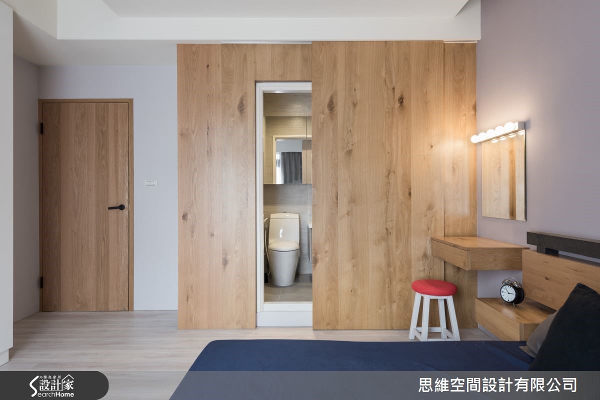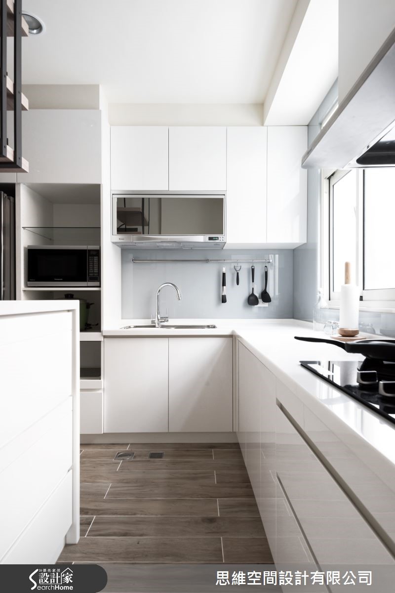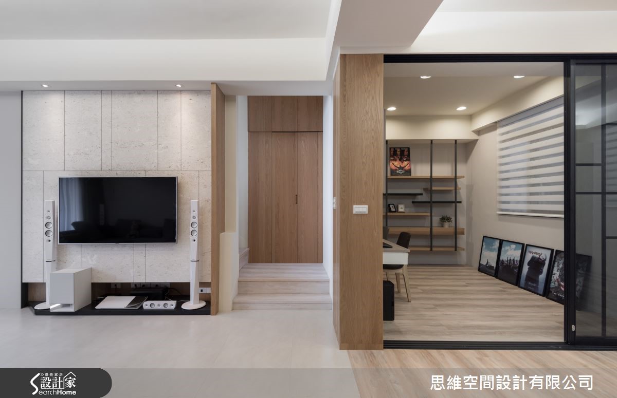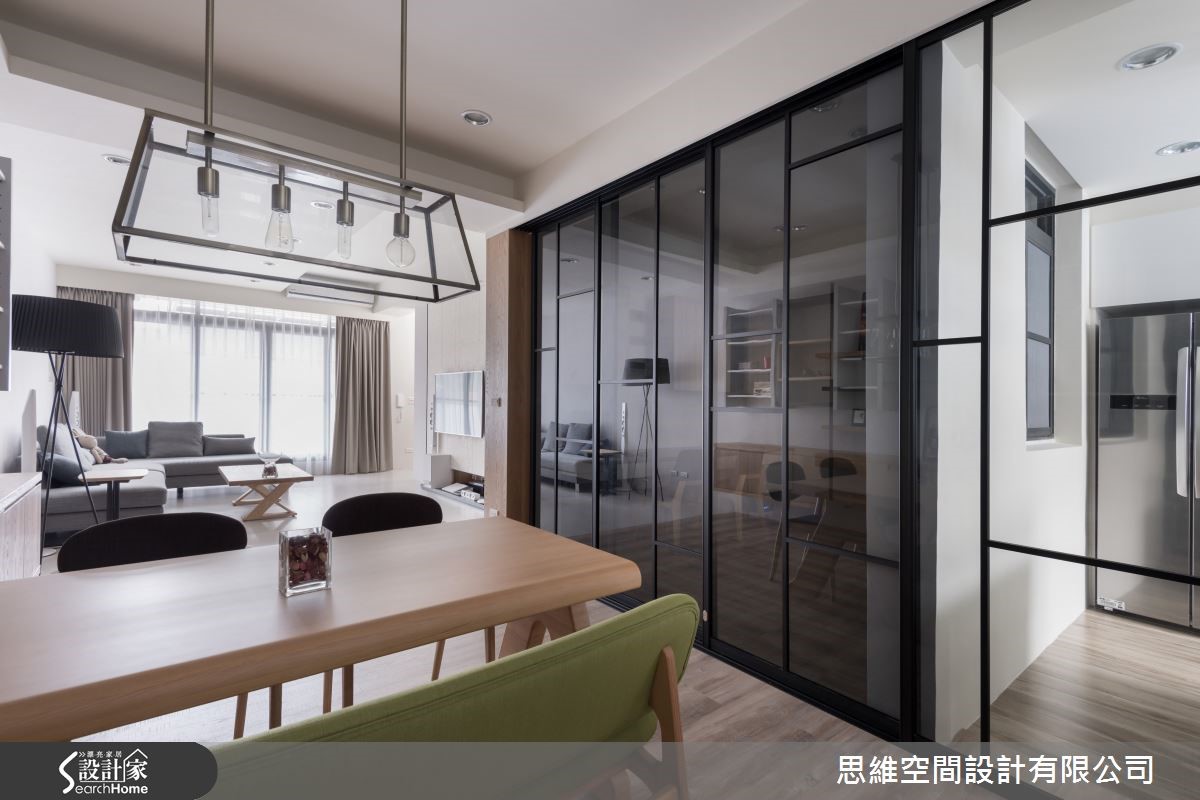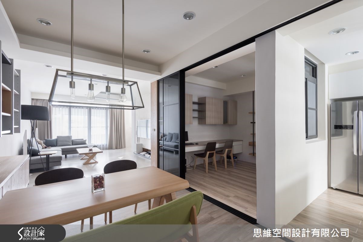 屋龄30年的独栋楼,原本屋况不佳,过小的窗户使客厅光线不足,整体空间显得昏暗。经过设计师巧手翻修后,将原本的小窗户改成整面的落地窗,迎进自然光源,并以简约风的手法重新规划,室内变得明亮又清爽。 【推拉门设计,空间更有弹性】一楼平时为主要生活的空间,设计师以大片落地窗将室外光源引入,并重新安排隔断,辅以纯白色墙面及浅色木质家具,提升客厅的明亮度。阳光自由流淌在室内每个角落,营造出令人放松的居家氛围。位于中央的书房则在墙面开窗引光,避免过于阴暗。相邻的厨房则以纯白色系重新调整厨房柜体,并加设中岛,让主人在做菜时能有更多使用空间。有趣的是,书房与厨房共用玻璃推拉门设计,当在烹饪时就能随时拉起,形成封闭空间,油烟不外逸,也能维持明亮采光。沿着楼梯走上二楼则是主卧室及客房,打开房门,设计师将卫浴的门与木质墙面设计结合,巧妙地隐藏卫浴空间与整体设计的突兀感,浅色系的木质墙面也使整个空间看起来更加舒适。