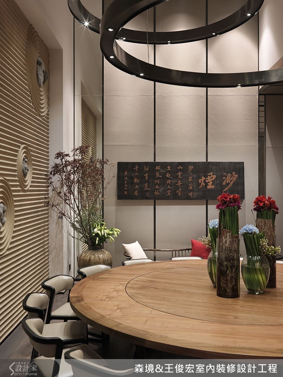 中式风格的经典家具,非属圆桌不可。想让传统圆桌也能呈现时尚贵气,透过弧形灯饰相互映衬,动感的流线造型能吸人眼球,再加上壁面如枯山水般的圆形装饰也与之呼应。东西文化之美透过有形的圆,融合为一。