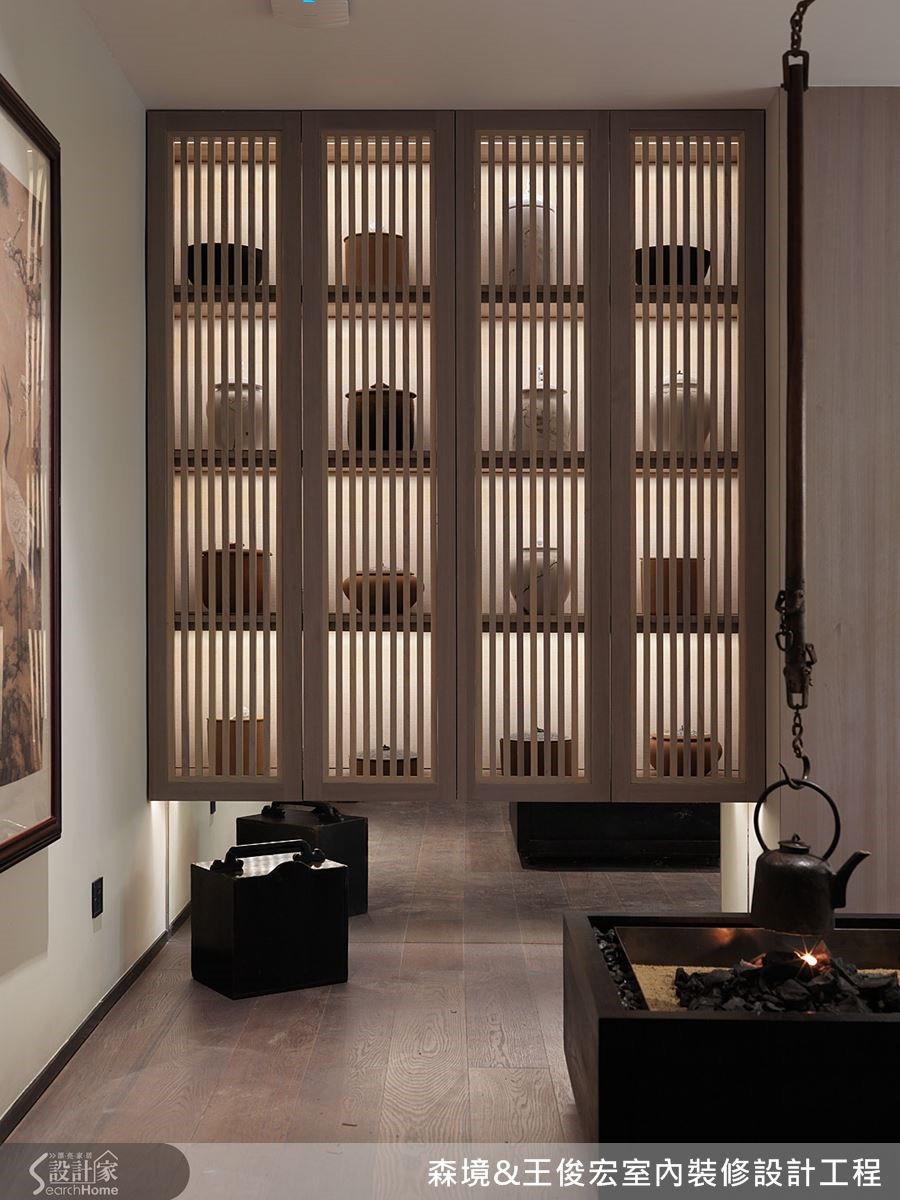 善用柜门和光影营造温暖的中式情境,一旁则有复古茶具和山水墨画相伴,再加上融入日式炉灶的设计,创造众人围炉的气氛。不论是设宴畅饮或三五知交相聚品茗,皆能达到宾主尽欢的目的。