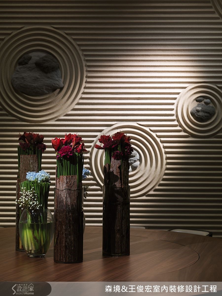 不论是沙发一隅的铁艺装饰,亦或是壁面的大幅水墨挂画,甚至墙上现场挥洒如枯山水的艺术壁饰。在在凸显艺术家充满手感的演出,同时也为空间注入人文气息,呈现优雅品味。