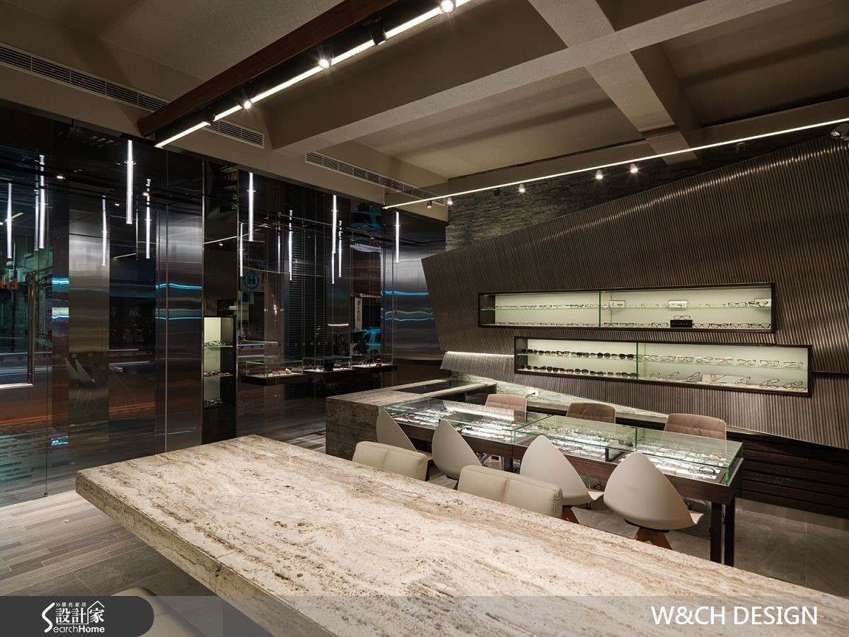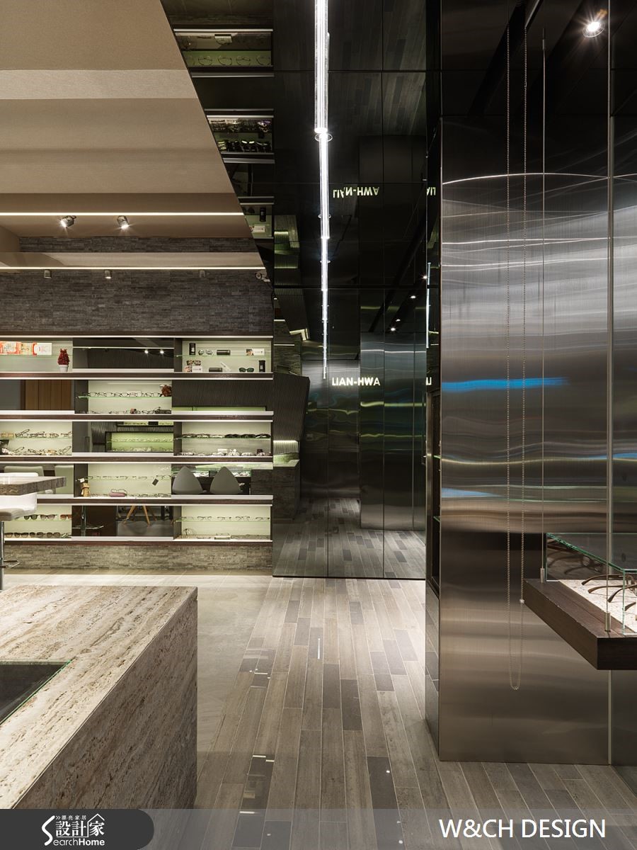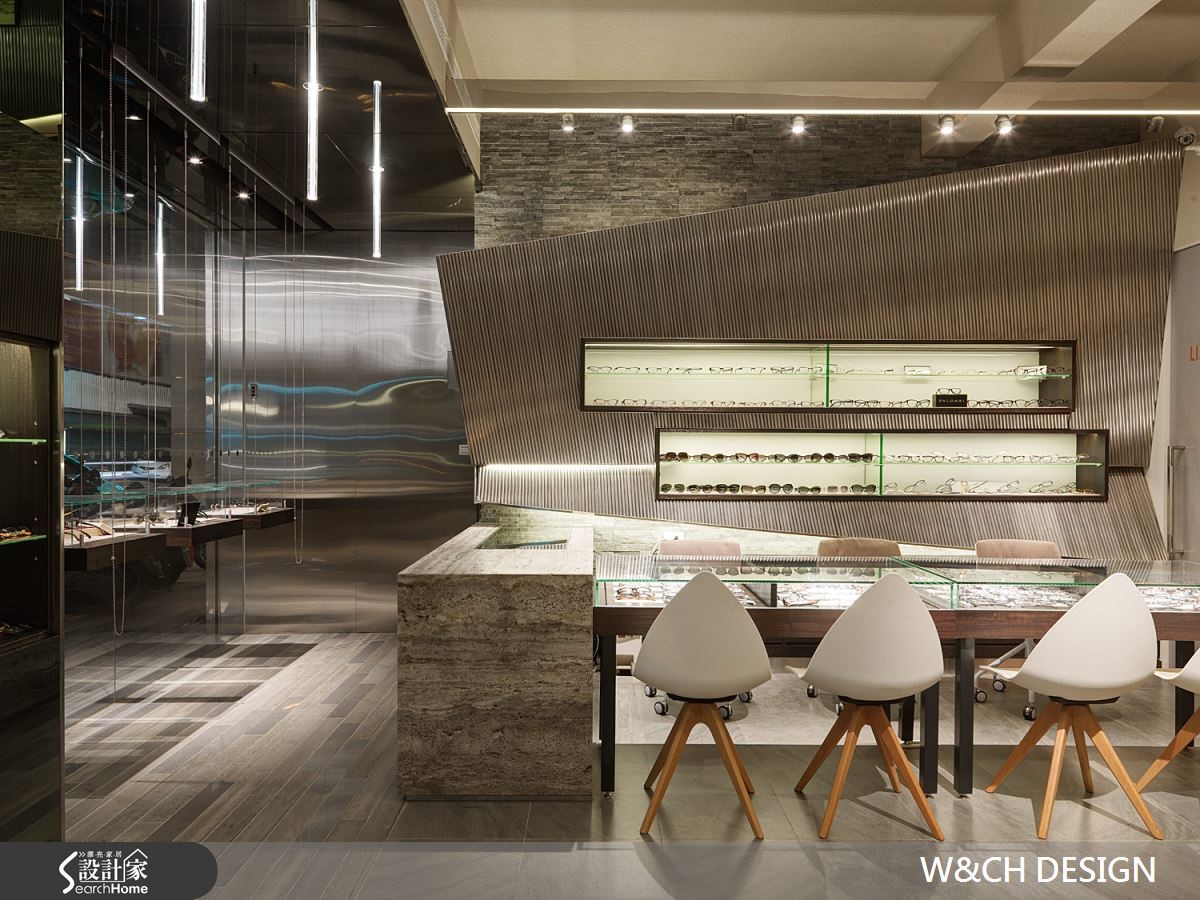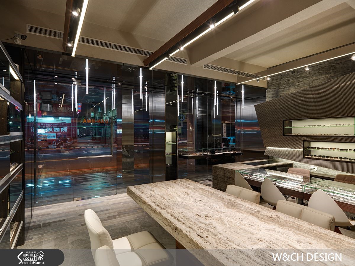走进82平方米的店面,彷佛置身科幻电影场景之中的宇宙飞船中,若不经提醒,根本无法猜到这户前卫的空间是一间眼镜行。设计师以充满创意的设计方式让灯管悬吊在骑楼及屋内外侧天花板,隔着玻璃相互呼应,制造了无限延伸的空间感。【不锈钢搭配光影,造出科幻感】由外而内大面积的落地玻璃,使得整间店内明亮灯光得以穿透玻璃,店内布置一览无遗。除了有着开放的亲近感,更达到吸睛引客的目的。另一亮点则为三片厚实的不锈钢材,与玻璃垂直延伸至店内与柜台,使整体空间有扩容效果。店内地板及桌椅皆以浅色材质作为装潢主轴,综合了不锈钢坚硬的形象。橱窗、柜台与展示等区域,能在窄小空间中具备多种机能却不显拥挤。设计师更善用巧思,将不锈钢柜台由低而高做出拉升角度,在纵与横的线条中更添加了趣味性。