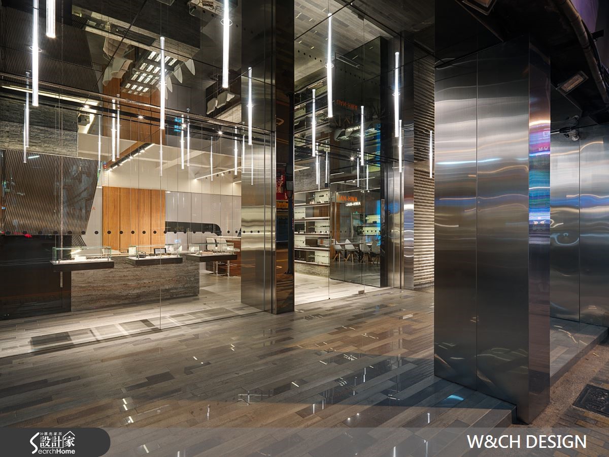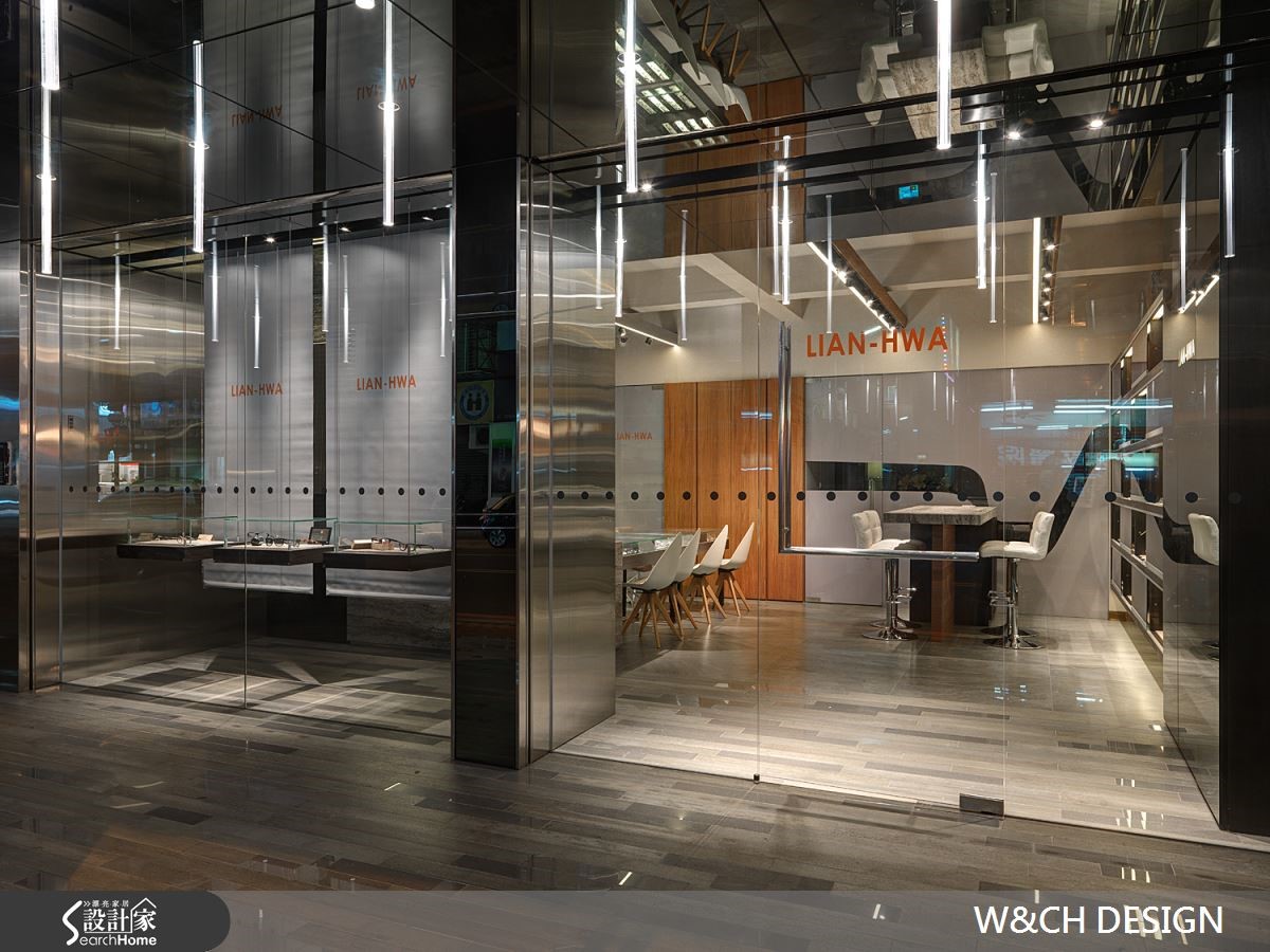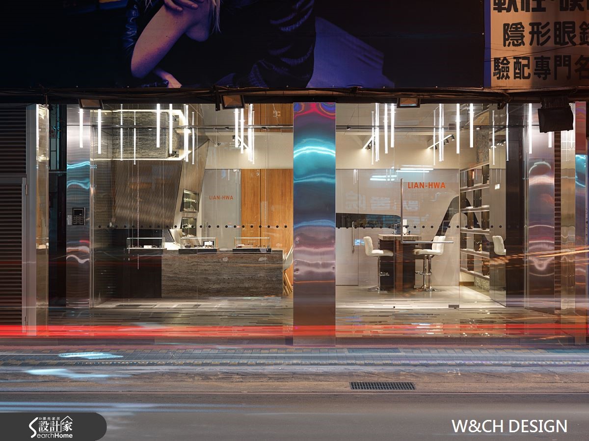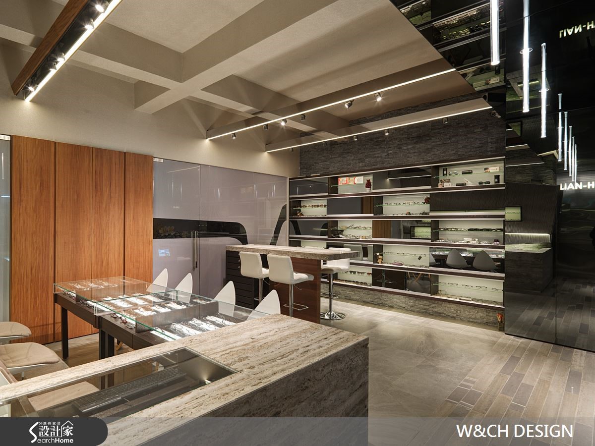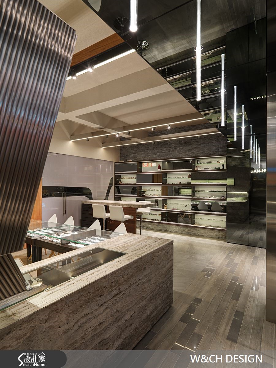 走进82平方米的店面,彷佛置身科幻电影场景之中的宇宙飞船中,若不经提醒,根本无法猜到这户前卫的空间是一间眼镜行。设计师以充满创意的设计方式让灯管悬吊在骑楼及屋内外侧天花板,隔着玻璃相互呼应,制造了无限延伸的空间感。【不锈钢搭配光影,造出科幻感】由外而内大面积的落地玻璃,使得整间店内明亮灯光得以穿透玻璃,店内布置一览无遗。除了有着开放的亲近感,更达到吸睛引客的目的。另一亮点则为三片厚实的不锈钢材,与玻璃垂直延伸至店内与柜台,使整体空间有扩容效果。店内地板及桌椅皆以浅色材质作为装潢主轴,综合了不锈钢坚硬的形象。橱窗、柜台与展示等区域,能在窄小空间中具备多种机能却不显拥挤。设计师更善用巧思,将不锈钢柜台由低而高做出拉升角度,在纵与横的线条中更添加了趣味性。