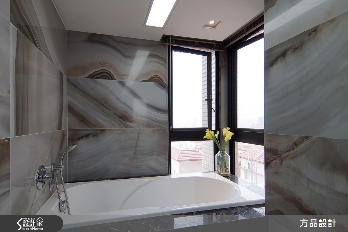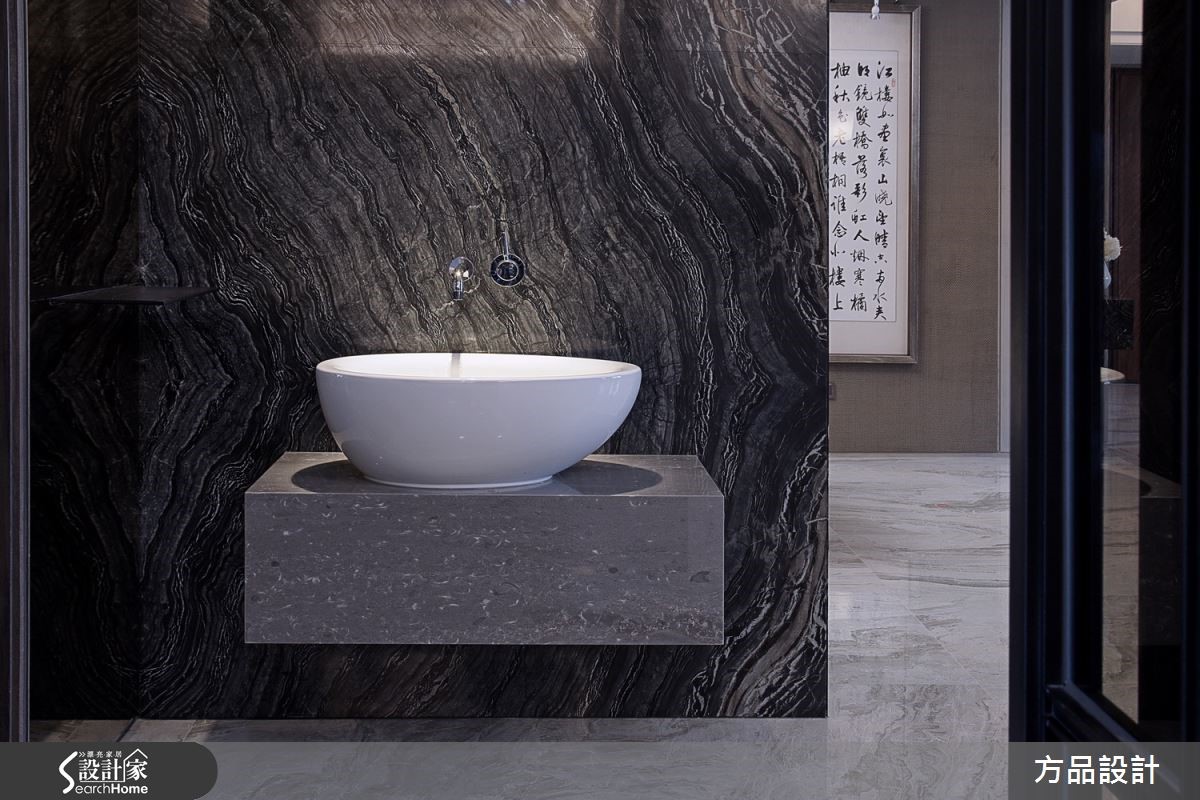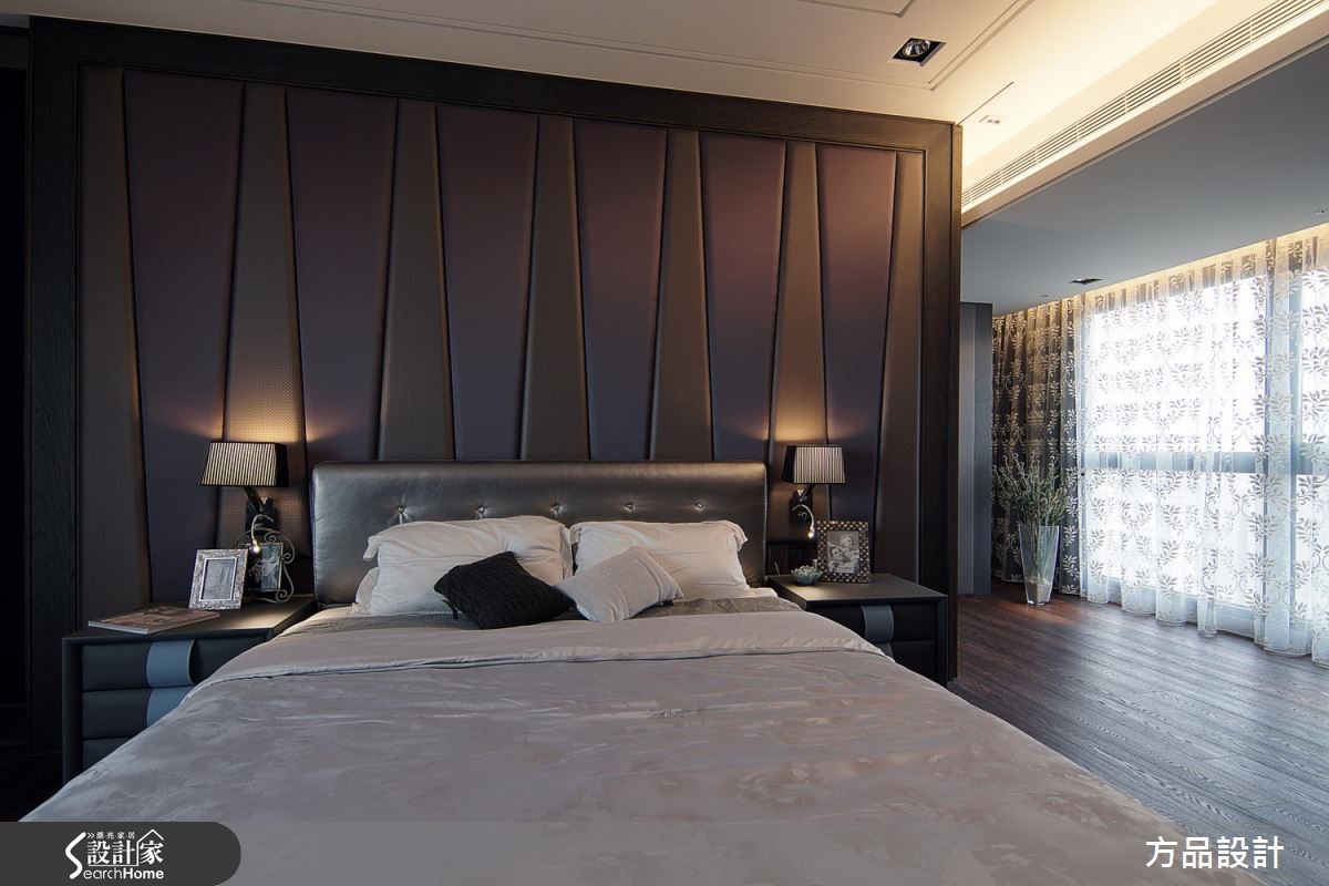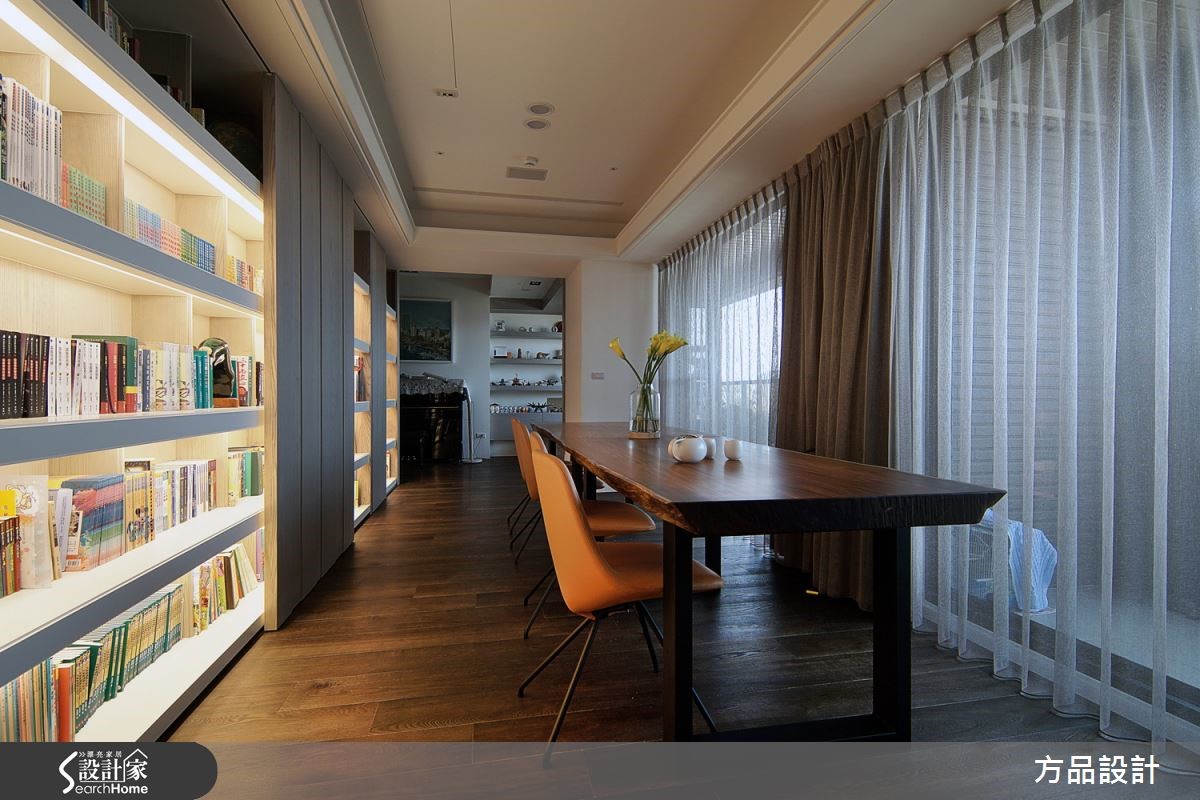 以茶玻、天然石材、铁件打造的298平方米4室大宅,为营造恢宏格局,在房屋中心位置砌上一片白色的电视墙,并刻意不做满保留辽阔视野。摆上一张U字型的深色皮革沙发,环拥整个客厅空间,从容擘划大器质感。【天花向上延伸,造高挑大器】电视墙后方是用餐区,设计师将天花板往上延伸制造层次,并在搭配具时尚感的灯光照明,让光线能够聚焦在整个用餐空间。墙面挂上书法字画,更增添整体空间的人文底蕴与文学涵养。阅读空间以带着纹理的实木长桌直接迎向整片落地窗,让居住者能与外景有更多互动。长桌后方是整面书墙,大面积铺陈不仅消弭了柜体感,也让动线衔接更利落流畅。卧室以深棕色为主色调,利用重色木地板铺陈沉静氛围。另外将卧床上方空间加深,并在主墙面设计延伸至天花板的简约线条,将视觉抽高、消除压迫感,并以整面落地窗带进柔和的自然光线,营造舒适的睡眠环境。