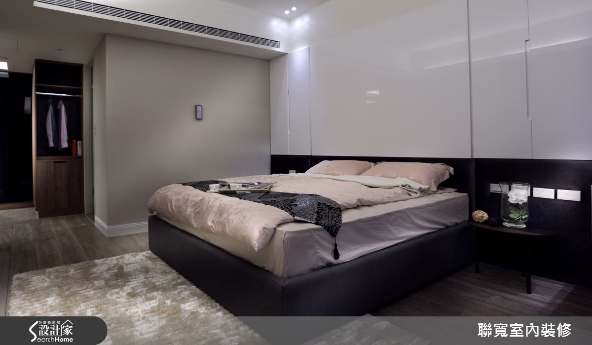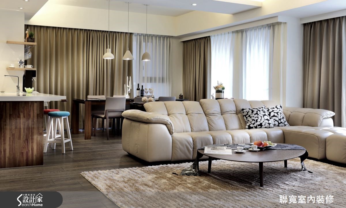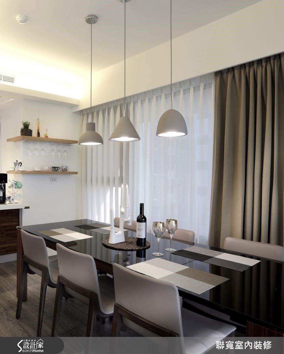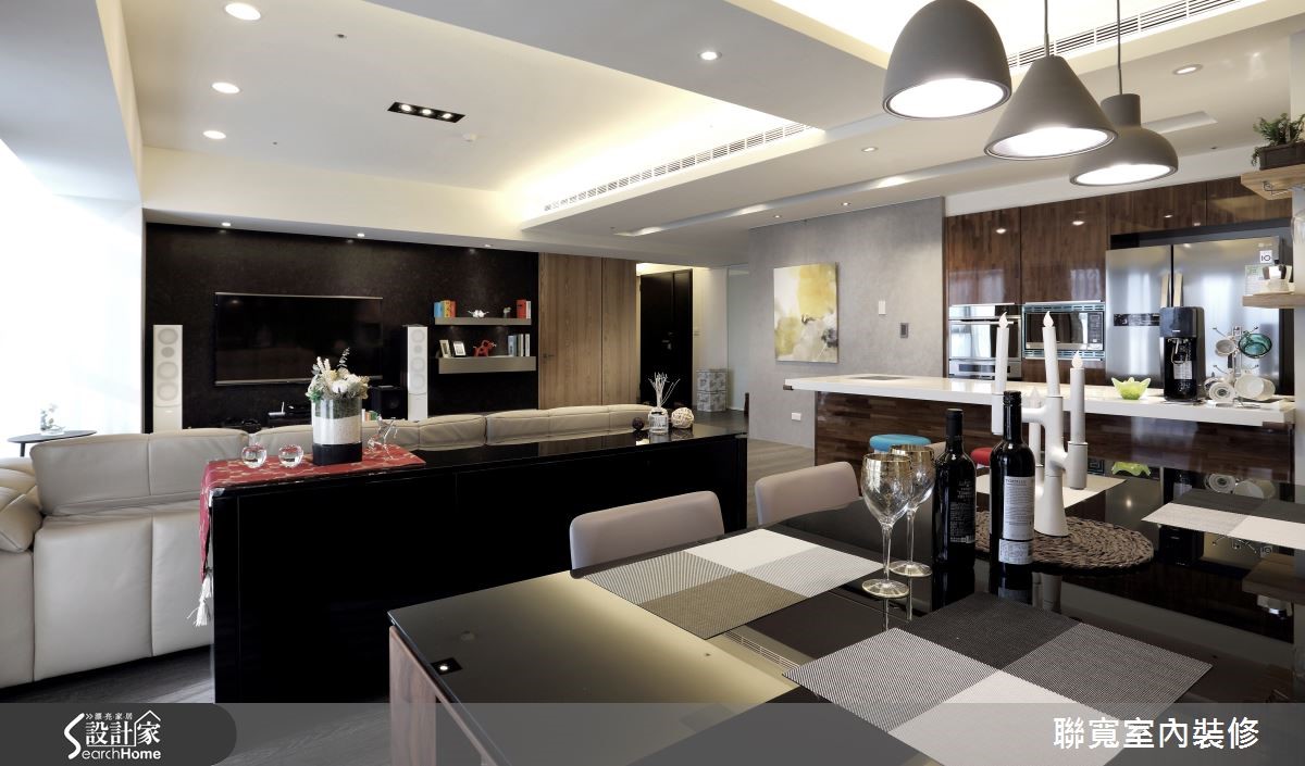 231平方米居宅,住着好客的一家三口,屋主夫妻期望能拥有的利落空间线条,以及实用的生活机能,因此找来设计师规划居家,于空间中加入现代风格,并让公领域呈开放设定,打造可供亲朋好友团聚的宽阔温馨场域,快一起来见识让人超有面子的居家风貌吧!【材质铺陈,营造有质感的机能家】设计师将公领域规划为开放格局,并配置连续的落地窗延揽好采光,藉由明亮光线强化空间宽阔感,而电视墙则以沉稳深色石材打造,在材质的细腻纹理下,衬托墙面的气质,一旁则连结木质柜体,将畸零空间重新运用,内部暗藏收纳储藏室,满足屋主置放收藏品的需求。餐厅区透过简约长餐桌搭配简洁感吊灯,打造温馨的用餐气氛,同时增设轻食吧台,赋予用餐形式更多样化的可能。来到卧房领域,设计师刻意将深色调集中于墙面腰线以下,并以白色钢琴烤漆表现床头墙气势,并将收纳机能隐于墙体之中,呈现轻盈不失稳重的质感!