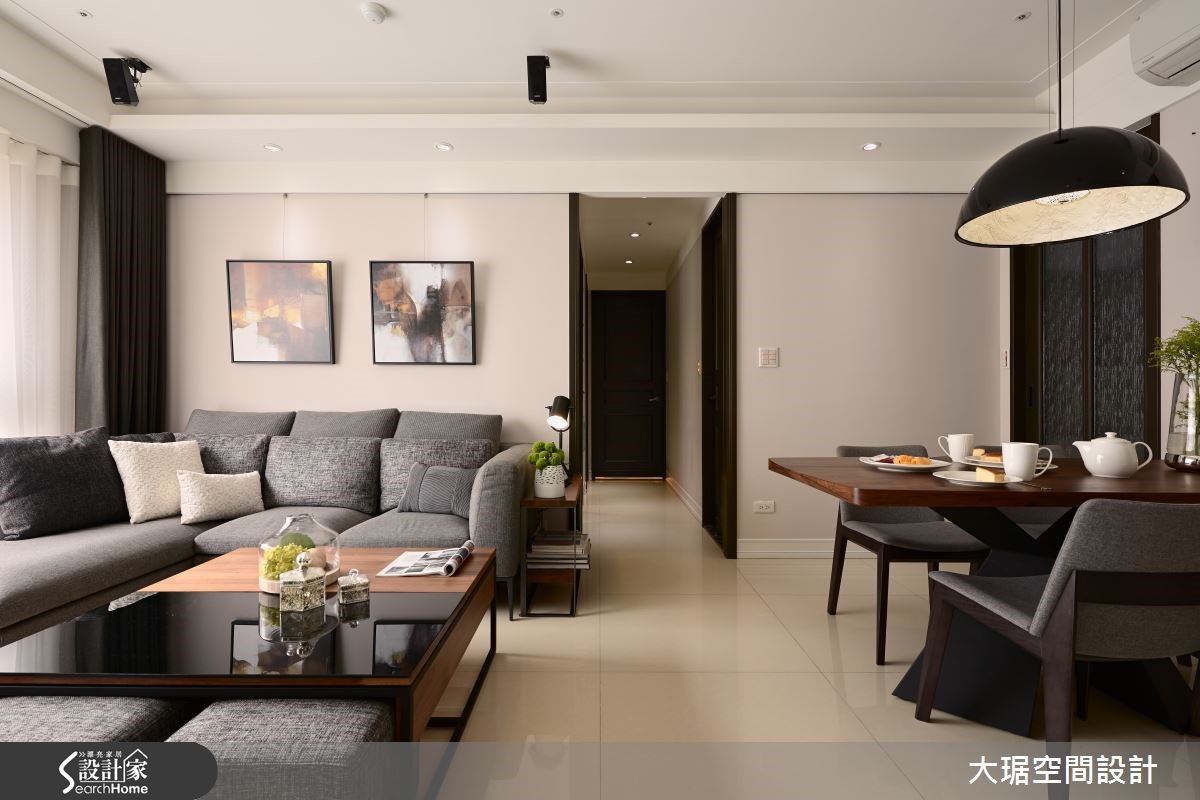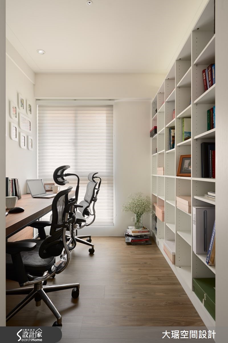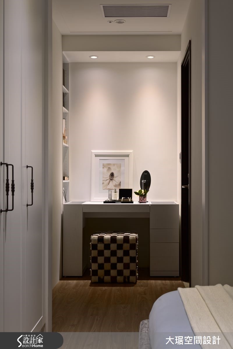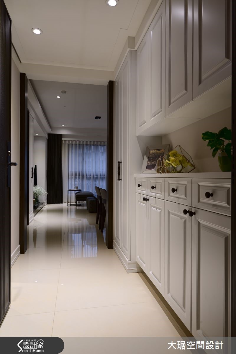 106平方米的居住空间内,设计师在原先格局隔出收纳空间,满足日常需求,并将新古典融合现代风,交织出大器氛围中的细致感。【完整收纳,随时维持空间清爽】玄关可见墙面规划整排的收纳柜体,透过镂空、下方不落地的设计,减缓量体的沉重感,并于柜门增添线板元素,点缀细腻的古典风情;延伸进入公领域,则透过吊灯与餐桌椅定义用餐场域,并可见墙面柜体、暗门连接电视墙,延伸立面尺度,创造大器视感。【色彩与动线,创造更舒适的体验】沿转角进入居家廊道后,可见白底黑框的展示墙柜,一旁则连接弹性玻璃拉门,可通往书房领域,而书房内则做出大面积书墙,满足收纳书籍需求,并以白色作为色彩主调,提升轻盈感受。主卧则延续轻浅基调,并于床尾做出整墙的收纳设计,在柜门把手处加入古典元素,并于墙面注入利落线条,搭配落地窗引进的明亮光线,使场域尺度更为宽广宜人!