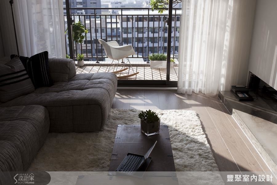 小阳台带来良好采光,铺设简单的南方松,以植栽妆点出都市沙漠中的小绿洲。并与室内地板形成无缝接轨,让客厅使用面积间接延伸至户外,再摆上耐用的户外家具,就是舒适的休闲空间。