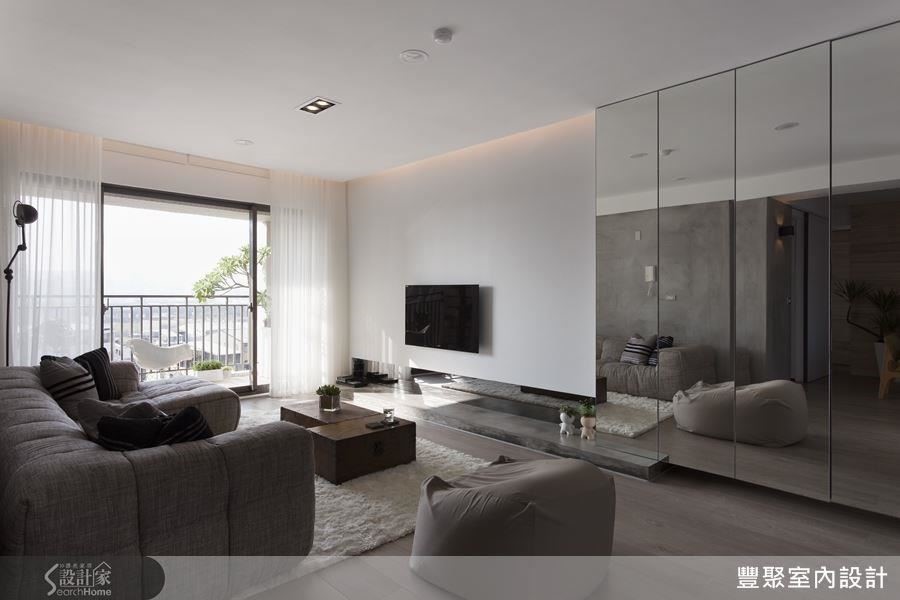 不到底的白色喷漆电视墙,隐藏着电源线路,衔接以镜面为门片的组合柜,满足收纳,更可随着光线进屋的角度,反射出不同的空间感。