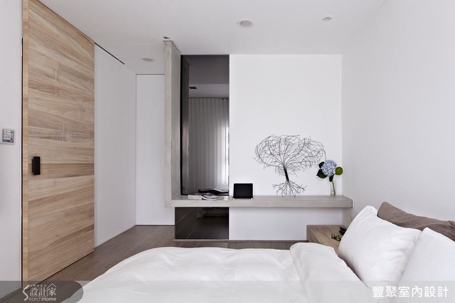 屋主将次卧打造成大更衣室,主卧不做收纳,显得更为休闲及舒适。其次,床铺侧边的墙面设置落地茶镜,既是穿衣镜也能映射出对面窗户进来的天光,加上L型平台设计,宛如装置艺术,质感自然又能摆放小物,实用有型。