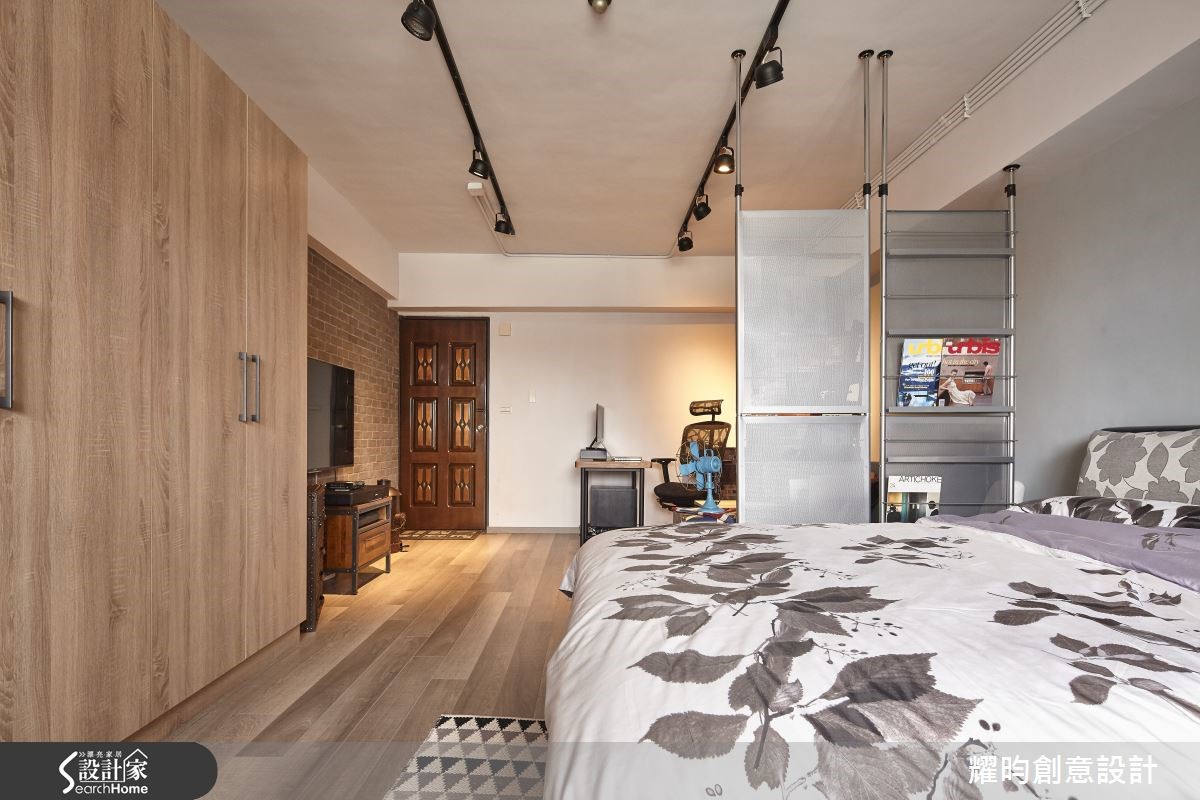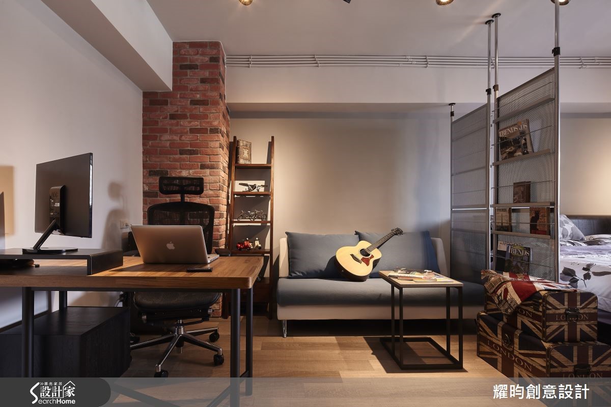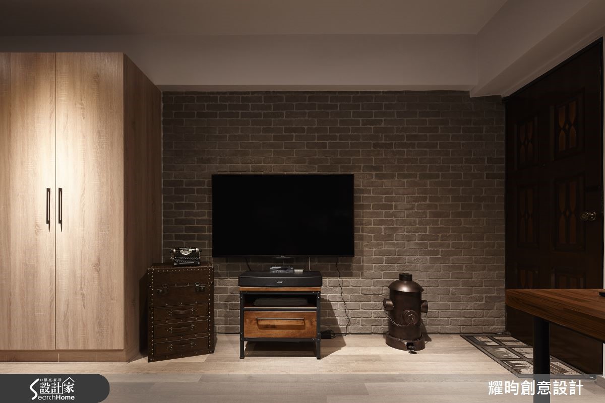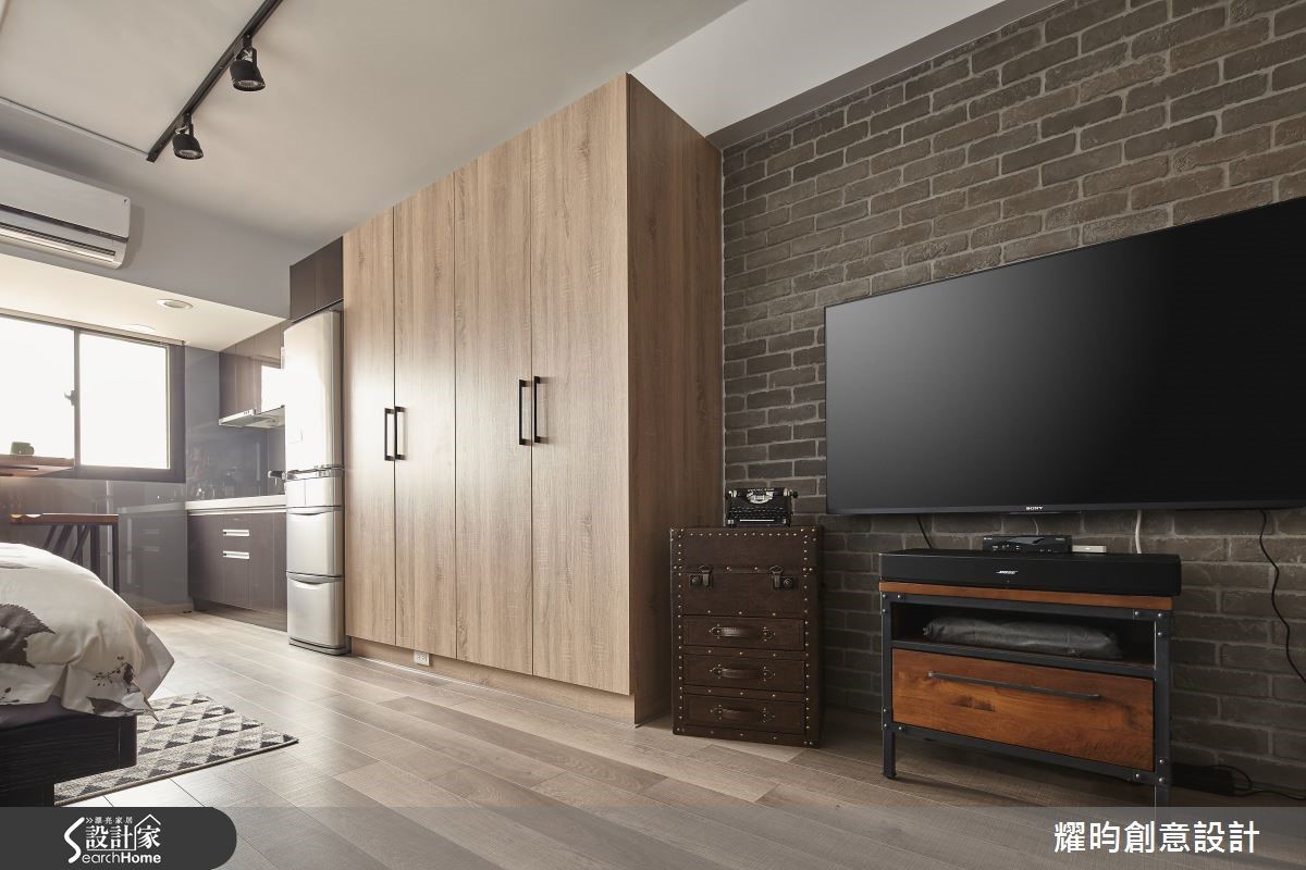 46平方米的小户型,是专属于夫妻的甜蜜空间;设计师看见主柱内放的优势,利用LOFT风将视觉空间变得更宽敞,巧手打造通透感十足、动线顺畅的两人世界。【开放格局,混搭质感家具】进入屋内,映入眼帘的即是由粗犷红砖包覆的大柱,搭配美式风沙发及铸铁木制混合质感家具,带着纽约Urban Style的气息。开放式空间,符合LOFT风无隔断的特性;同以高至天顶的书报架作为卧房及客厅的界定。【复古元素,烘托工业风情】客厅的电视墙,由灰阶文化石砌成,搭配皮箱及电视柜,加上消防栓造型摆饰,充满复古气息。餐厅则以吧台及铁制高脚椅,塑造美式工业风情,与客厅家具相互呼应。至于使用机能,床对面的大型木质收纳柜占满整面墙,提供完整收纳空间。卫浴设备有干湿分离设计,提供视野与机能性上皆舒爽的居住空间。经典的砖墙外露设计、充满个人特色的摆饰,点缀着整体居家氛围;比如英国国旗的行李箱及仿三零年代美制的风扇,处处可以看见装修的细节及用心。