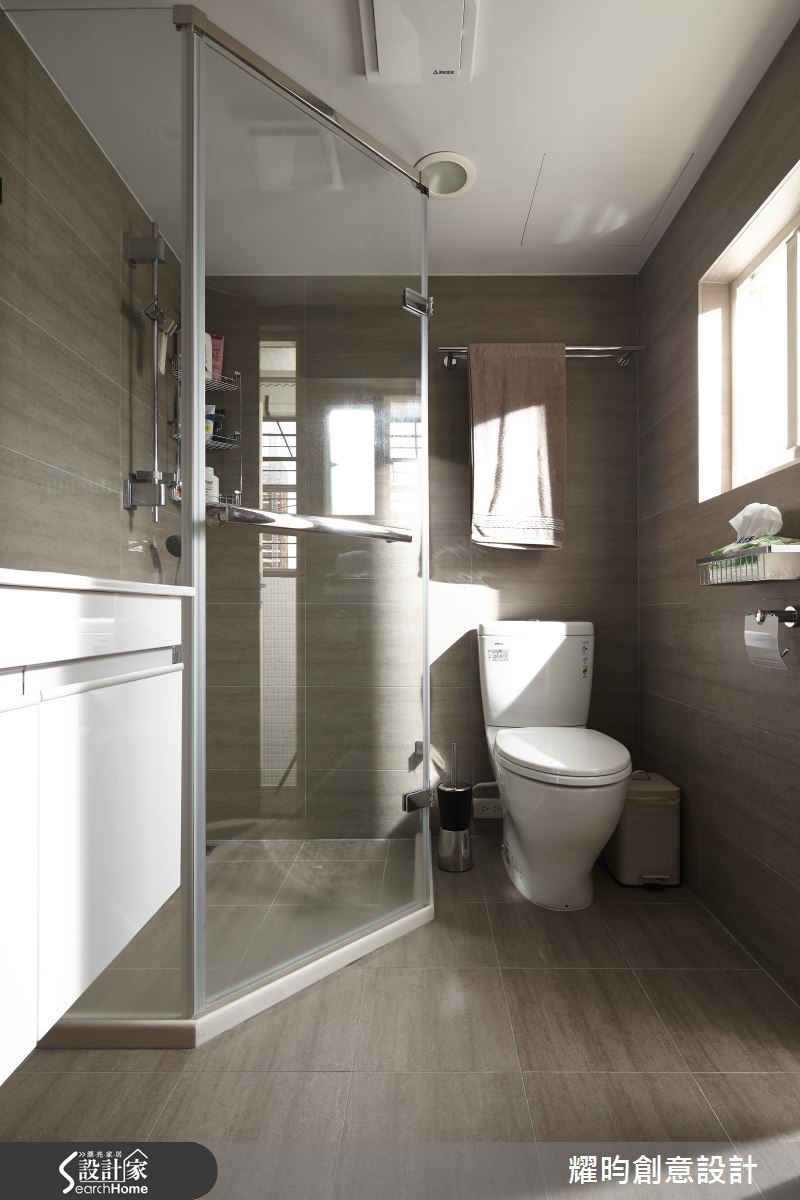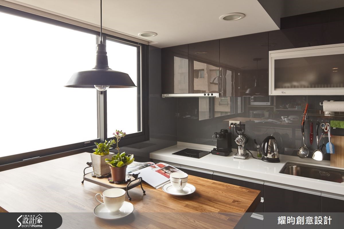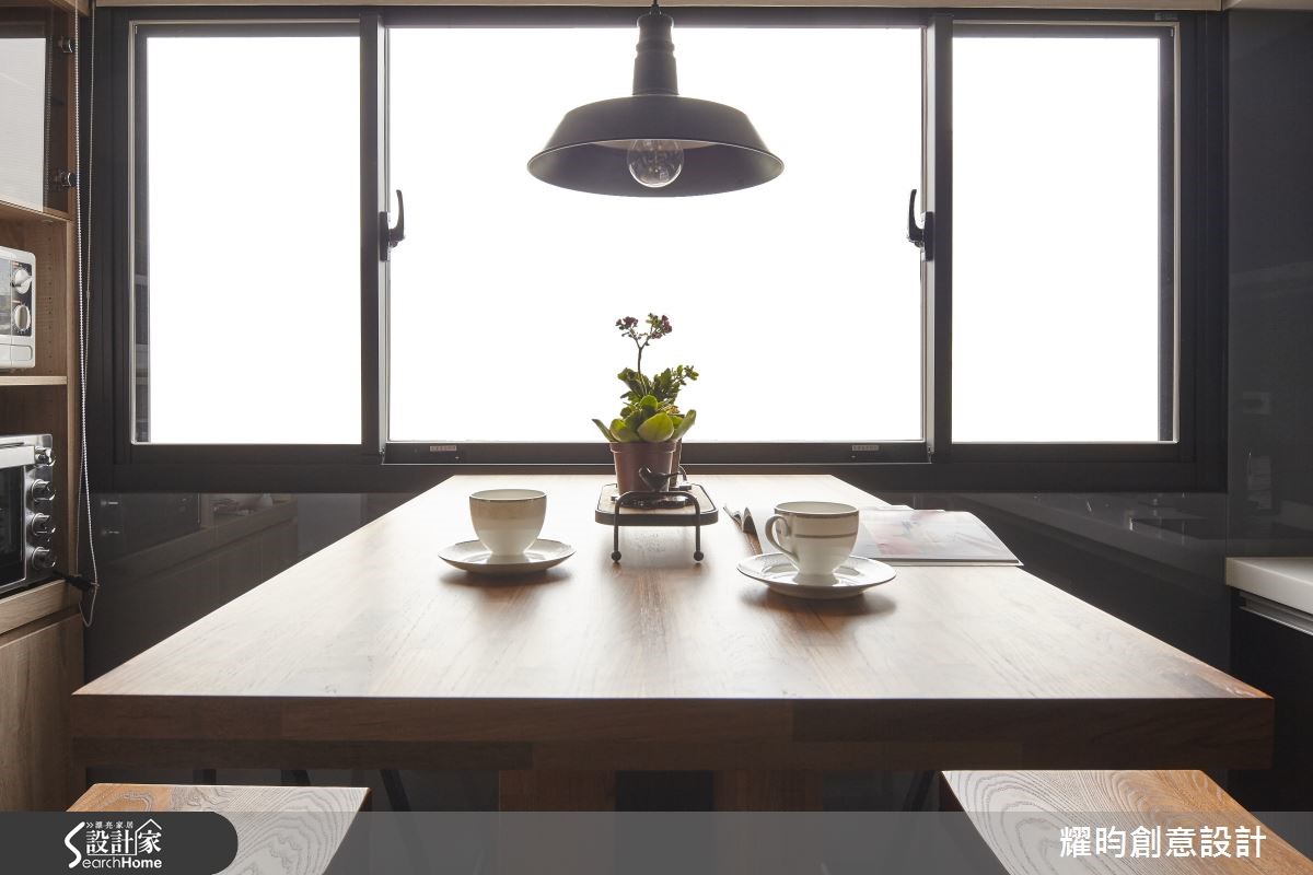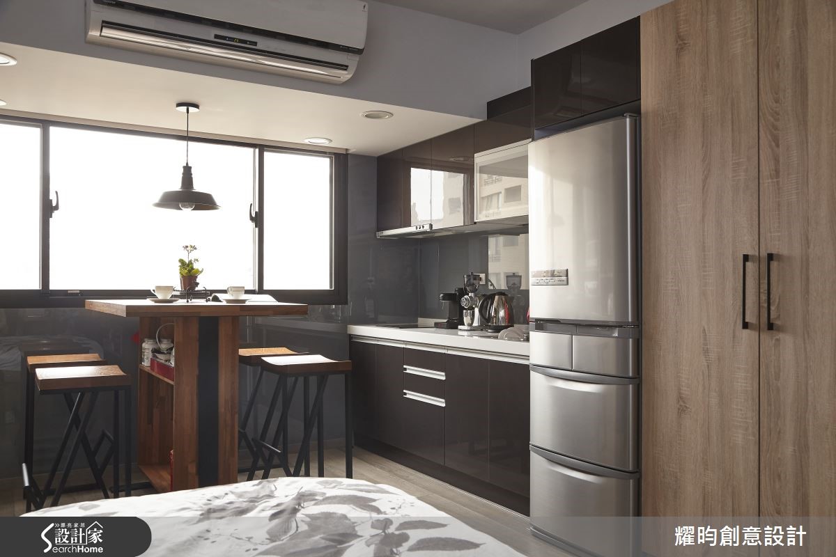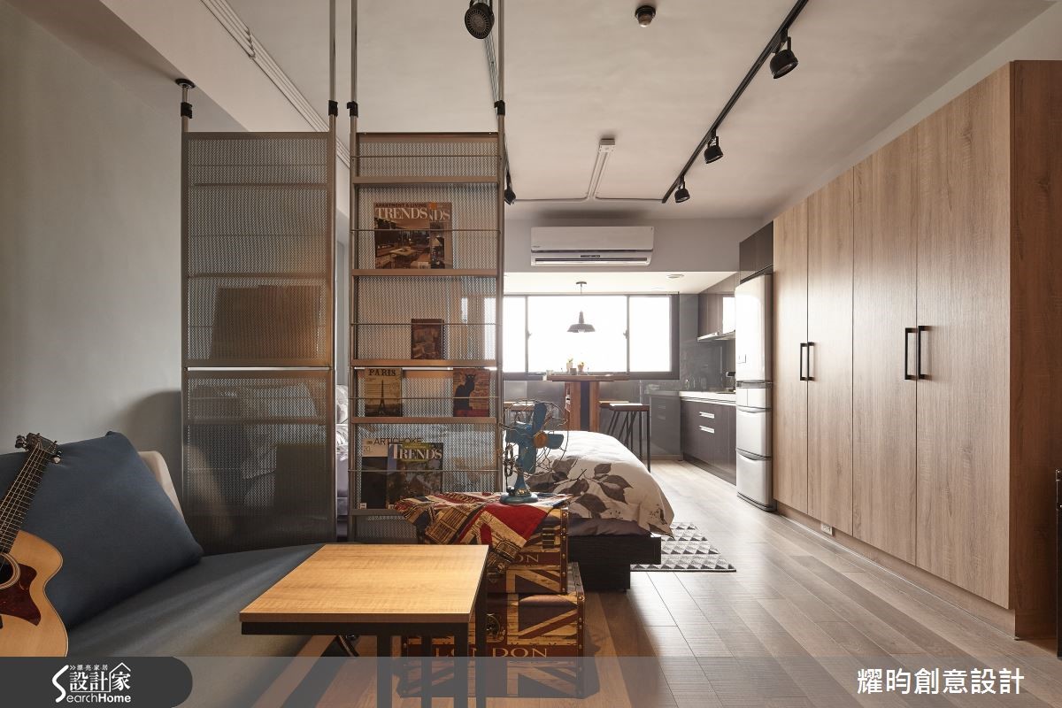 46平方米的小户型,是专属于夫妻的甜蜜空间;设计师看见主柱内放的优势,利用LOFT风将视觉空间变得更宽敞,巧手打造通透感十足、动线顺畅的两人世界。【开放格局,混搭质感家具】进入屋内,映入眼帘的即是由粗犷红砖包覆的大柱,搭配美式风沙发及铸铁木制混合质感家具,带着纽约Urban Style的气息。开放式空间,符合LOFT风无隔断的特性;同以高至天顶的书报架作为卧房及客厅的界定。【复古元素,烘托工业风情】客厅的电视墙,由灰阶文化石砌成,搭配皮箱及电视柜,加上消防栓造型摆饰,充满复古气息。餐厅则以吧台及铁制高脚椅,塑造美式工业风情,与客厅家具相互呼应。至于使用机能,床对面的大型木质收纳柜占满整面墙,提供完整收纳空间。卫浴设备有干湿分离设计,提供视野与机能性上皆舒爽的居住空间。经典的砖墙外露设计、充满个人特色的摆饰,点缀着整体居家氛围;比如英国国旗的行李箱及仿三零年代美制的风扇,处处可以看见装修的细节及用心。