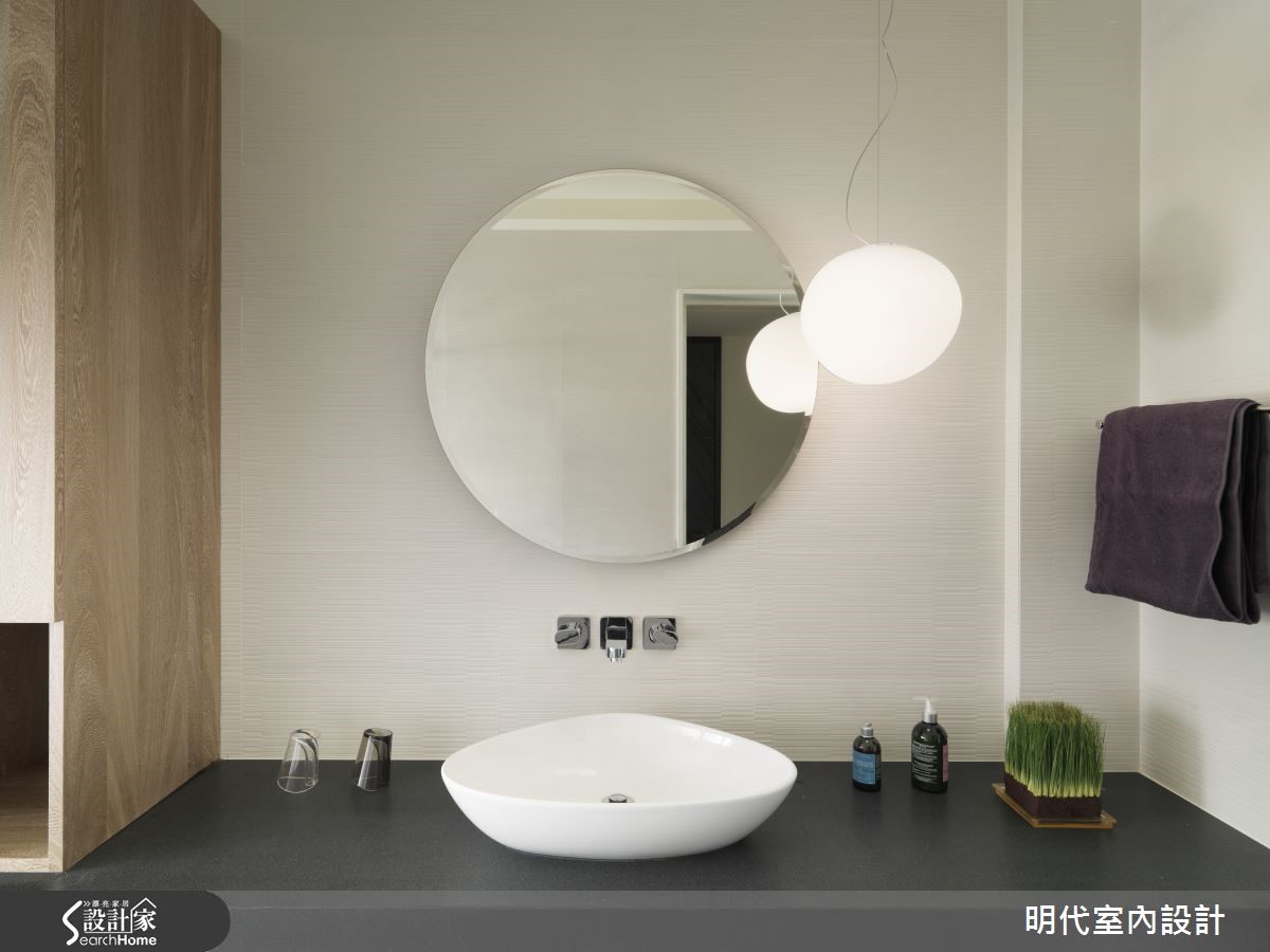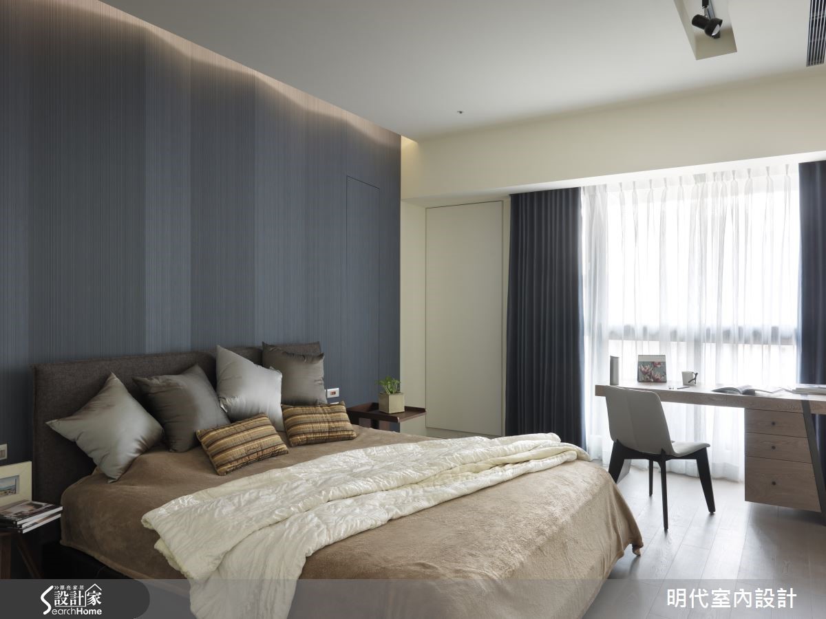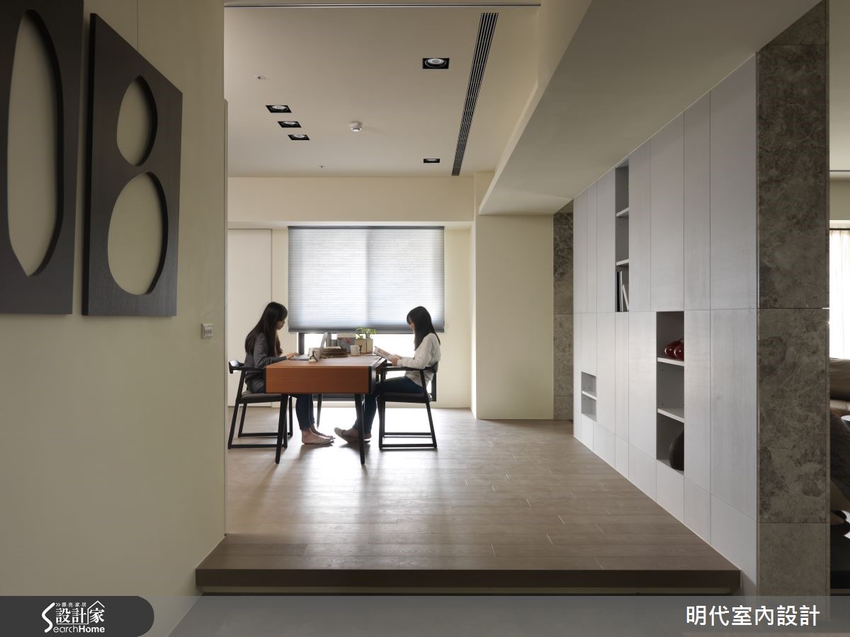 211平方米的居宅,设计师以现代风为语汇,替居家注入流畅线性脉络,同时让墙面结合展示机能,添入方框图腾形成美感端景,而偶尔点缀的圆形元素,则柔化了阳刚的居家轮廓,展演出空间的视觉趣味!【整合动线与展示的实用设计】设计师将公领域划分为客厅、餐厅、架高多功能室等三部分,并以电视主墙作为界定;客厅在沙发后方规划大面展示墙柜,以木纹、铁件等构筑利落的端景立面;大理石电视主墙为一体两面使用,墙面背向同时亦兼具展示机能,替多功能室注入实用的生活机能。【几何趣味的居家餐饮风貌】餐厅长餐桌则结合居宅结构柱,隐性切割出过道轴线,并使餐桌衍生独特风貌,让白色线条、温润木纹完美揉合,创造出视觉上的几何趣味;卧房床头墙则加入独特的造型折板设计,一旁则将门片隐于其中,透过悠远的深蓝作为定调,开启舒服宜人的氛围!