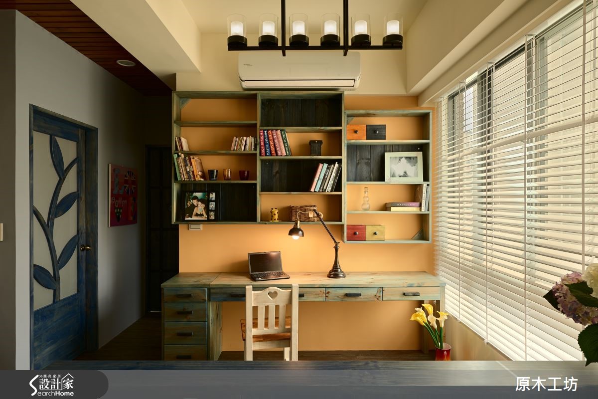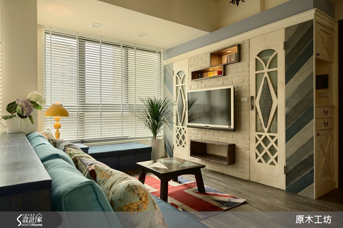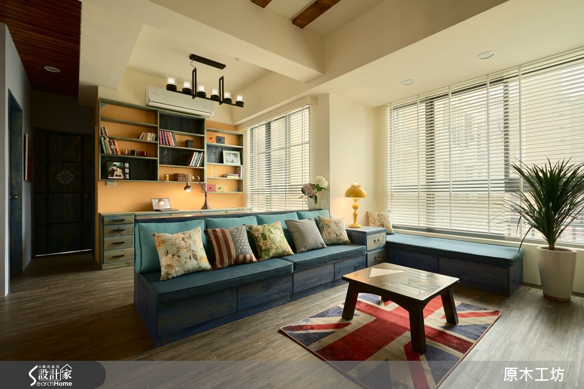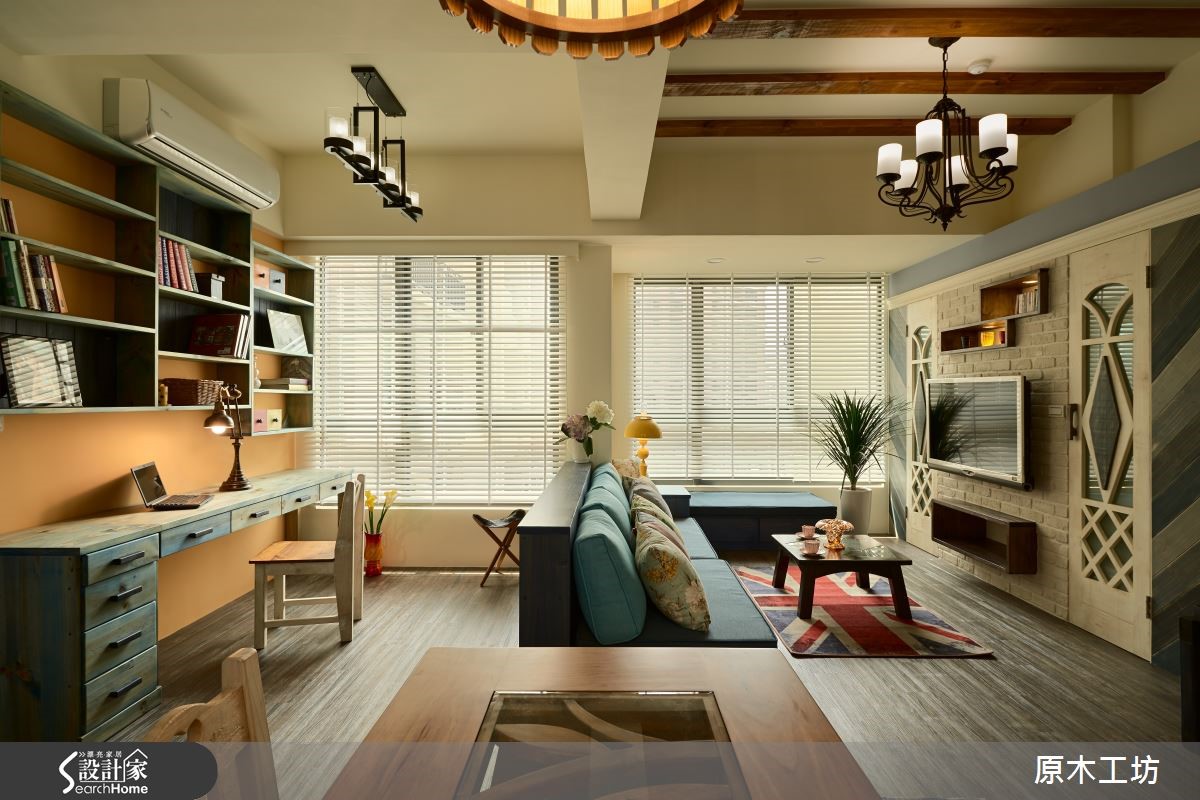 走进66平米的疗愈风居宅,立刻感受到浓厚的殖民风格,沉稳的铺木地板与缤纷的软装结合,利用家具与墙面的对比色块使屋内各区域层次分明,使两面透光的室内更加充满活力与明亮氛围。【鲜艳色彩打造优雅度假氛围】水蓝色的美式沙发拉高客厅清爽度,搭配国旗图样的地毡与碎花抱枕,增添度假风格;文化石电视墙巧妙镶嵌置物区,与奶油色木制门片同时化身优雅收纳空间。客厅后方的阅览区,摆放蓝色刷色书桌增添仿旧感,与粉橘色墙面对比,为宁静氛围跳出活泼撞色。客厅与阅览区、餐厅皆以原本横梁作为场域分野,但设计师注入巧思,将客厅天花设置木制隔栅,避免包覆性天花降低视觉通透度。【花砖地坪,拥有道地乡村风厨房】厨房则特意将天花以浅色木条进行包覆性设计,地板铺叙花砖,与客厅作出空间区隔,同时在实木流理台中嵌进同色系花砖,同时满足协调性与料理机能;穿越后方的订制吧台,便可在以复合色调花砖镶嵌的墙面旁享受家人相聚时光。