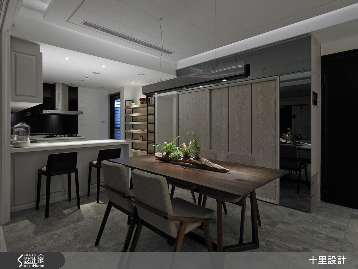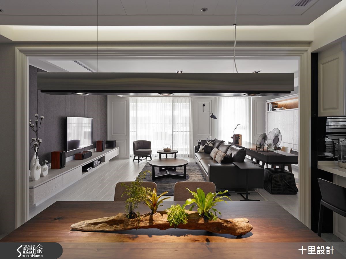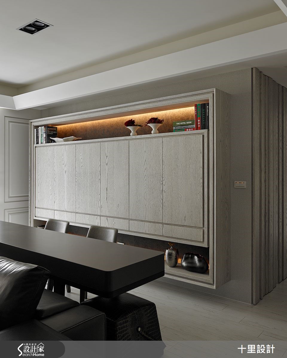 精致却不繁复的颜色与线条,是构筑现代风居家的特色之一。这间124平的现代风空间中,巧妙运用美式线板,强化优雅线条;搭配设计家具和简约灯饰点缀,展现轻奢居家的设计细节。 【美式线板和灯光,勾勒层次细节】由黑白相间色调为基底的客厅,美式线板造型的壁面搭配弯曲壁灯、木纹电视柜与电视墙、超耐磨地板与地毡、后方收纳柜体与阅览长桌,皆是一黑一白,完美而井然的调和在一起,并巧妙的结合了客厅与书房的机能。通过开放视角,完整将用餐区域尽收眼底,并改变地坪以雾面抛光石英砖,改变空间的氛围。而长形造型吊灯搭配木作长桌,营造用餐的氛围。明亮的L型厨房兼具吧台与操作台面的功能,使厨房与餐厅得以产生更多对话机会,家人互动更频繁。 通过两侧墙面皆充满收纳机能的走道,来到家人的卧房,利落的收纳柜体与灰阶色调为卧房的主体,不同的是小孩房更增添童趣气息,整面涂鸦墙纸带来活泼的气息。主卧则充满宁静沉稳的氛围,阳光由木制百叶缓缓流泻。