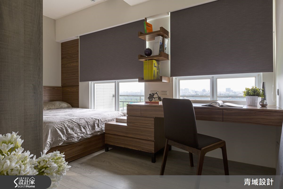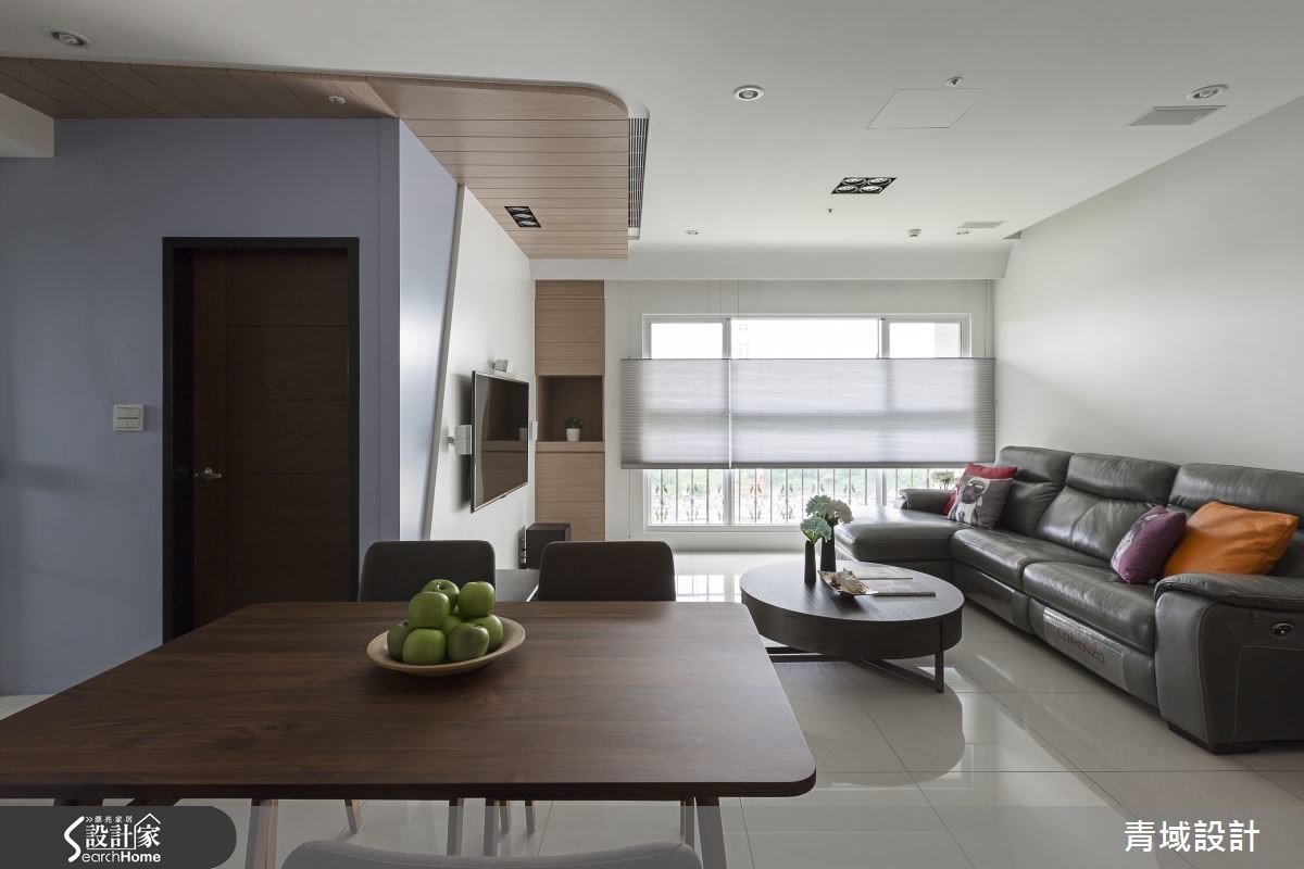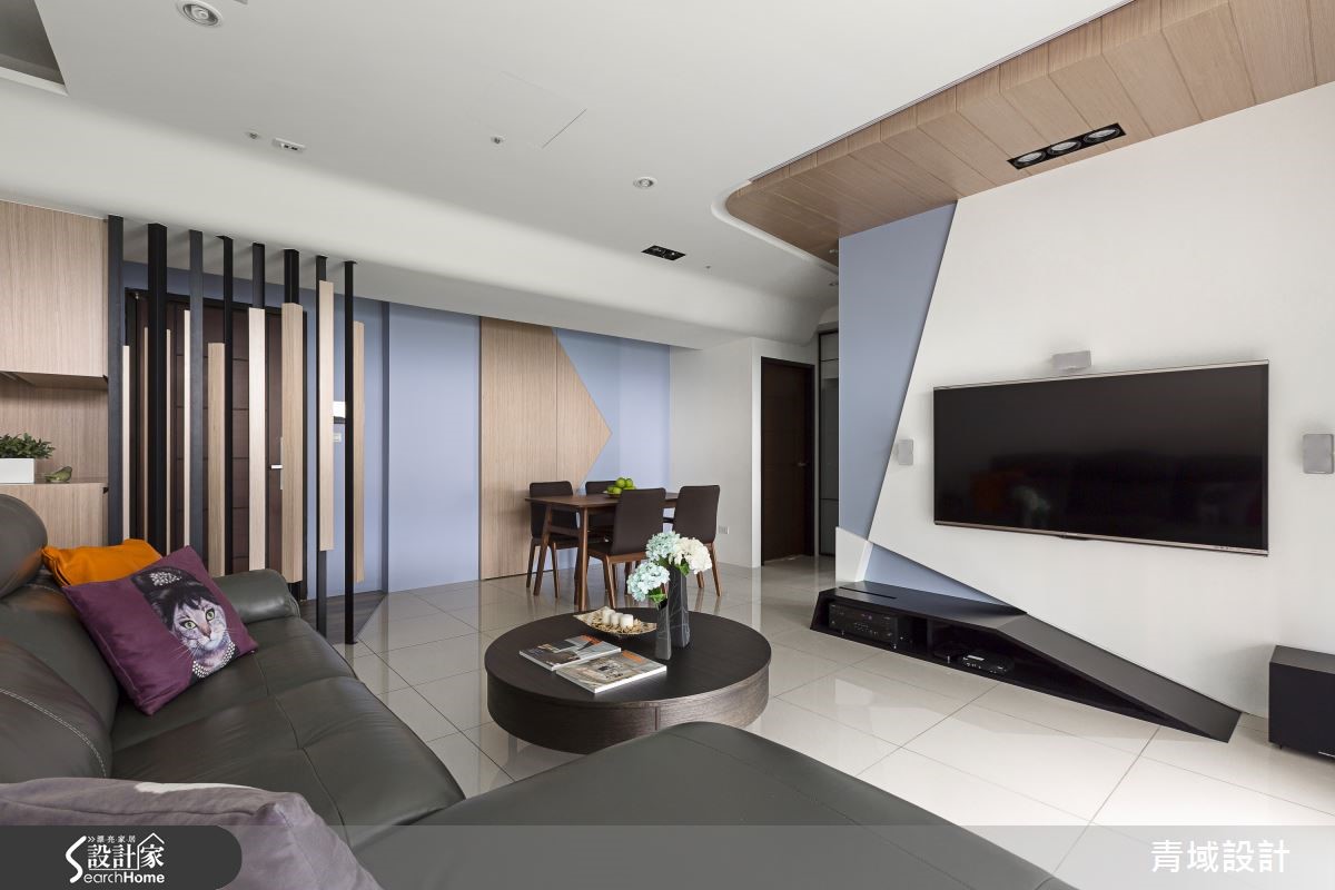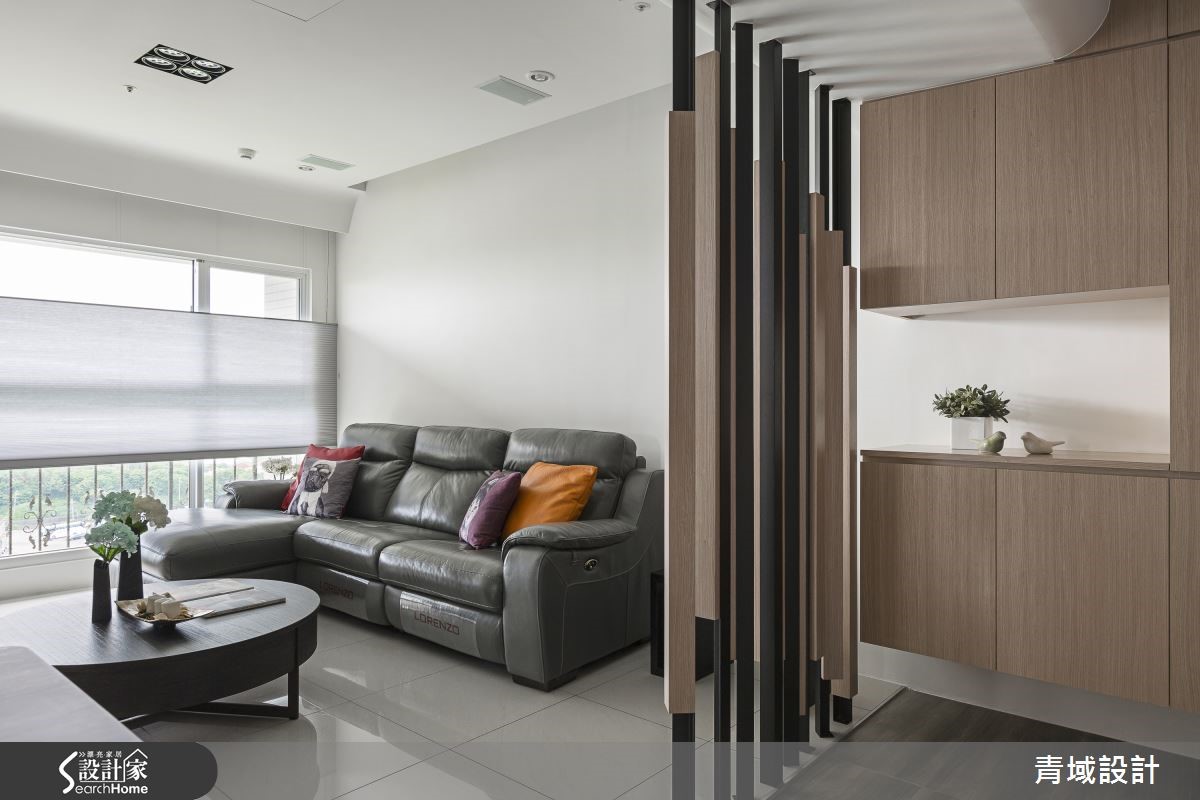 74平米居家是屋主献给将要大学毕业儿子的成年礼,由于屋主夫妻长年在大陆经商,偶尔才回台居住,所以居者多半为儿子一人,故设计师舍弃原先半开放书房的空间,透过2室2厅格局,换得比例较为平衡的空间,打造出一人刚刚好、三人不拥挤的场域。【线条几何图形,创造利落现代感】设计师于居家注入大量的斜线条语汇,营造利落现代感,比如玄关格栅即采用不同转向角度的设计,开启活泼印象;进入公共空间,大面积开窗打造出拥有广阔视野且通风良好的居住环境,而电视墙则透过白、紫两色建构出几何图腾,结合定制视听柜,使墙面兼具机能与美感。配置玻璃拉门做为厨房隔断,阻绝油烟问题,并考虑到客浴入口正对餐厅旁,因此规划隐藏式活动拉门,同时呼应电视主墙,强化居宅的利落现代感;居室内则融入书房机能,同时整合桌面与柜体等,形成具流畅感的设计,并纳进窗外好景色,营造舒适宜人的阅读氛围!