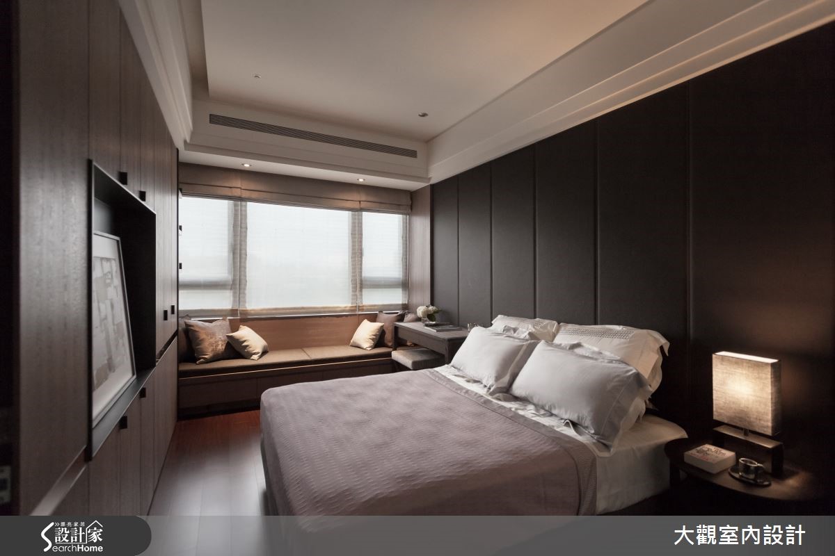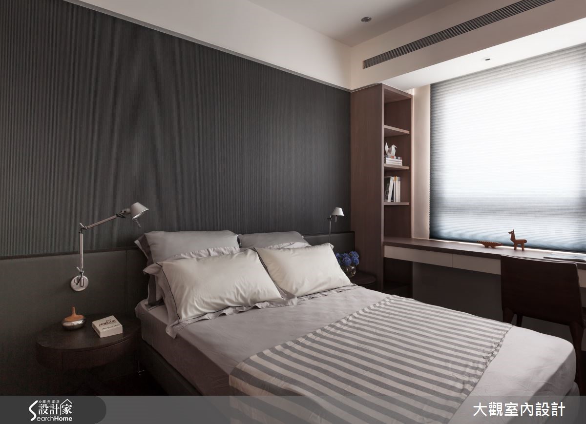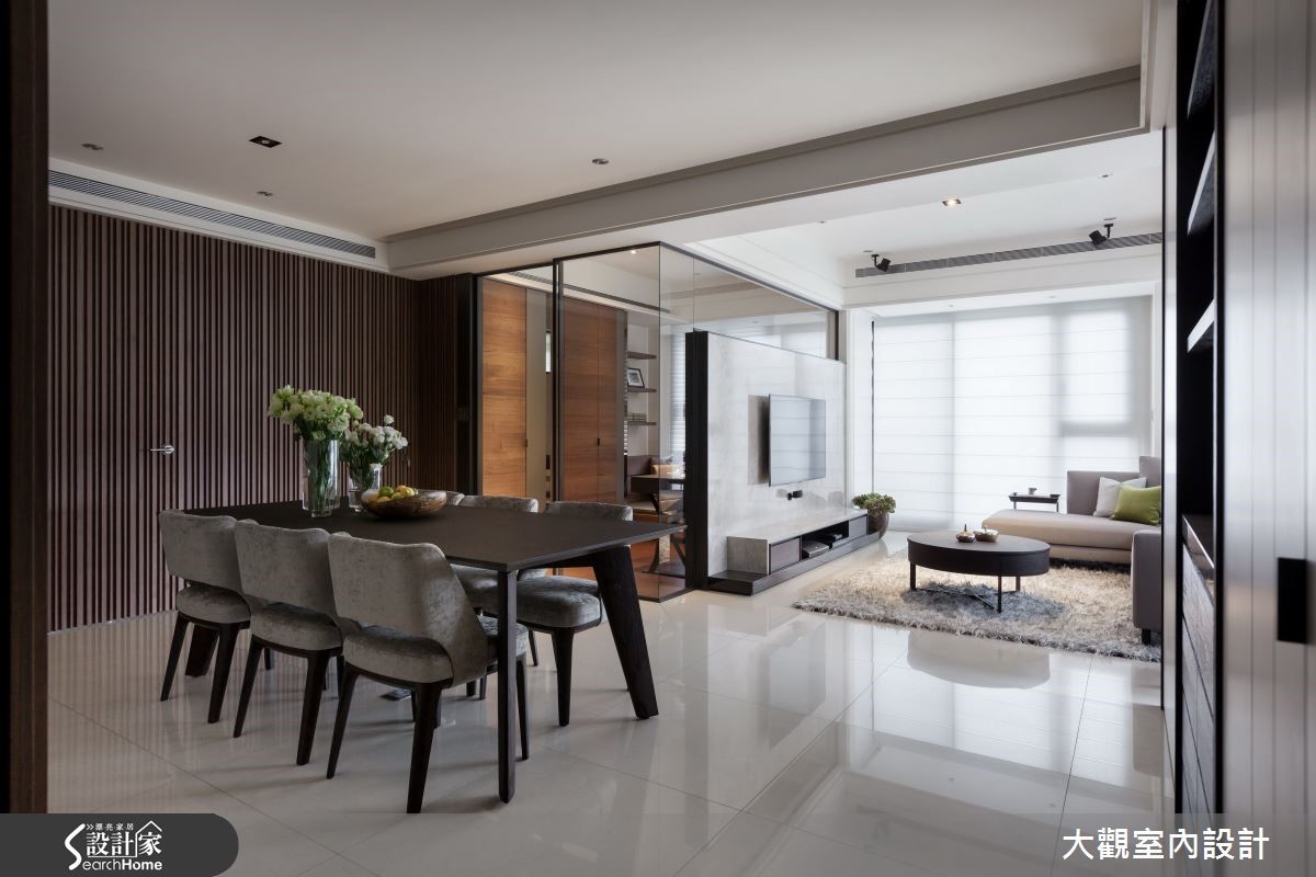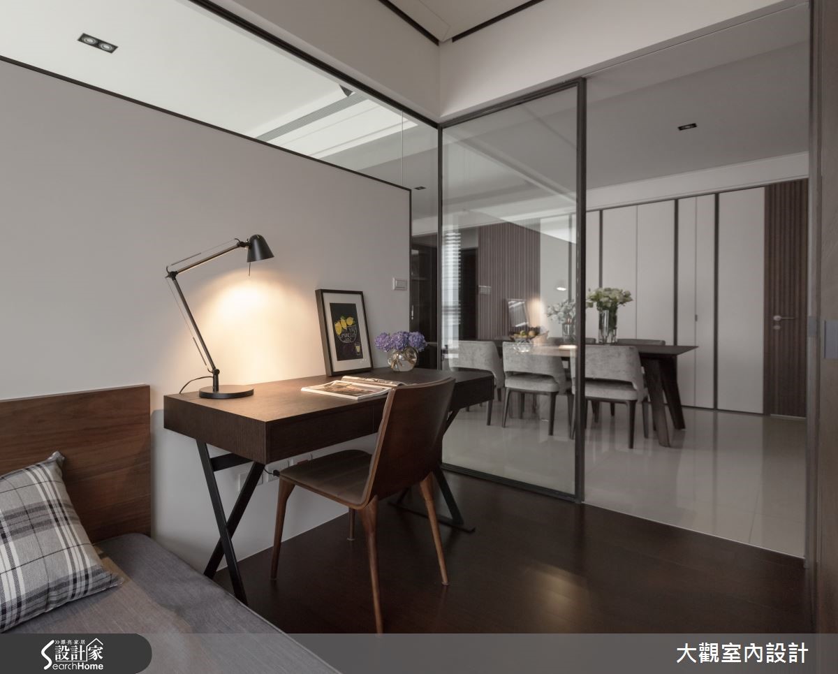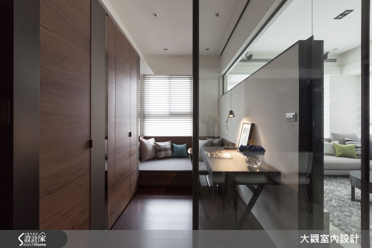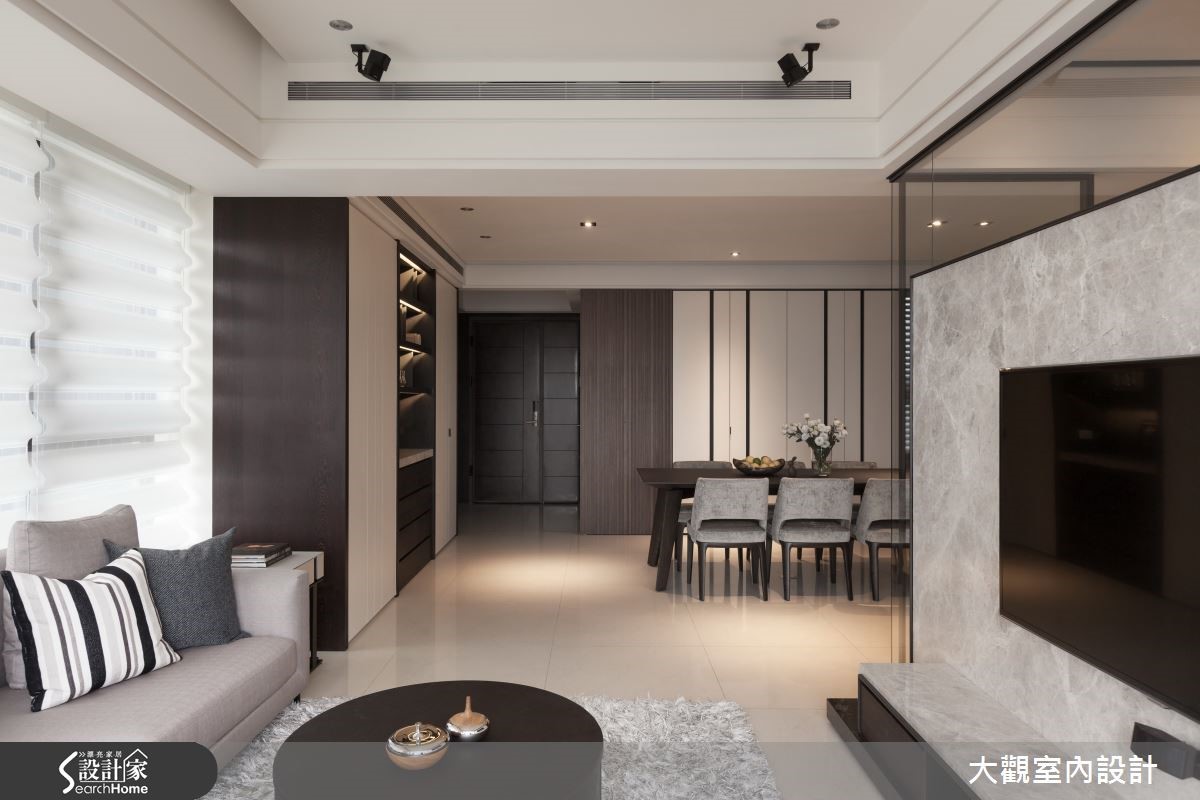 112平方米单层居宅,为搭配两侧大片的采光,使用宽版的白色百叶窗,让阳光尽情地洒进屋内,跳跃在灰色的沙发与地毡布置,为沉静的客厅增添活泼明亮的氛围,一切都是如此的简单大方、充满轻爽气息。【隐藏式推拉门,空间独立又通透】电视墙后方是独立的阅读空间,为让阳光穿透而入,又能隔出静谧的领域,以落地玻璃与大理石电视墙面两种材质相互镶嵌,制造出明亮的半开放空间,内部则铺设木皮,并于窗边设置大型飘窗,提供舒适的阅读空间。客餐厅的隔断以隐藏式的木质推拉门为设计,可随时打开,让两方空间互通,呈现更宽敞明亮的开放式公共空间。也可拉上推拉门,营造温馨独立的用餐环境。而卧房窗边也以舒适的飘窗为设计,并用褐色与灰色打造现代简约风格。