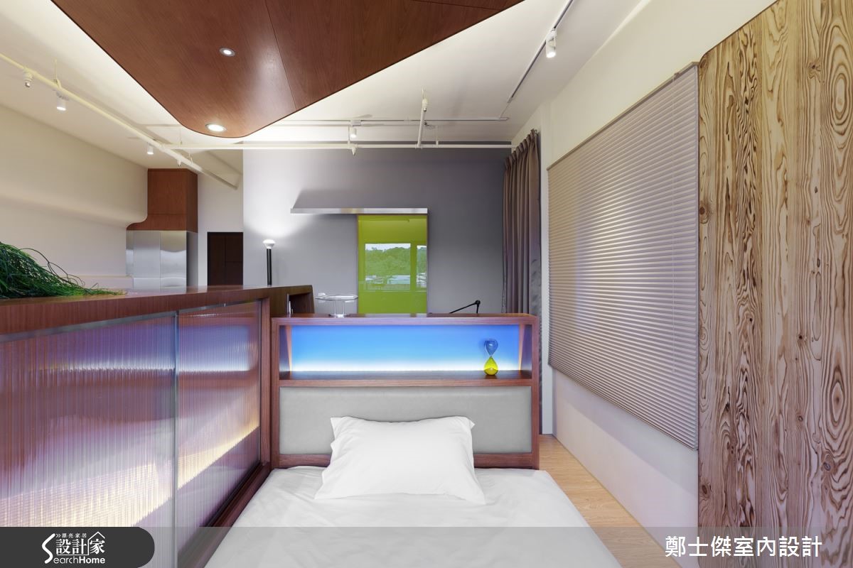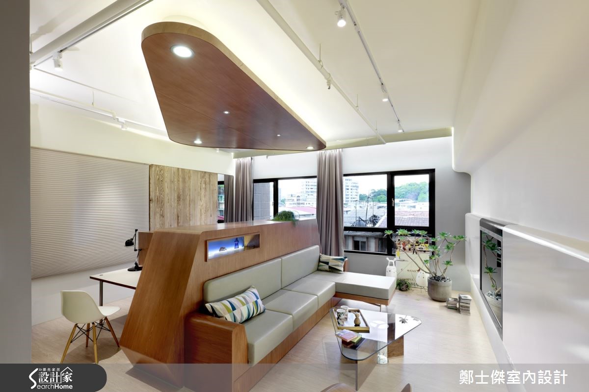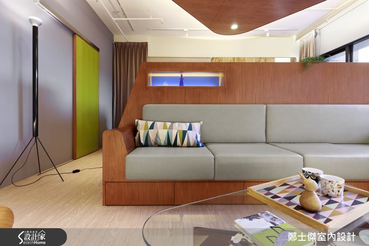 一个人住的乐趣即是可以随心所欲,在设计装修上亦是。以自己的喜好为出发,尽情享受适合自己的居家空间。这个仅有33平方米的新屋,屋主本身偏好简单设计,加上空间有限,设计师采用混搭风打造出简约独特的空间。【多功能家具,解决收纳与生活机能】为了有效地利用空间,整体采开放式设计。入门即可见大型家具,作为空间内的主导与各区的隔断,放置中央使视觉集中,空间更显宽敞。值得一提的是,此木作家具同时结合了沙发、工作桌、休息与收纳橱柜的功能。家具巧妙运用特殊的三角几何形状,就像是艺术陈设品,兼具高度的机能性与设计美感外,也大幅增加了活动空间,动线相当整齐划一。由于屋主本身爱好摄影,设计师规划出一区展示墙满足需求,且特地设置玻璃柜提供屋主展示其珍藏的公仔与收藏品。