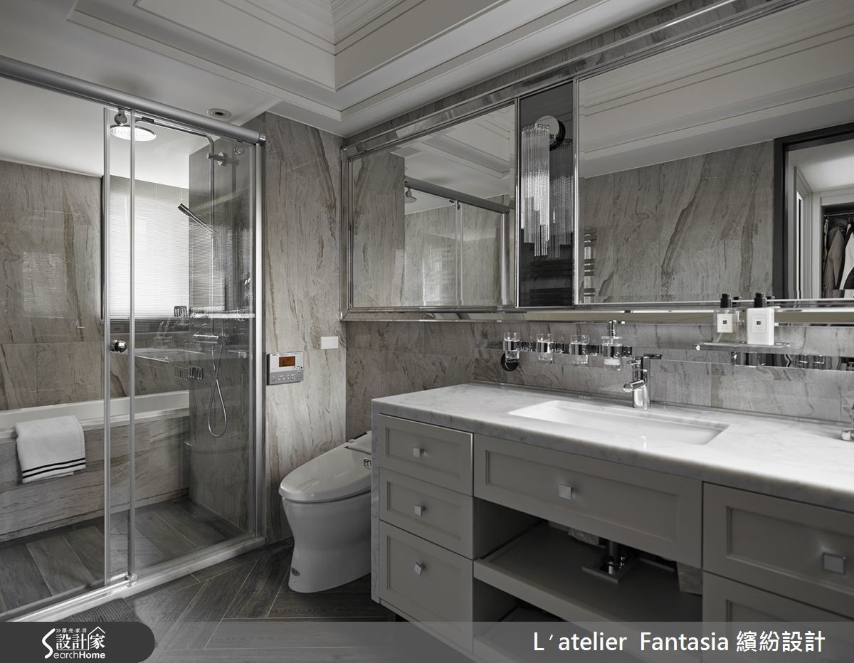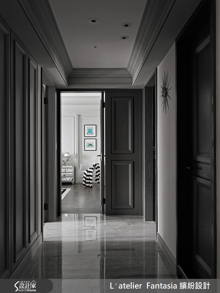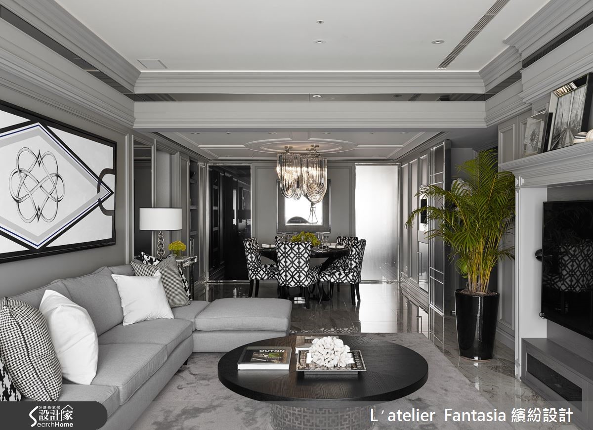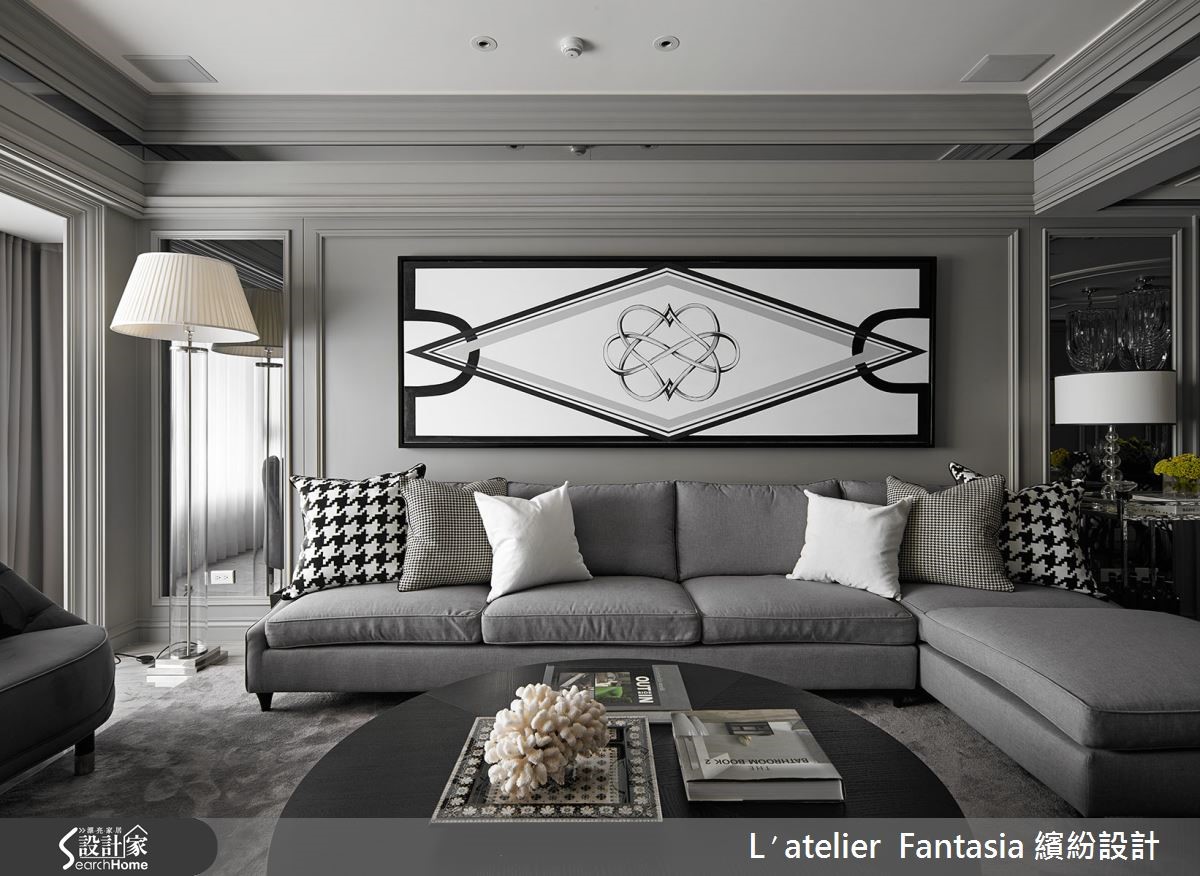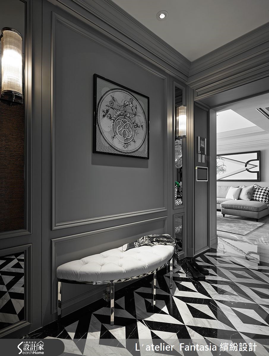 设计师以新古典风格作为136平米居家的设计主轴,并将软装陈设与硬件空间做适当的搭配,于新古典元素中加入时尚亮点,打造出宛如高档酒店般的星级质感,快一起走进来看看吧! 【色调与材质,打造欧式高级公寓】从大门走进玄关,即可见充满摩登感的几何图案地坪,搭配半月形玄关椅,让人有种彷佛走进欧洲高级公寓的观感;客厅则在灰阶主调上点缀黑白对比,营造都会高雅气息,同时陈列舒适的L型沙发,于两侧摆设欧洲餐车与立灯,取得空间画面的视觉平衡。【对称线条,新古典风的优雅关键】餐厅领域则配置黑白餐椅,藉此呼应客厅抱枕的千鸟格图纹,并于天花板悬吊水晶玻璃灯饰,打造耀眼的视觉焦点;同时于主卧门片加入巧思,采用对称设计,让其中一扇门片作为进入卧房的入口,并在房间内加入细致线板传递新古典风格,于柜体表面妆点镜面不锈钢材质,打造具前卫感的时尚气息!主卧卫浴让镜子加长加宽,延伸了空间尺度,尤其让收纳机能以充满美感的形式呈现,刻意于订制不锈钢进口杯架嵌墙,让瓶瓶罐罐瞬变为装饰,注入星级酒店的精致质感!