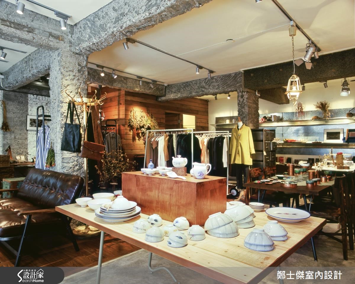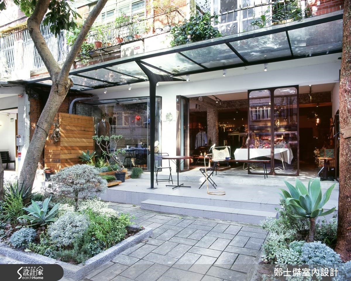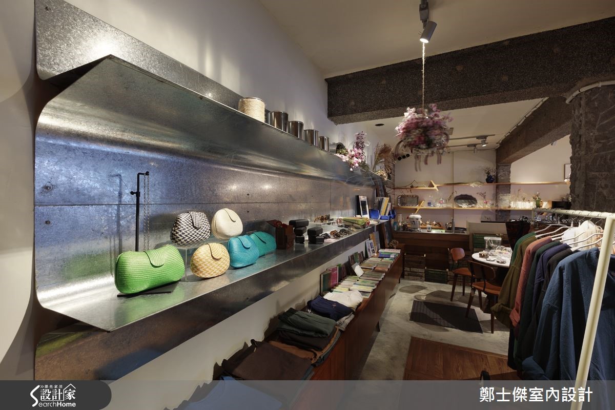此案为一家选货店,由于业主钟情于自然休闲风格,希望放宽各商品区间的路线,使活动空间富有弹性。为解决原先老屋采光不良问题,遮雨棚以透明玻璃与钢材结合,并藉由开放式设计,延揽阳光与绿意进入店面。【木质和水泥铺陈疗愈氛围】以大量的木质与铁件摆设为主,搭配复古单品与干燥花草,在自然光的加持下,突显商品的颜色与光泽。并以水泥灰砖横梁做为各区的分隔,加入朴质的水泥粉光和木质地面,营造出温润氛围,并成功使各产品达成和谐的视觉效果。店面后方的商品展示架为不锈钢材质,在柔性的空间中添入阳刚气息。为解决墙面的渗水问题,在壁面进行单面墙封闭的防潮工程,并设计了个性铁件爬梯,与骨董家具结合,形成了复古个性的疗愈风格。