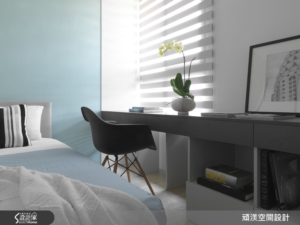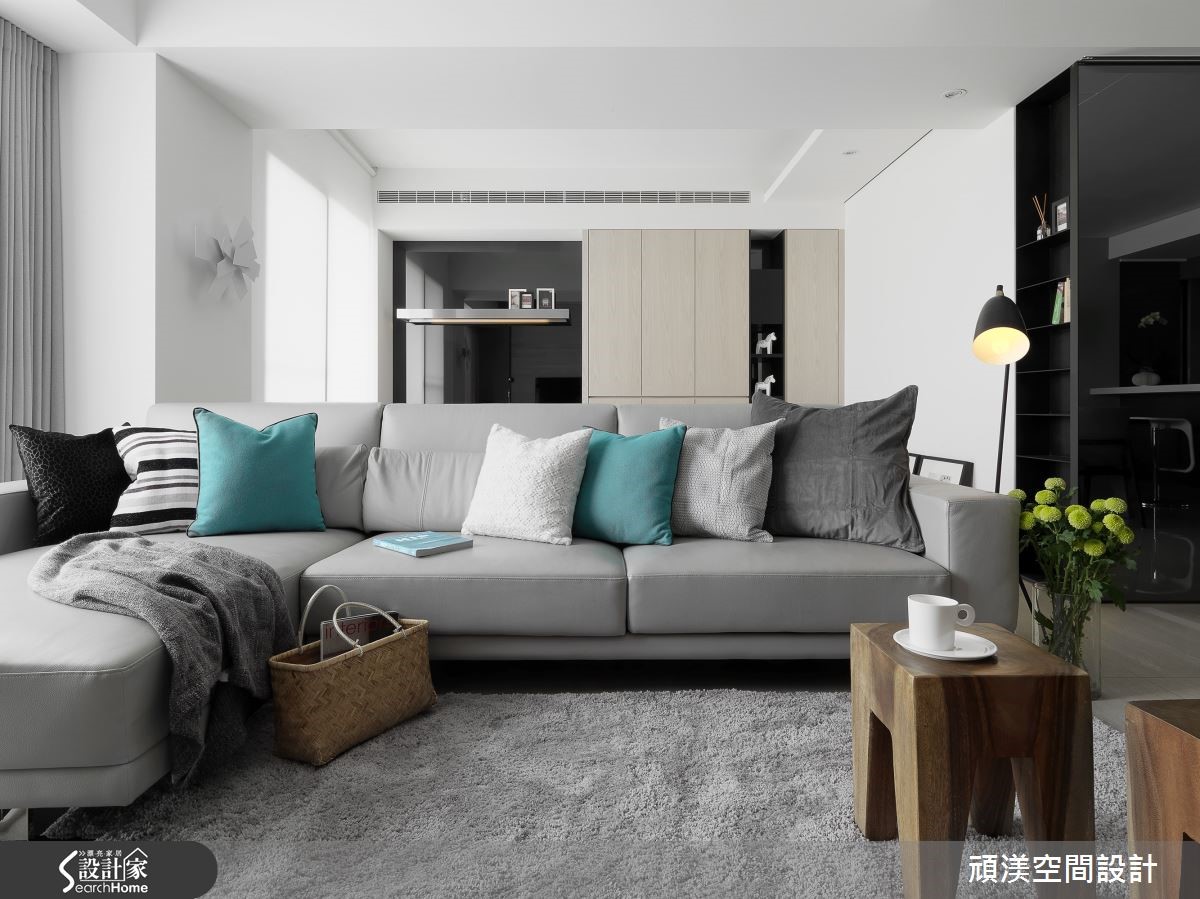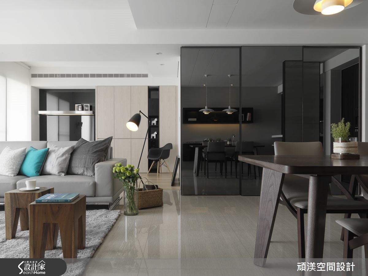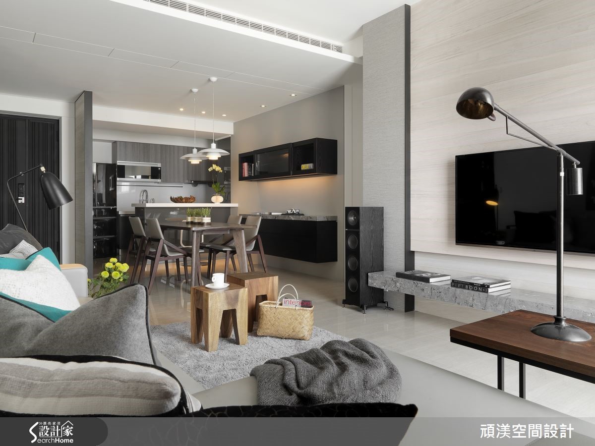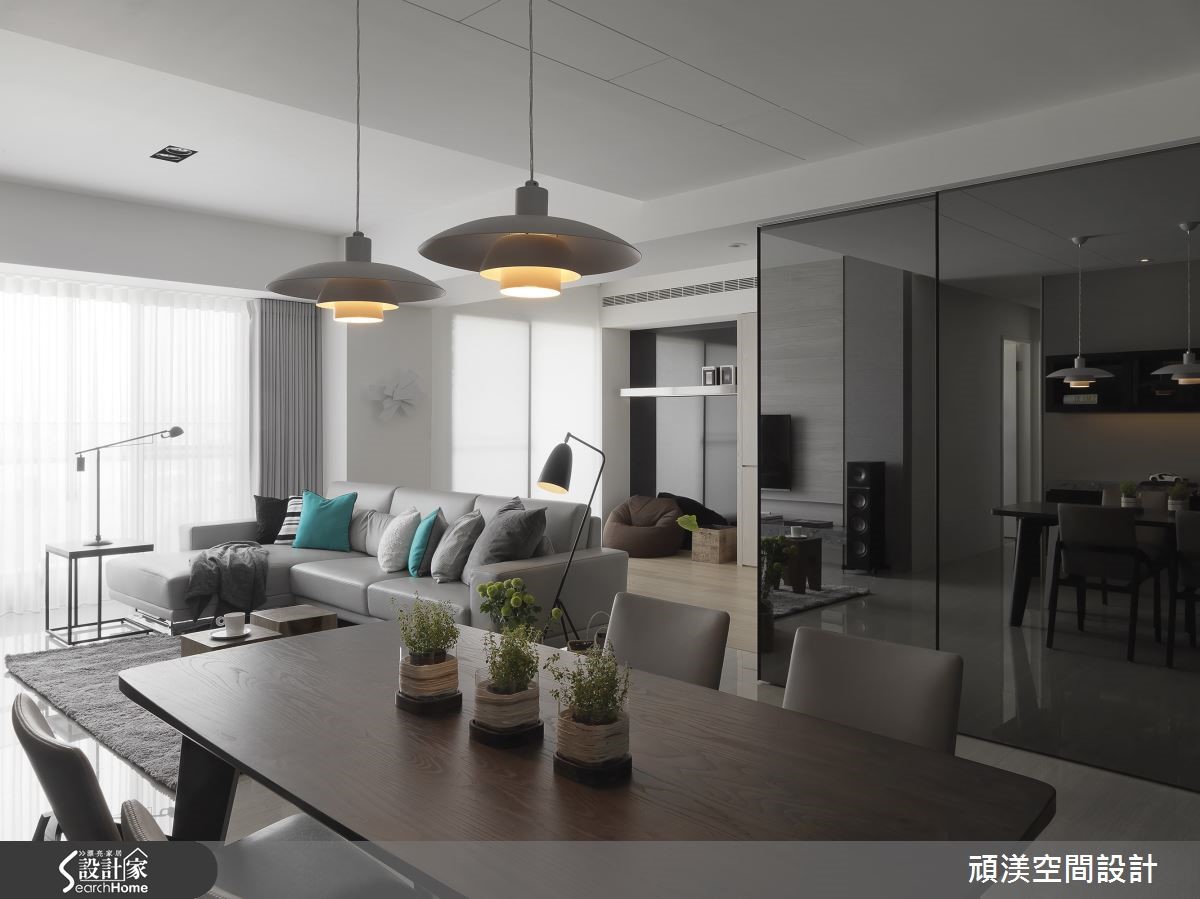 美式风格不一定得予人奢华、典丽且难以亲近的感受。顽渼设计团队以利落简约的现代风为基底,融合美式的均衡与沉稳,为一家四口创造温馨、机能兼具的132平住宅。 【开放设计,空间互动更紧密】客厅以色调轻柔的灰色为主,沙发、地毡与落地窗帘比例合宜,搭配线条利落的铁艺落地灯与复合材质边桌,形成恰如其分的冲突美感。开放设计使一家四口的共同空间更加紧密,客厅后方铺设木质地板的休憩区域搭配木制柜与灰镜,低调的反射影像使视觉空间放大。从客厅延伸至餐厅的动线温馨却不显局促,餐厅同样以灰镜为主墙,沉稳清凉的颜色提高用餐舒适度,铁件与木作结合长桌延续客厅的复合式家具,让混搭元素镶嵌其中,搭配白色吊灯,带来简洁明快的气息。开放的厨房设计,以吧台串联餐桌与一字型厨具,也让父母无论身处何处皆能照看孩子活动的状态。转而进到卧室,空间以清爽明亮为主调,主卧运用银灰色的雕花墙纸,次卧壁面则涂上湖水绿,营造优雅清新气息。