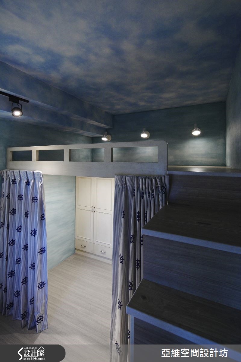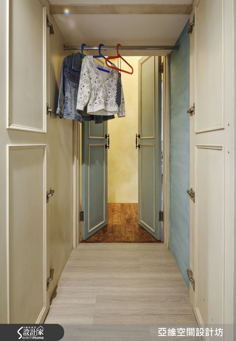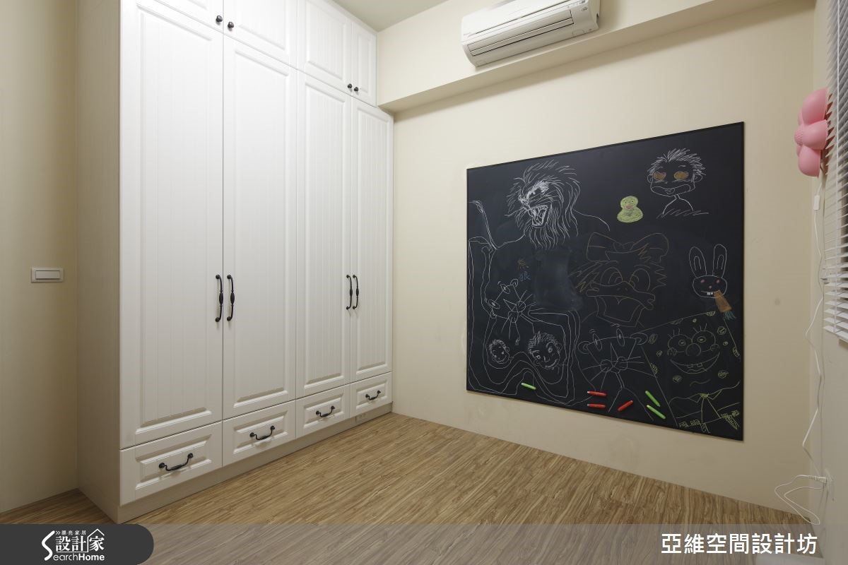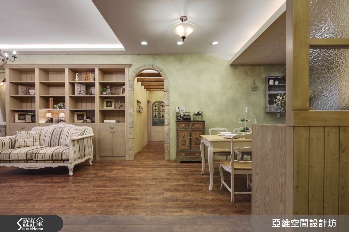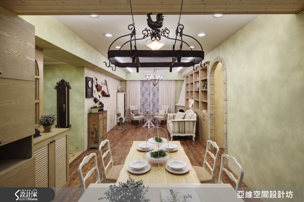 育有3个想象力十足、活泼可爱的孩子,屋主夫妻在规划喜爱的南法乡村风格时,也不忘尊重孩子们的想法与意见,将儿童房依据孩子的想望打造成梦幻的欢乐园地,让家成为充满亲情与温馨的所在。【仿古家具与壁炉,营造南法气氛】善用新旧柜体的巧妙融合与粉刷技巧,让收纳机能得以提升,客厅以全然木作材质与粉绿色墙面,搭配欧式仿古家具与拟真造型壁炉,打造南法气息。设计师以开放式客餐厅设计与贴合壁面的收纳柜体为设计重点,让全家人拥有宽敞空间。【孩子的奇幻乐园,藏有大量收纳】通过石质拱门,进入通往奇幻乐园的通道,带着粉橘色的照明自木栅间隔中流泻,敲开粉蓝色的精致线板双开拉门,便可看见晒衣横杆,彷佛走进了电影中的魔衣橱,除了完成孩子的梦想外,更具备真实的挂衣功能。【涂鸦墙设计,尽情发挥创意】设计师将孩子们的卧处架高,卧铺与楼梯下方的空间配置了大型的层迭设计衣柜与收纳机关,甚至提供孩子们尽情涂鸦的壁面,天花则漆上天堂般的梦幻轻软云朵与蓝天,带着孩子航向梦境,成为货真价实的魔法屋。