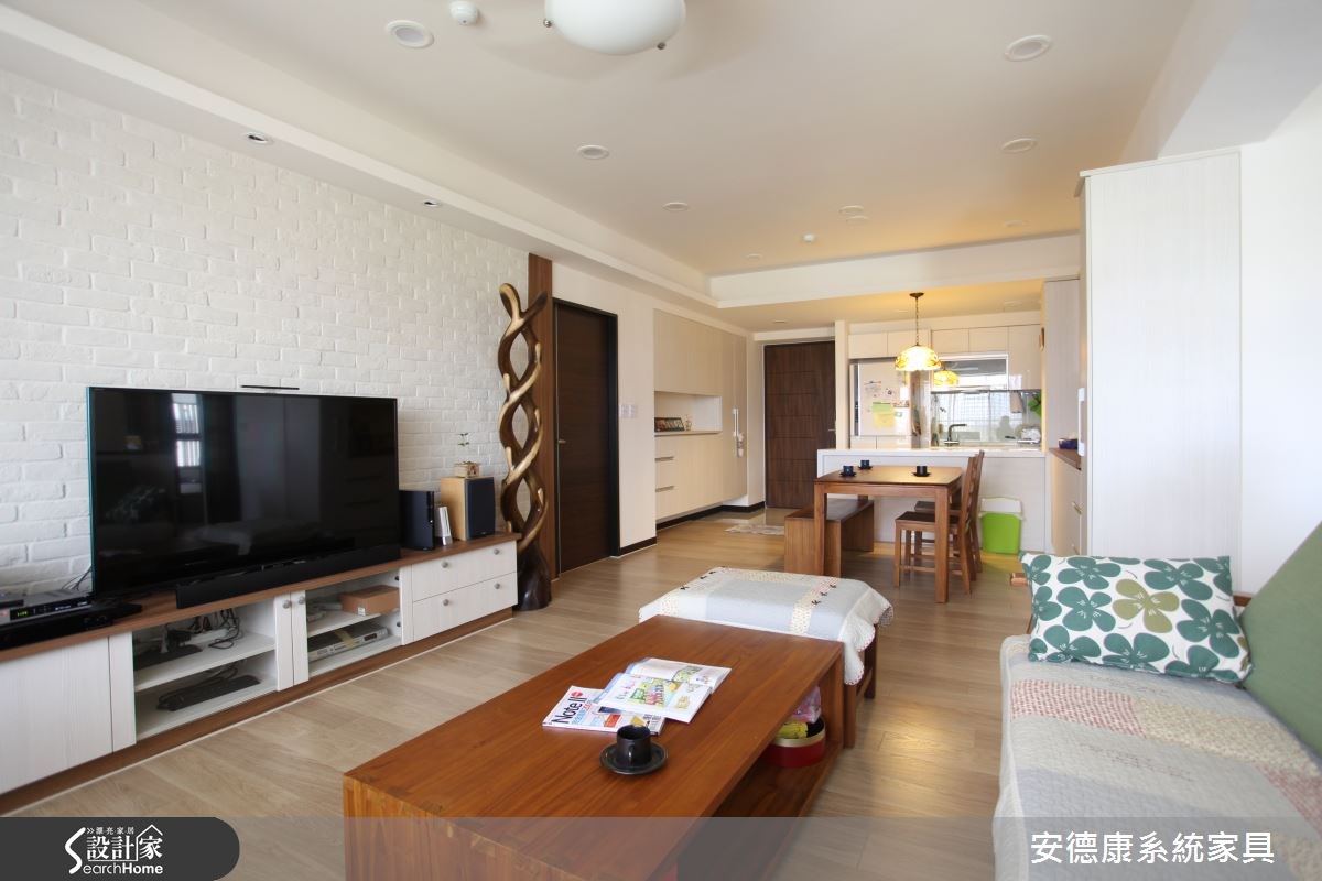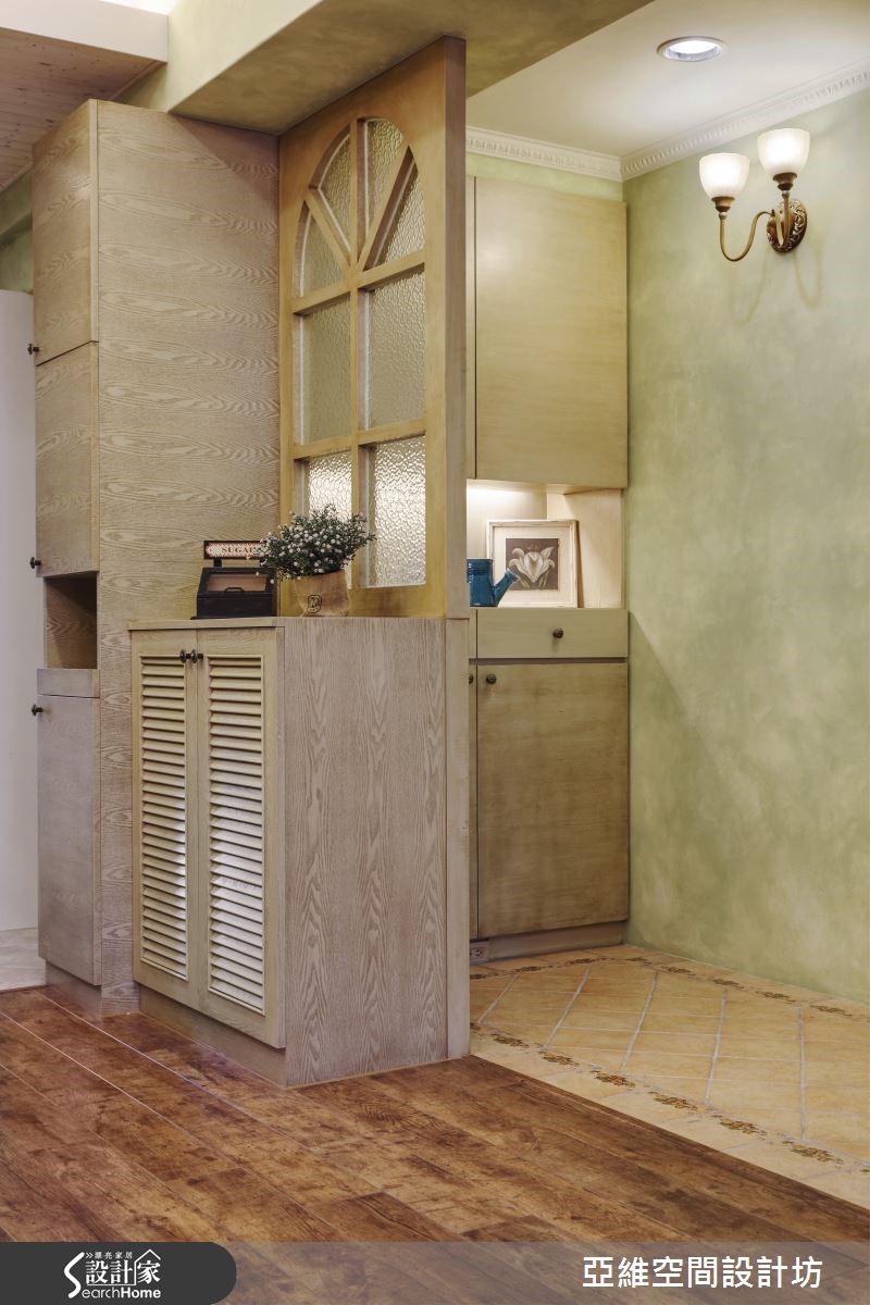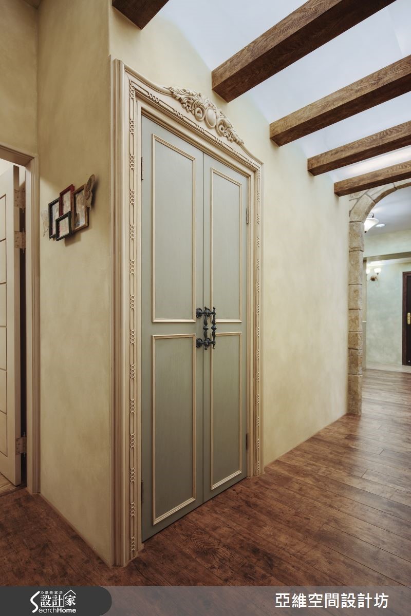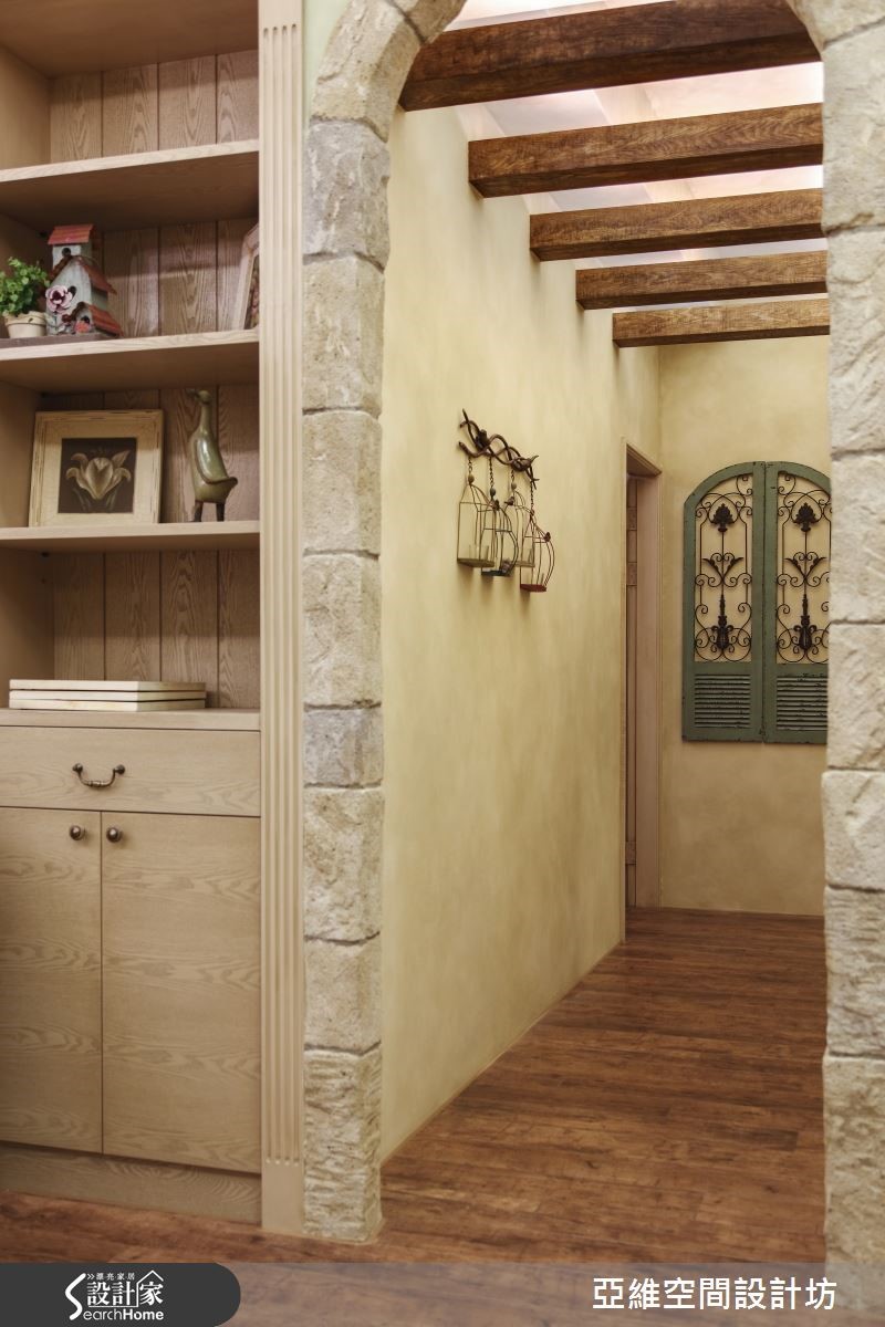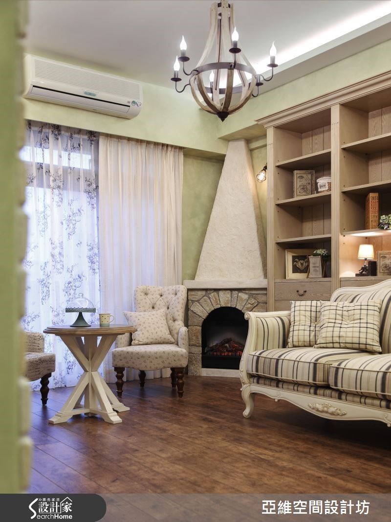 育有3个想象力十足、活泼可爱的孩子,屋主夫妻在规划喜爱的南法乡村风格时,也不忘尊重孩子们的想法与意见,将儿童房依据孩子的想望打造成梦幻的欢乐园地,让家成为充满亲情与温馨的所在。【仿古家具与壁炉,营造南法气氛】善用新旧柜体的巧妙融合与粉刷技巧,让收纳机能得以提升,客厅以全然木作材质与粉绿色墙面,搭配欧式仿古家具与拟真造型壁炉,打造南法气息。设计师以开放式客餐厅设计与贴合壁面的收纳柜体为设计重点,让全家人拥有宽敞空间。【孩子的奇幻乐园,藏有大量收纳】通过石质拱门,进入通往奇幻乐园的通道,带着粉橘色的照明自木栅间隔中流泻,敲开粉蓝色的精致线板双开拉门,便可看见晒衣横杆,彷佛走进了电影中的魔衣橱,除了完成孩子的梦想外,更具备真实的挂衣功能。【涂鸦墙设计,尽情发挥创意】设计师将孩子们的卧处架高,卧铺与楼梯下方的空间配置了大型的层迭设计衣柜与收纳机关,甚至提供孩子们尽情涂鸦的壁面,天花则漆上天堂般的梦幻轻软云朵与蓝天,带着孩子航向梦境,成为货真价实的魔法屋。