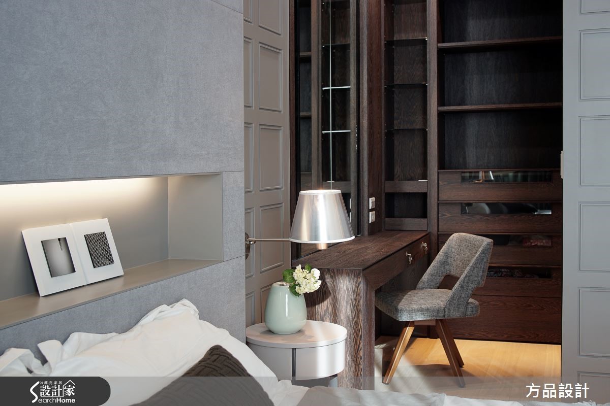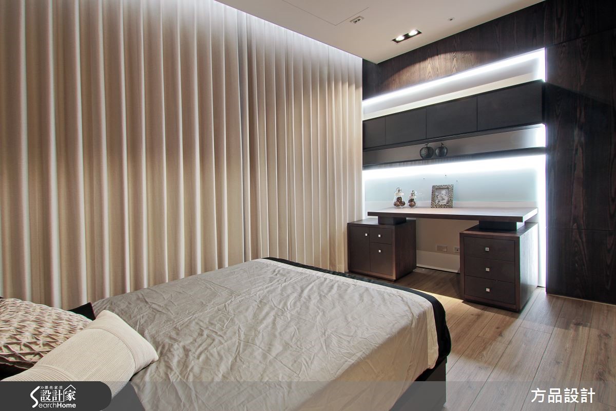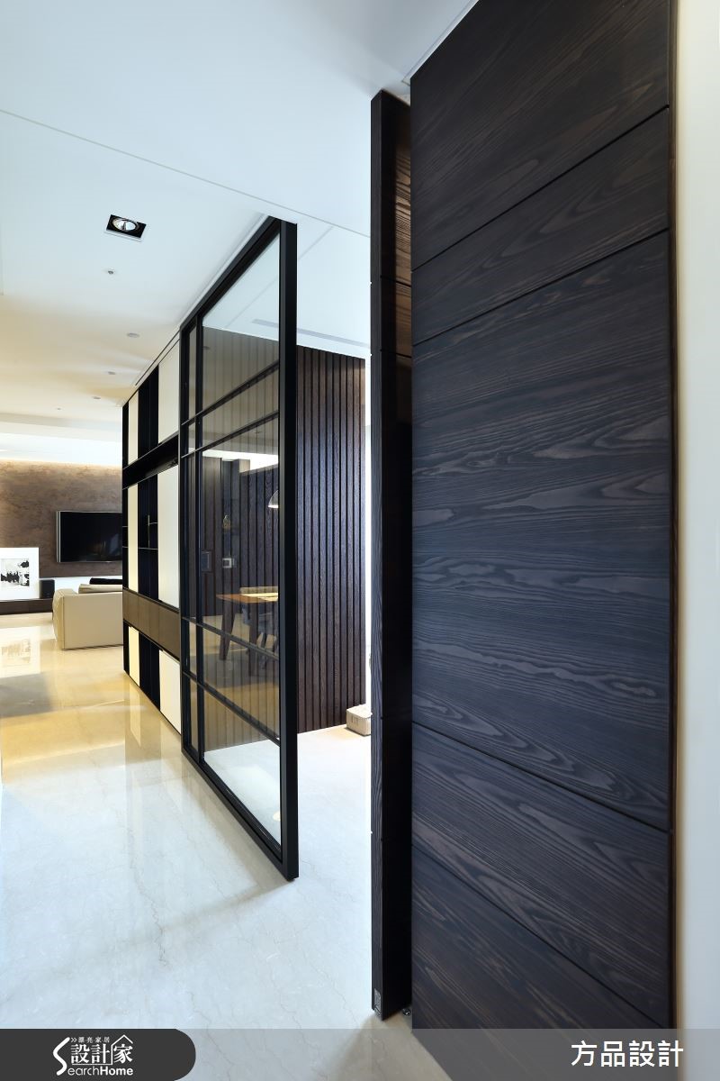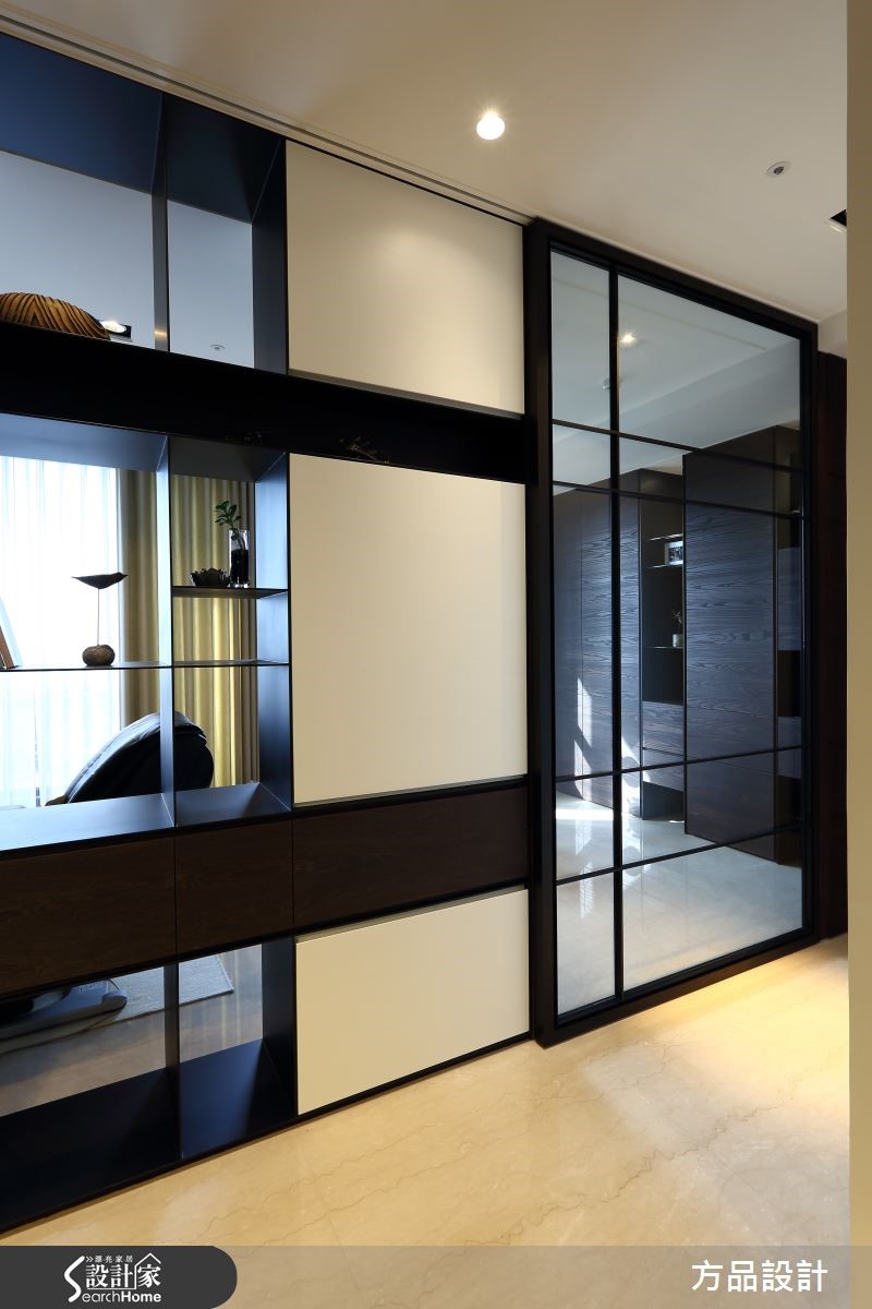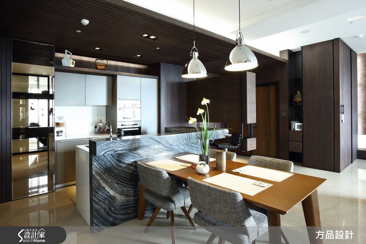 158平方米的空间内共拥4室2厅;利用不同纹理的深木质、大理石材打造出沉稳又带尊贵感的现代居家空间,令人置身屋中有如来到星级酒店的错觉。 【浅色大理石,平衡深色柜厚重】大门采特别的双门设计搭配金属门把营造气势。漂浮的玄关柜搭配灯光成为视觉端景。整个入口区以同色调的深木材质为围塑,但藉由不规则的木质纹理挥洒厚实、低调的大器之感。由于玄关区与客厅以深色木作为主要呈现,于是将整个公共区透过米白色地板串联来平衡重色系的沉闷感,再藉由电视墙和厨房中岛的石材铺面纹理增添变化,展现稳重却又高贵的内敛质感。餐厨空间以大面积的展示柜与融入铁件的玻璃门与客厅稍作区隔,屏除一般的餐厨规划,以大理石吧台为主,搭配温润的木方桌,看似对比却达到一种空间氛围上的平衡。