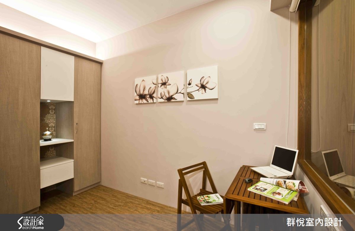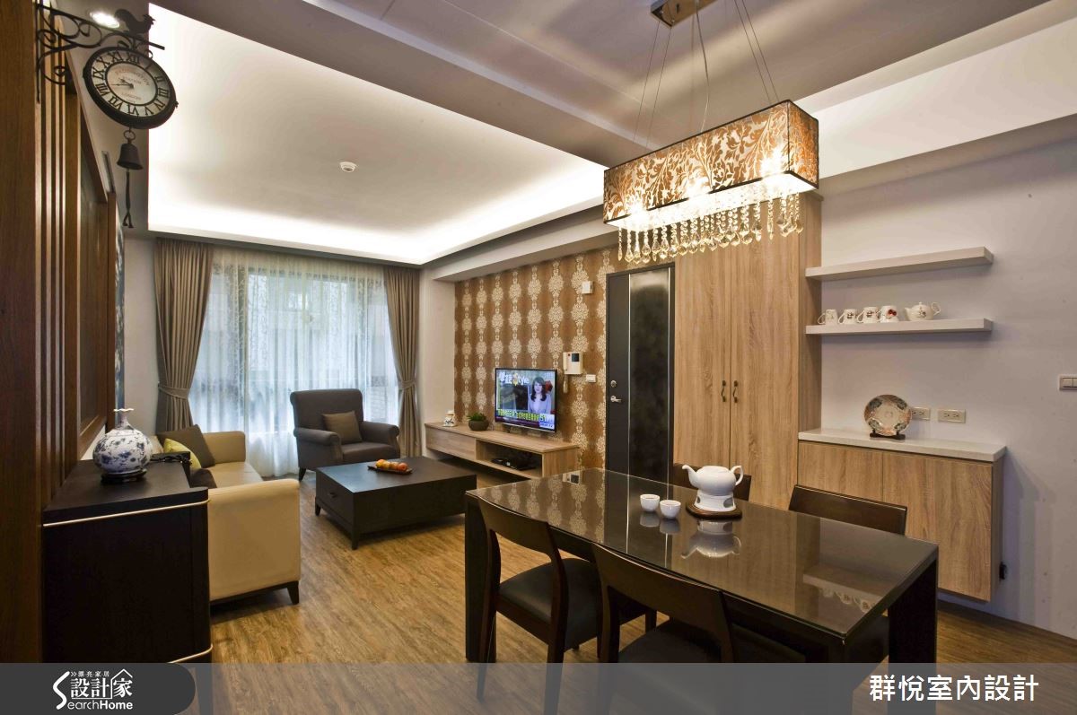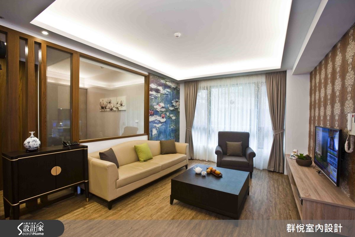 一打开门,温润的木质调与柔和灯光调和出满满的舒适与温馨感。开放式的设计将客厅、餐厨连结,视野更加开阔;重视隐私的的书房空间则以大面玻璃带来视觉穿透效果,并保留空间感,让家的温暖洋溢在每个角落。 【温润木色,奠定沉稳调性】使用木元素、墙纸与板岩砖,打造99平方米空间。客厅以木材质的暖色为基调,全室铺陈木地板,流露安静典雅的气息。在家具布置上,以明度较高的米色长沙发与荧光绿抱枕增加亮点,后方的大型艺术画作则点缀了人文气质。来到用餐区,雅致的灯盏点亮用餐的氛围,整片收纳柜收藏屋主的美酒与生活点滴,同时也有隔绝厨房油烟的实用机能。设计师以板岩砖打造卫浴,镶嵌金框的镜面彷佛让人回到文艺复兴时期,干湿分离的设计则让使用更安全。