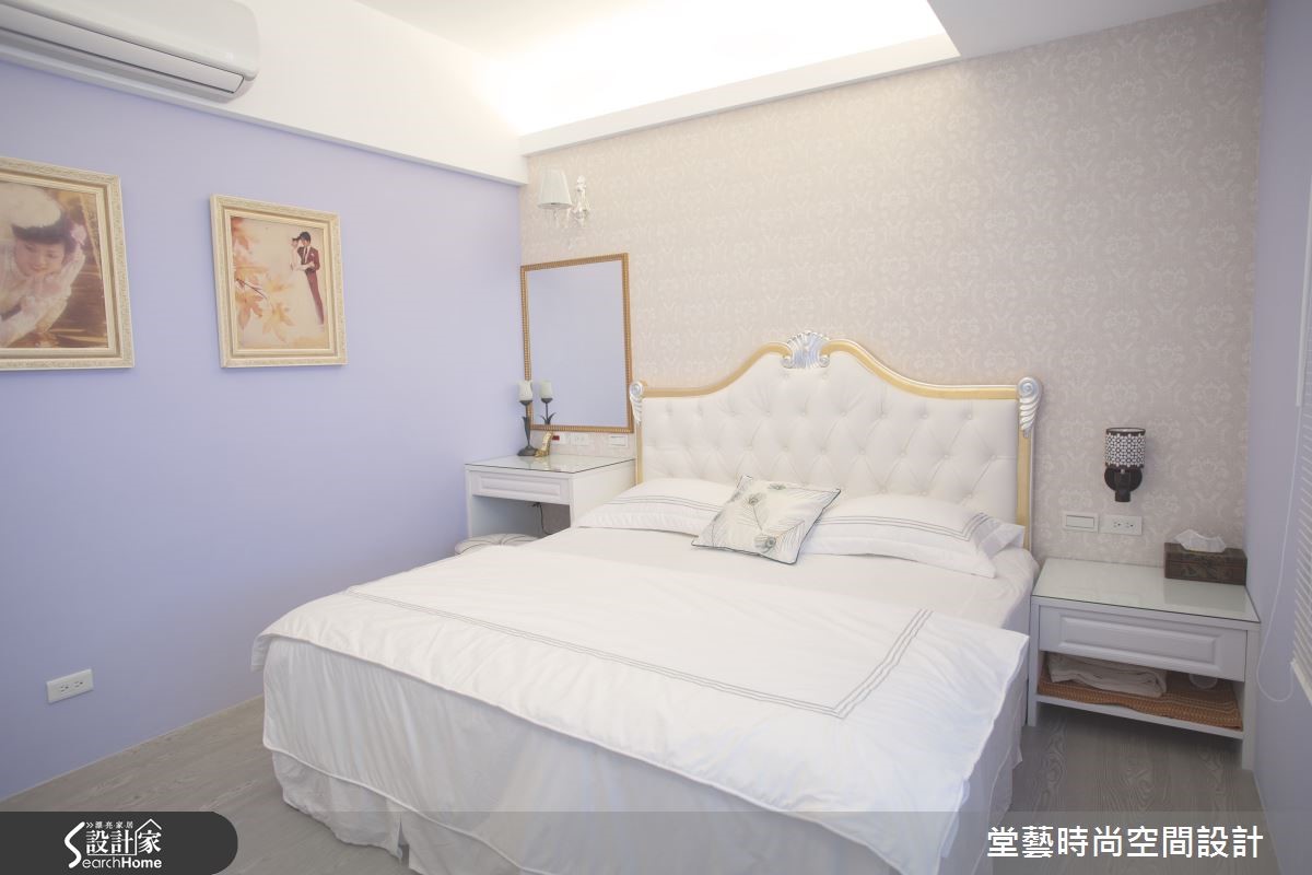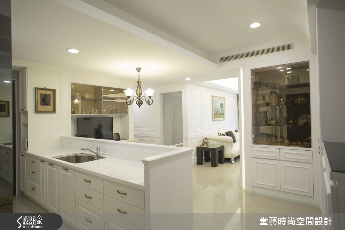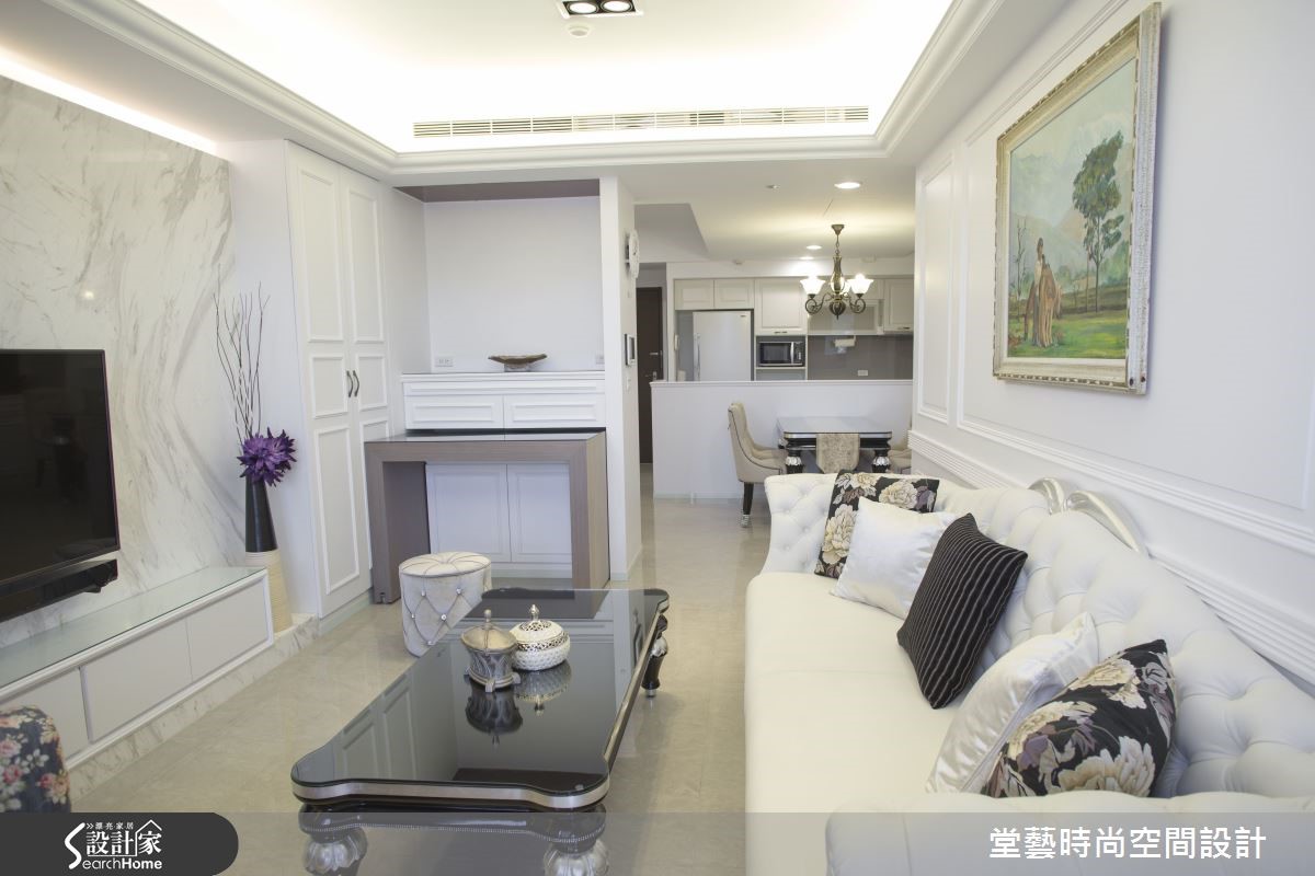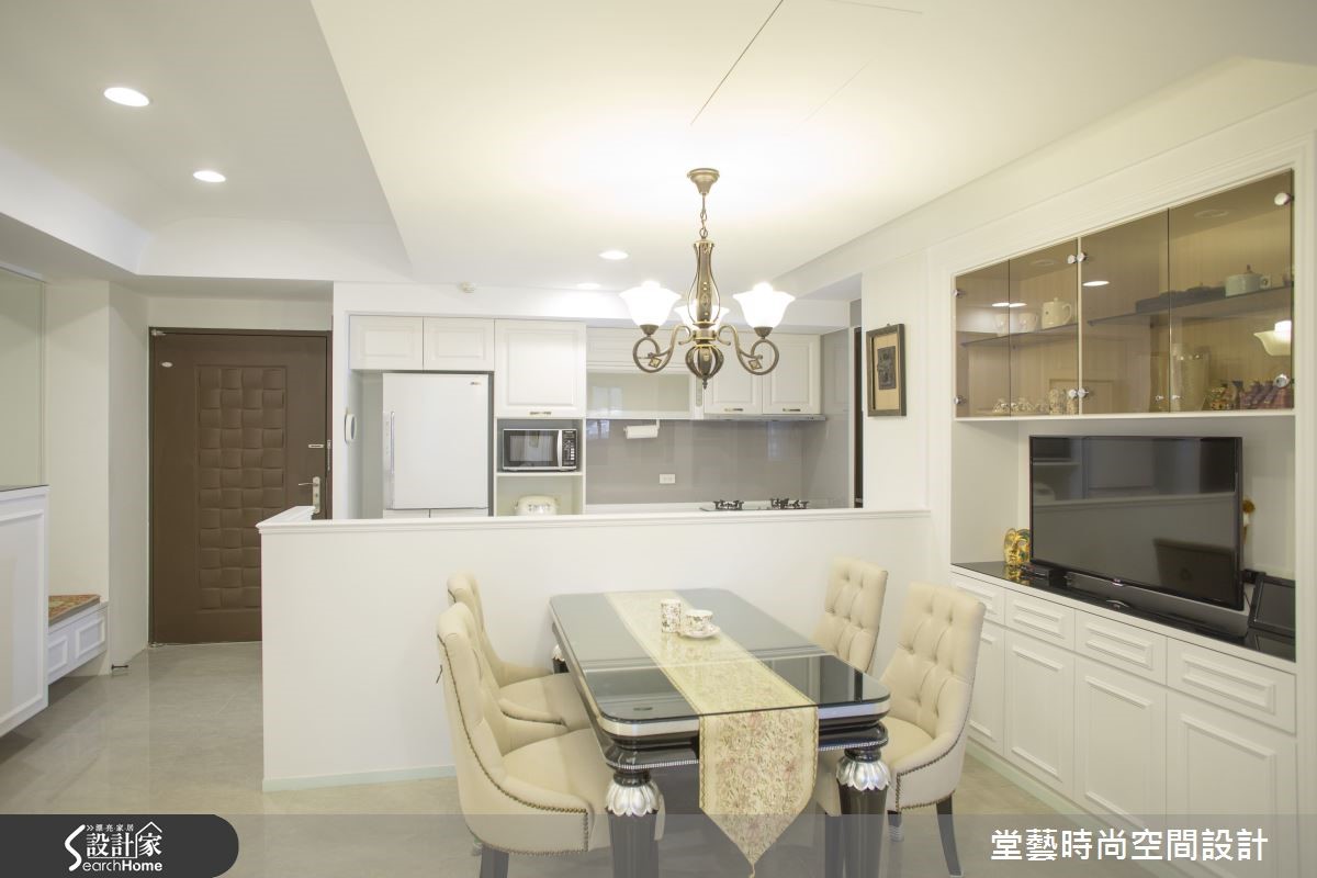 92平方米的居家注入了新古典与乡村风格,透过建材、家饰的混搭运用,满足屋主对住宅的期待。空间中,以简洁白色作为基调,并点缀线板滚边提升空间层次,搭配具乡野气息的碎花图腾,使精致居所也饱含温馨质朴。 【茶玻增添稳重、呼应家饰配色】客厅采浅色作为定调,以白色大理石材建构电视墙,于立面、天花板等处点缀雕花线板,型塑精致的新古典气息,并把乡村风单椅完美融于空间中。一旁则开窗纳进自然光源,搭配暗藏间接光源,以流动光线丰富空间使居宅更轻盈。用餐空间中,则采半墙界定厨房与餐区,维持视觉、光线的流动,并摆放呼应客厅桌几的同款餐桌,搭配古铜色造型灯饰,增添优雅内敛的温度,而居宅中的柜体则多采以茶玻柜门设计,不仅形成自然通透的视觉,也达成展示功能。卧房则以熏衣草色作为墙面基底,床头板与镜面则加入金属框线,衬托精致质感,且透过合宜的尺寸衡量,将电视内嵌于线板柜体中,做出完美的机能整合。