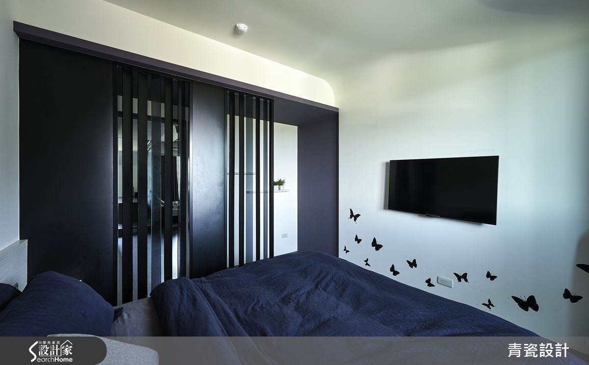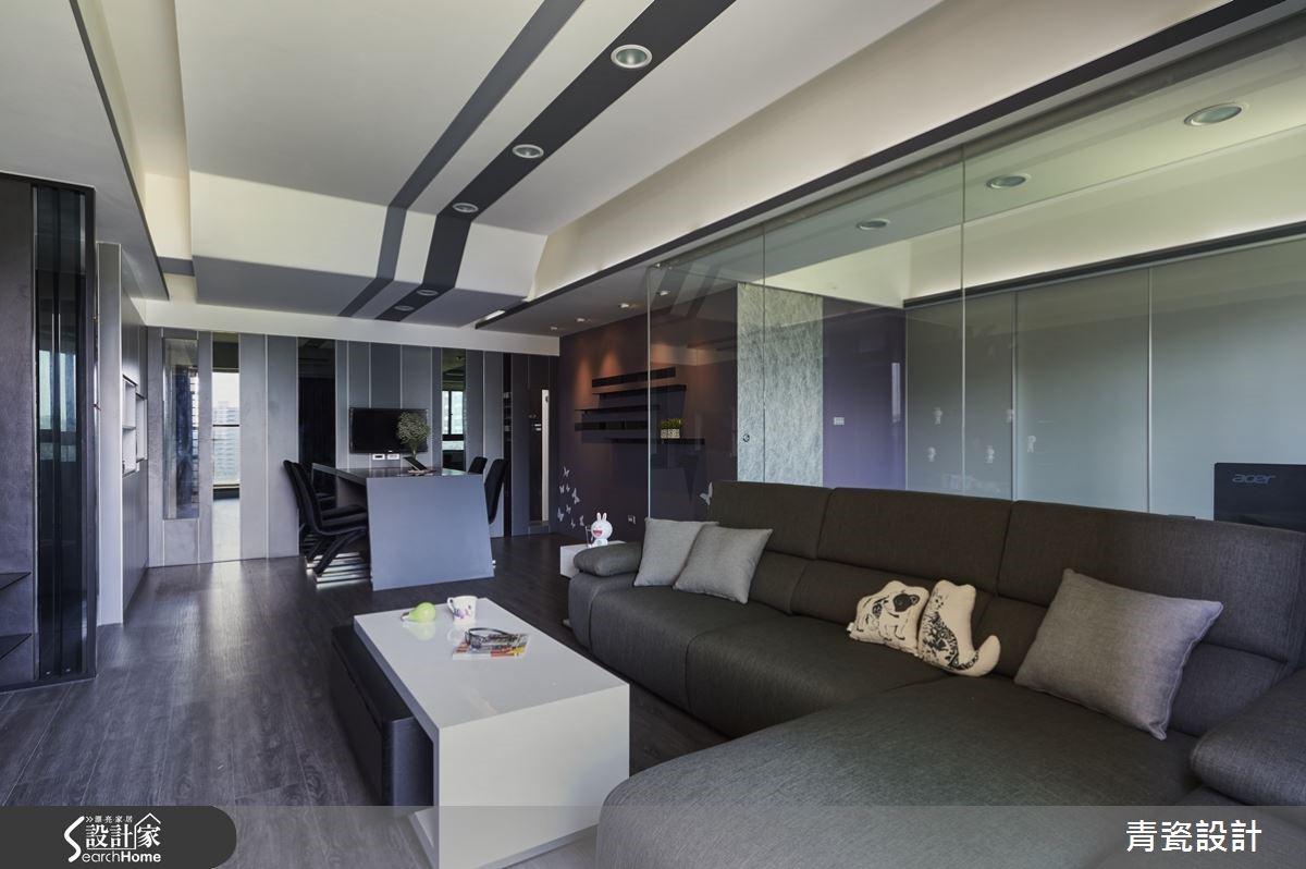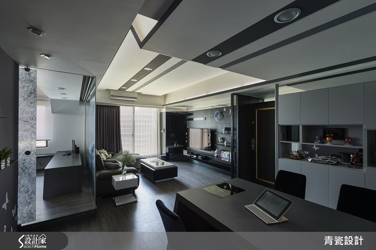 屋主为一位单身男性,因本身喜爱沉稳的居家调性,但也期望家中可添入时尚气息。于是设计师以深色作为整体基调,加入黑铁、黑镜、明镜、黑玻、美耐板等材质,建构稳重的现代风格。同时让收纳机能整合集中,营造简洁格局与利落线条。【黑镜和铁件,刻划空间线条】空间中以深色木地板铺述全室,营造温润沉稳的氛围。并采深黑色定义电视墙,构成阳刚稳重的视觉印象,佐以黑镜材质、金属元素,运用材质映像光影的特质,彰显时尚科技感。同时包覆天花板,隐藏客、餐厅之间的横亘梁体,并结合嵌灯作出延伸线条串联空间,勾勒现代风的美感张力。而书房、客厅之间则舍弃实墙,规划清玻隔断,化解视觉隔阂感,让光线与视线可相互流动。餐桌结合了会议、用餐、工作等主题,一旁则以镜面、线条铺陈墙面,或是于典雅紫墙加入黑色层架设计,形成充满线条层次的立面表情。延伸进入私领域,则规划双向入口,一侧通往更衣间,一侧可通往睡眠区。并拆除制式的门片,打造流畅宽阔的行进动线。