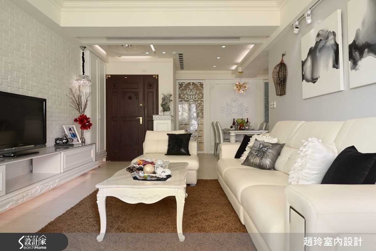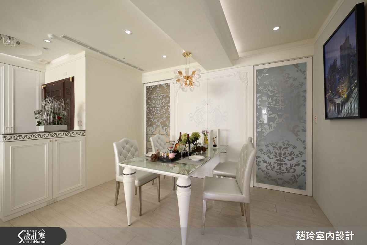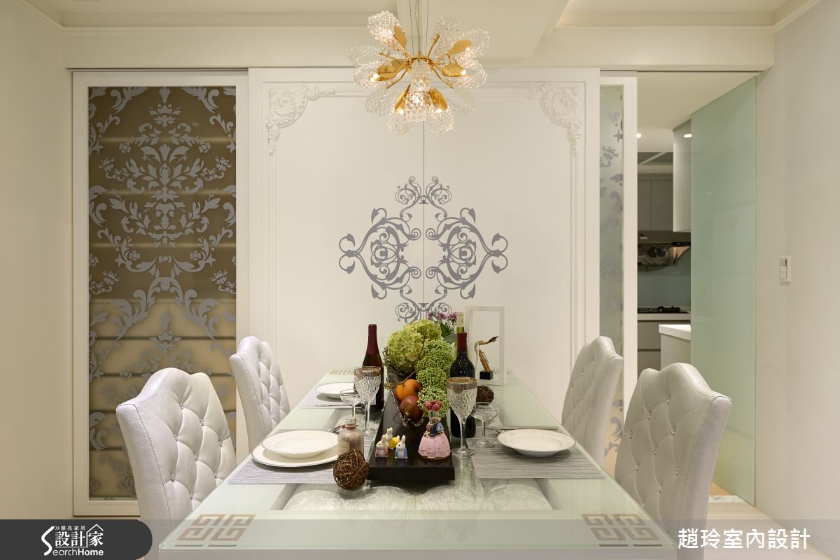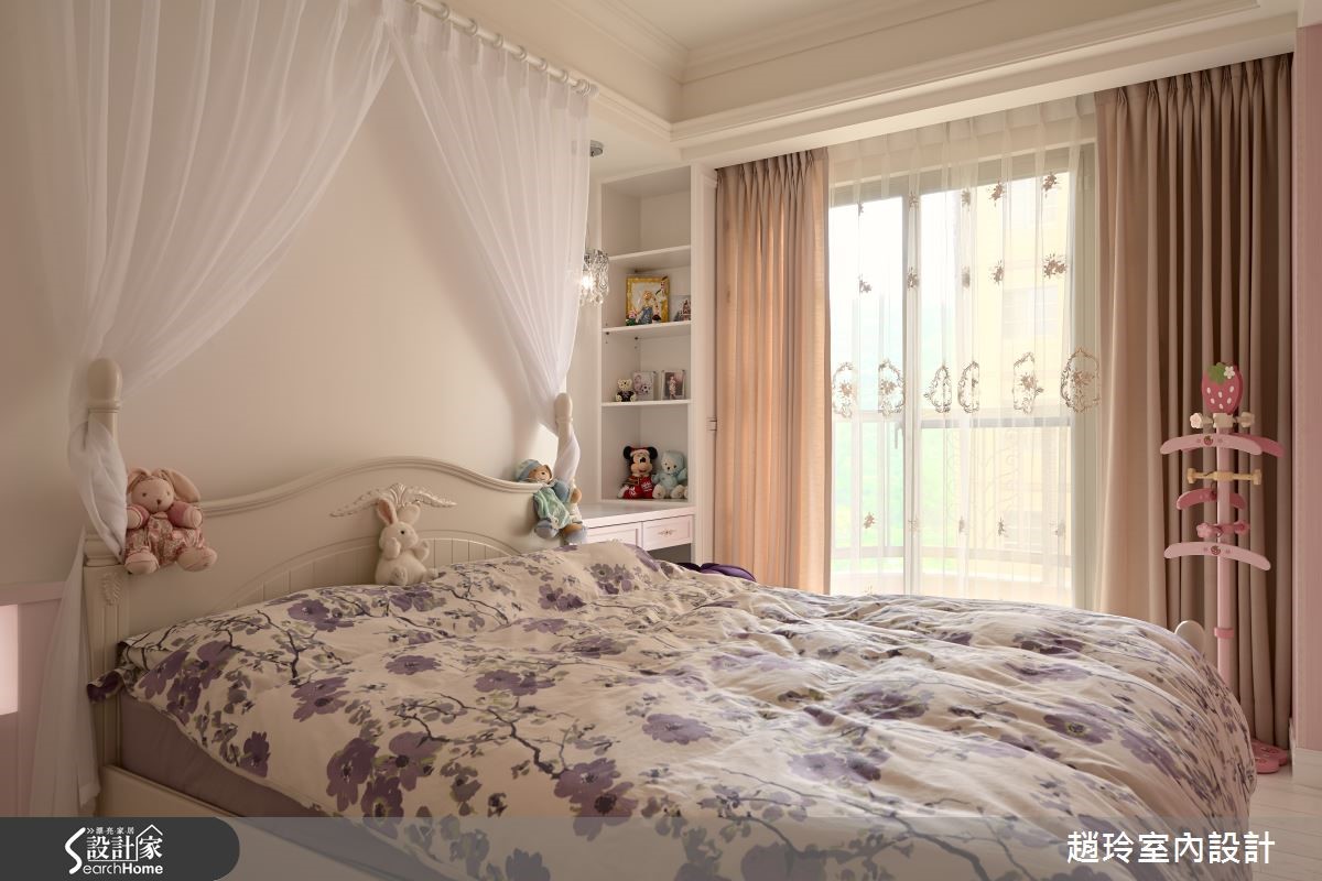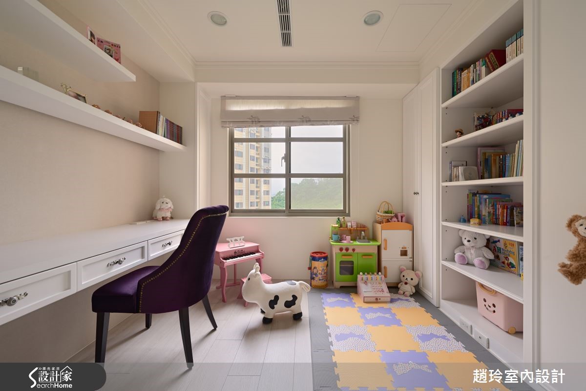 屋主夫妻在9年前购屋时未细想动线规划,随时间过去原有格局已不符全家人生活需求,因此设计师保留原有房屋结构,并配合妻子与女儿需求,注入许多女性化元素,将二手房改造成焕然一新的甜美居宅。 【重启格局对话,满足全家的需求】贴心的丈夫以妻子的意见为主,在房屋各处引入粉嫩色调与精致单品,客厅天花板的美式造型线板搭配奶油色调仿古家具,打造新古典气息空间,而文化石电视墙与灰阶沙发背墙上的投射照明,则为客厅增添美术馆般的氛围。针对没有玄关的空间,设计师在餐厅与大门处设置花纹矮柜,兼具收纳及分界功能,餐厅上方的水晶吊灯与图腾墙面皆是精致花朵造型,厨房与收纳空间则隐藏在雕花门片后,维持视觉上的美观与优雅。富有典丽气息的主卧还特别为女主人建置了造型梳妆台,房门一开就可以和宝贝女儿在阅览与游戏功能兼具的儿童房尽情玩耍;而女儿房则利用马卡龙色调与纱幔给予小女孩一个柔嫩的梦。