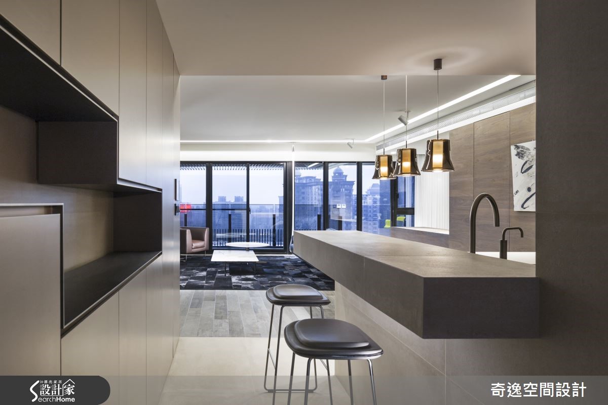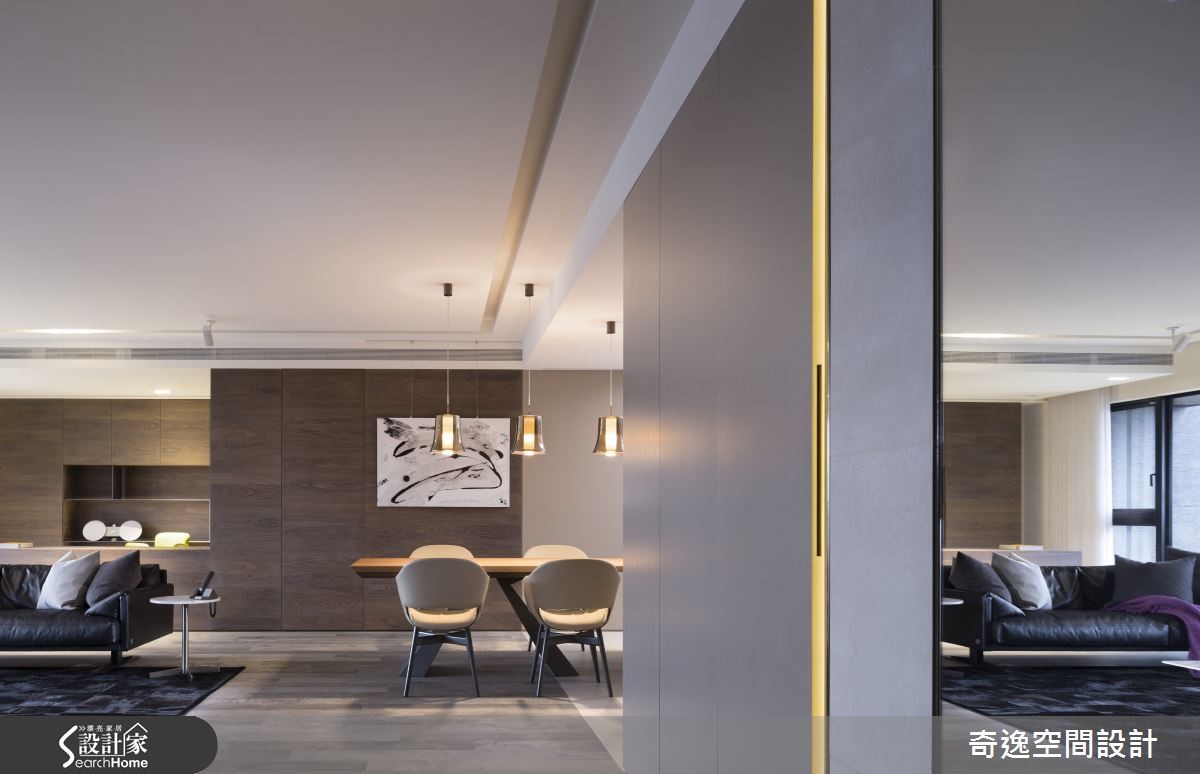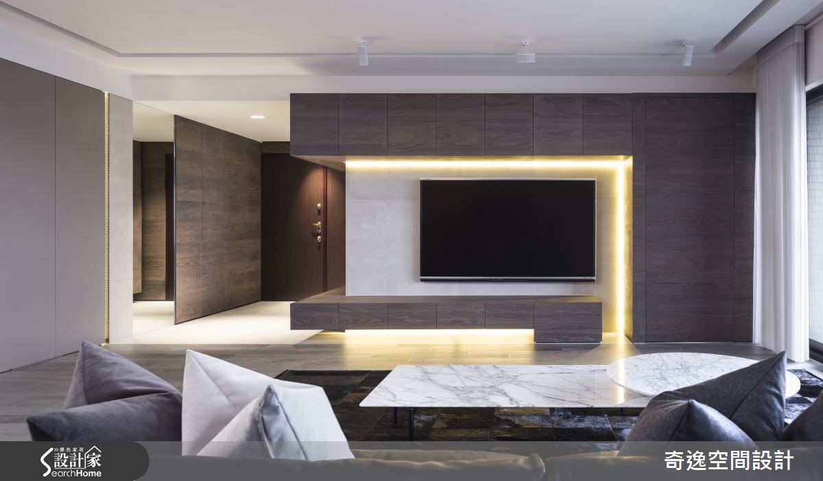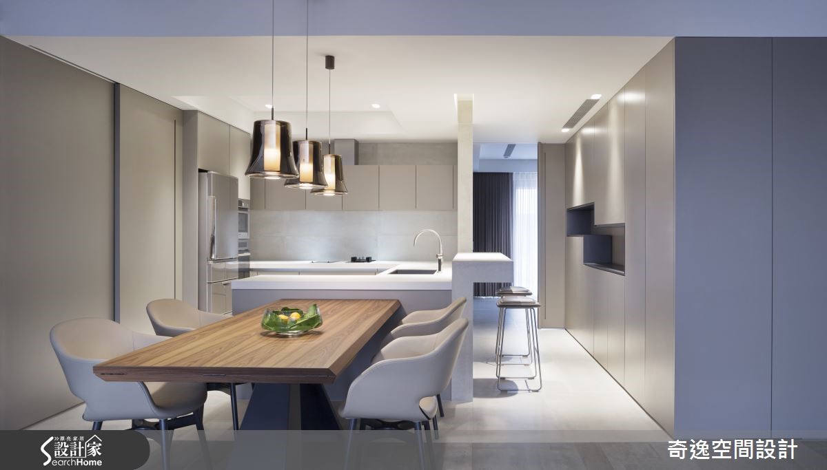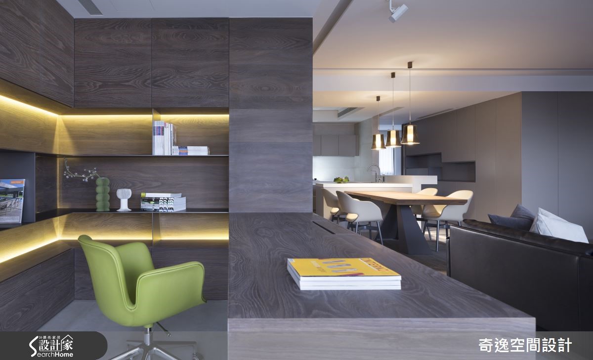 ”专注完美,近乎苛求“是设计师与女企业屋主的代名词,对于细节的精准掌握有志一同的两人,利用无缝空间与推油上漆的精细手工,打造低调奢华的名流质感居家。 【L型造型照明,型塑酒吧氛围】由实木贴皮包覆的电视墙自玄关延伸至客厅,穿过巧妙设置的立墙镜面,搭配灰阶木纹砖,使空间有着无限延伸的效果。设计师将电视墙凹槽内部嵌入L型造型照明,让墙面有着宛如高档饭店里的酒吧氛围。由屋主特别挑选、色调沉稳的沙发在阳光的照射下显得温润大器,一旁的垂坠式照明与缤纷单品透露出屋主的不同凡响的品味,成熟中带着前卫。客厅后方的阅览空间将墙面与书桌进行一体成形的包覆,顺应柜体外形的内嵌照明与电视墙相互呼应。开放式餐厨分别有着木作与现代感交融的质调,雾面瓷砖由地板通过壁面延伸至天花,使整体空间浸润于不同风格中,吧台背墙的内凹设计兼具收纳与展示功能。卧室以色调清新的简约风格为基底,为力求简洁的屋主打造清爽的舒眠空间。