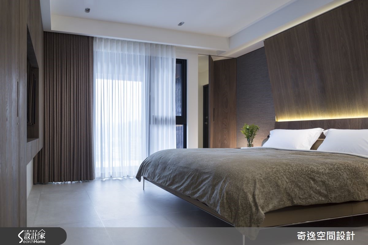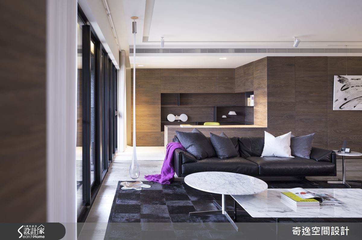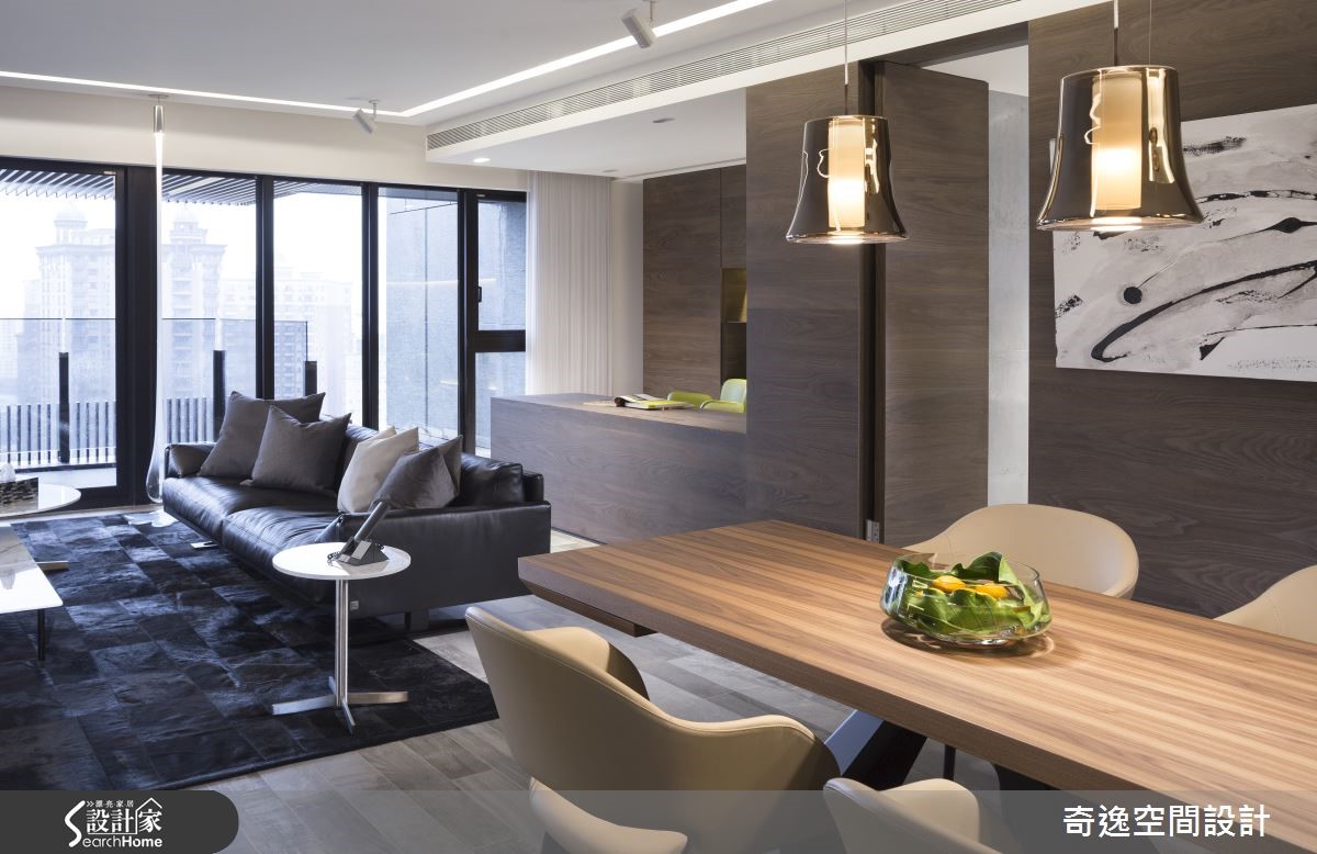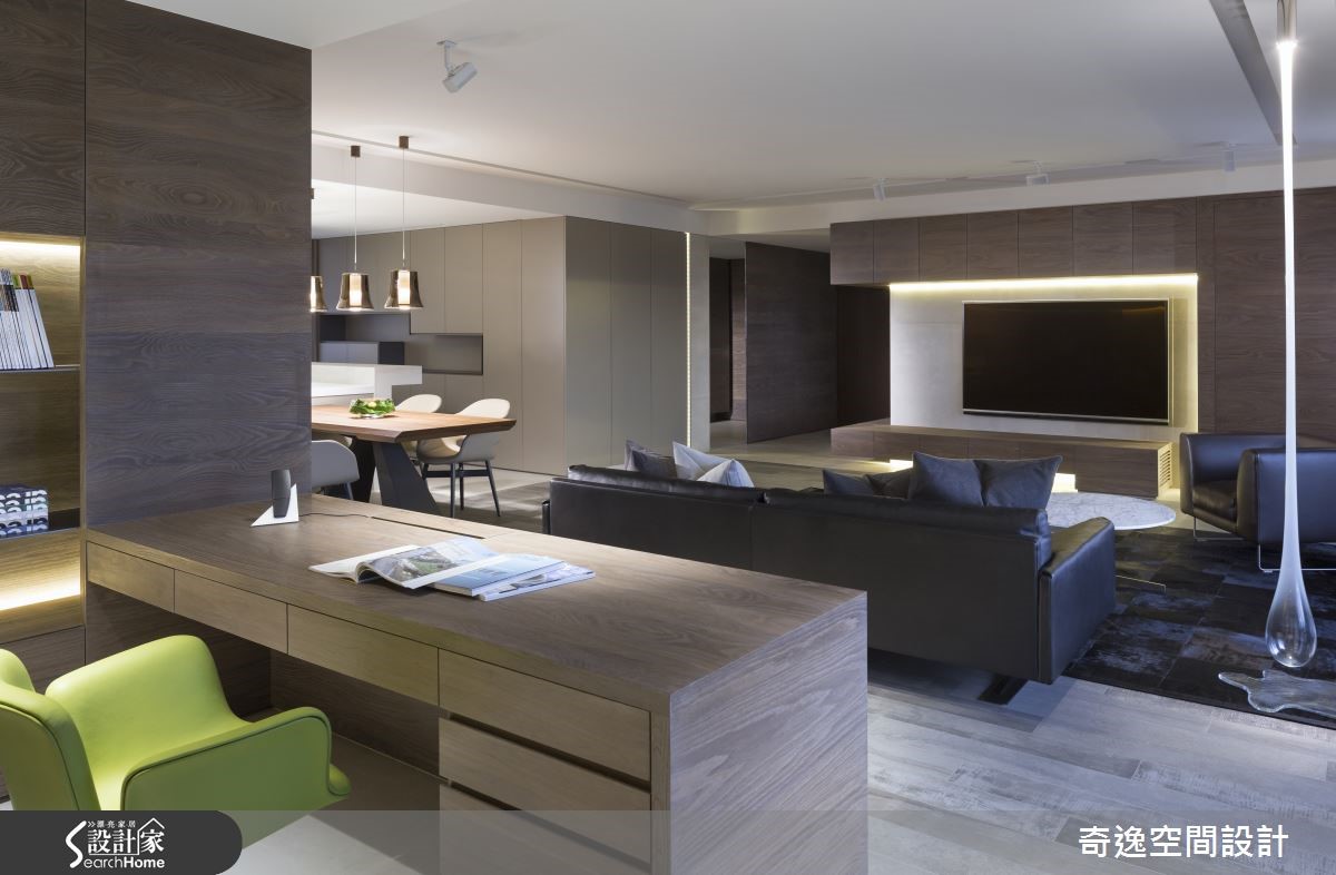 ”专注完美,近乎苛求“是设计师与女企业屋主的代名词,对于细节的精准掌握有志一同的两人,利用无缝空间与推油上漆的精细手工,打造低调奢华的名流质感居家。 【L型造型照明,型塑酒吧氛围】由实木贴皮包覆的电视墙自玄关延伸至客厅,穿过巧妙设置的立墙镜面,搭配灰阶木纹砖,使空间有着无限延伸的效果。设计师将电视墙凹槽内部嵌入L型造型照明,让墙面有着宛如高档饭店里的酒吧氛围。由屋主特别挑选、色调沉稳的沙发在阳光的照射下显得温润大器,一旁的垂坠式照明与缤纷单品透露出屋主的不同凡响的品味,成熟中带着前卫。客厅后方的阅览空间将墙面与书桌进行一体成形的包覆,顺应柜体外形的内嵌照明与电视墙相互呼应。开放式餐厨分别有着木作与现代感交融的质调,雾面瓷砖由地板通过壁面延伸至天花,使整体空间浸润于不同风格中,吧台背墙的内凹设计兼具收纳与展示功能。卧室以色调清新的简约风格为基底,为力求简洁的屋主打造清爽的舒眠空间。
