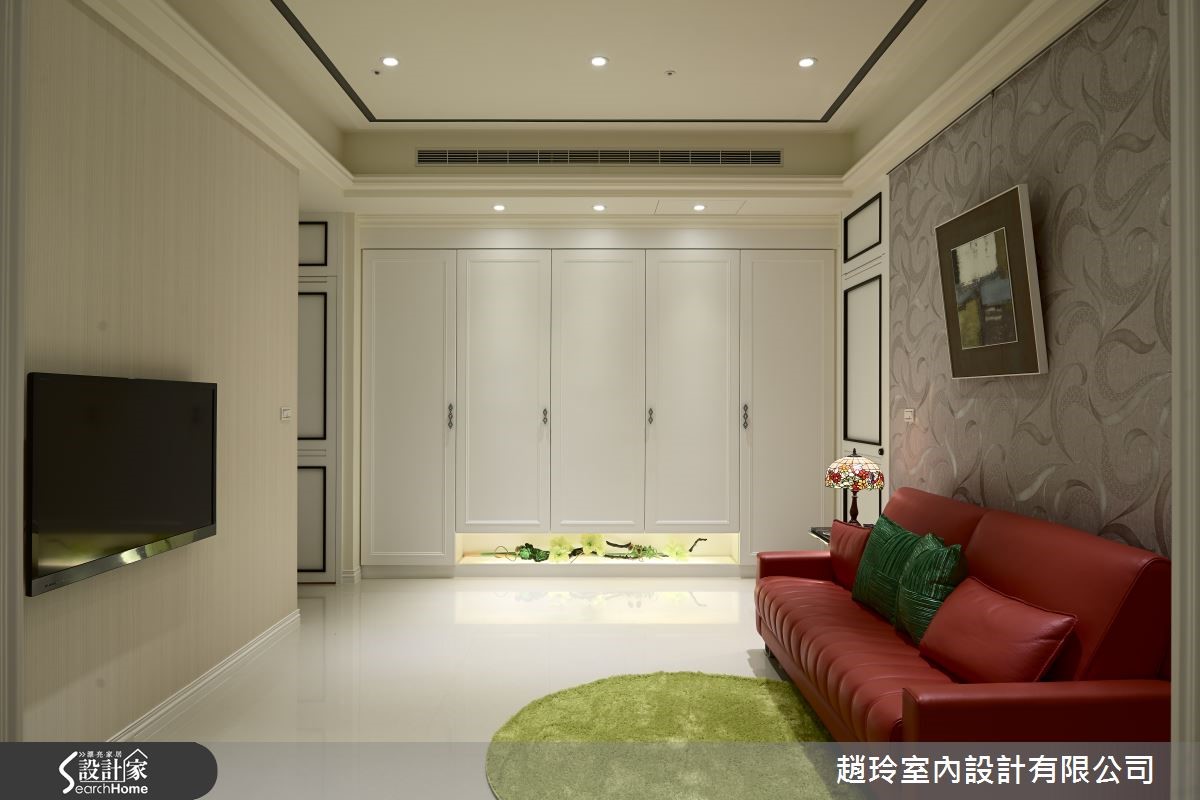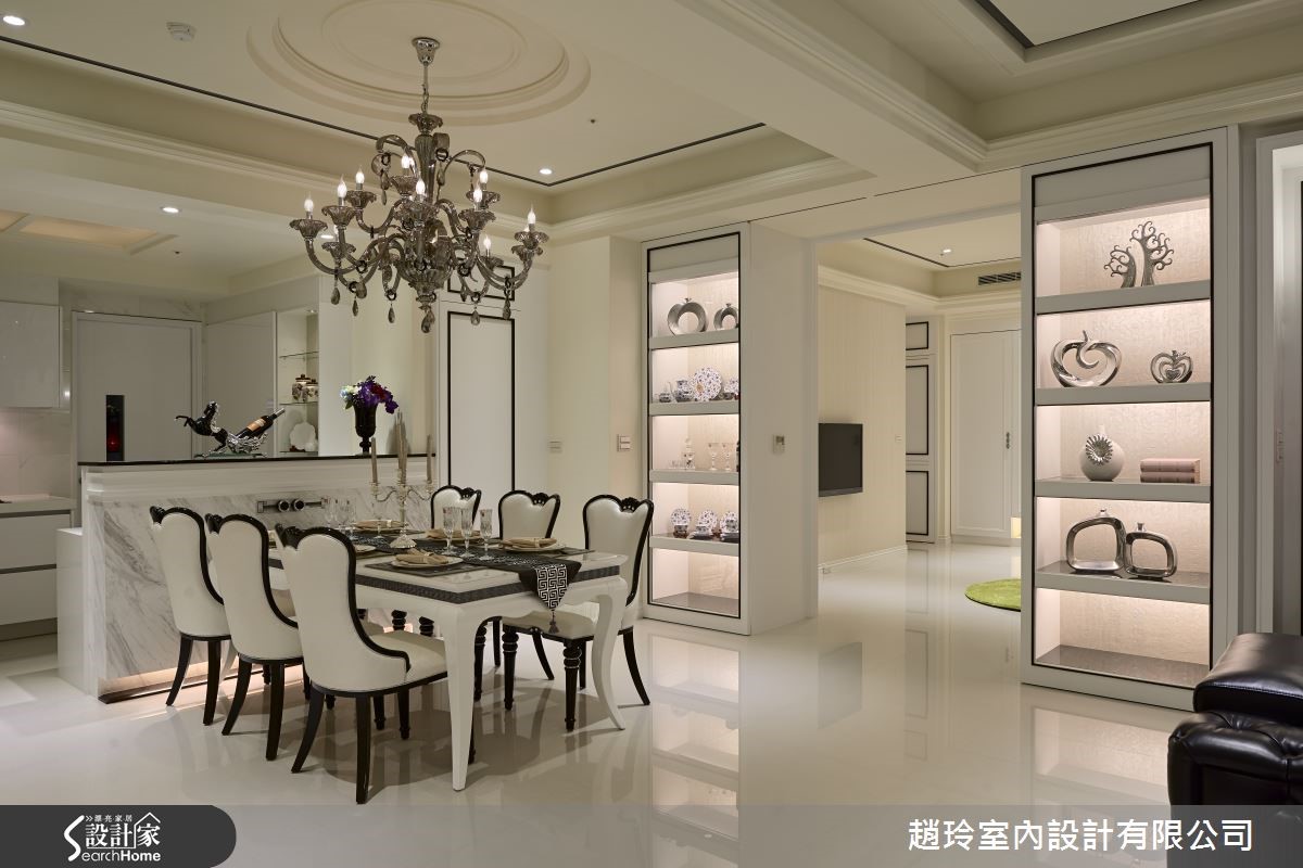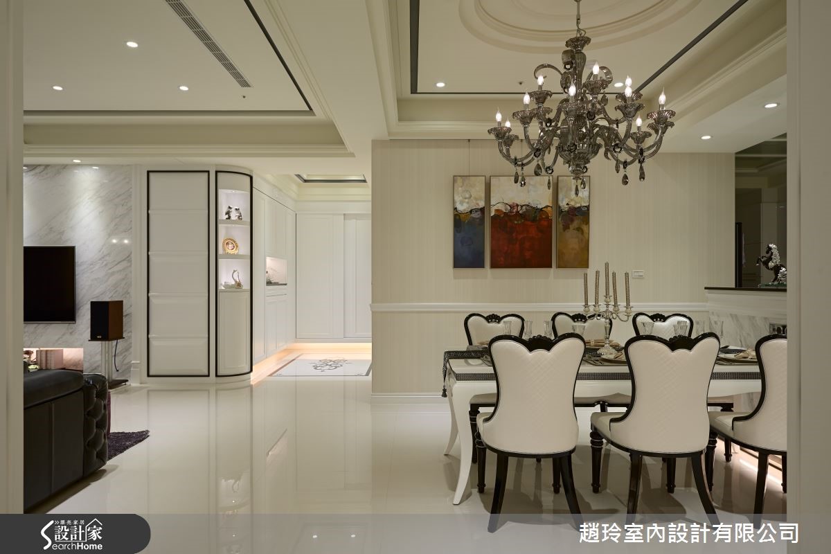 充满贵气、优雅之感的新古典装潢,常让人一踏入便感受到其强烈的特质与氛围,彷佛有种同时置身18世纪与21世纪的交错感。330平方米的空间内以全白为主色调,原汁原味地呈现出新古典的态度。【白色调佐古典装饰,高贵感提升】玄关进入即可感受到屋内明亮的净白感,局部雕饰、华丽软件与墙纸的选用变化,让人立刻感受到新古典的魅力;公共领域采开放式规划,多处橱柜除具备基本收纳外,也提供了陈设之功能,整体表现出宽阔、大器的特色。餐区以长方桌搭配俐落的刀脚设计椅,华丽的水晶吊灯使高贵气息再提升。客厅区多用绒布、缎面与皮质家饰及古典感的灯饰和墙纸,与冷冽的大理石电视墙取得平衡。各卧室皆改为温润的木地板,比起客厅的强烈气势,卧房在整体配置上呈现出蕴藏淡淡古典气息的舒适感。更衣空间则根据使用者的习惯,以机能性为出发,除收纳衣物外在层柜内设有隐藏的熨烫设备,相当便利!