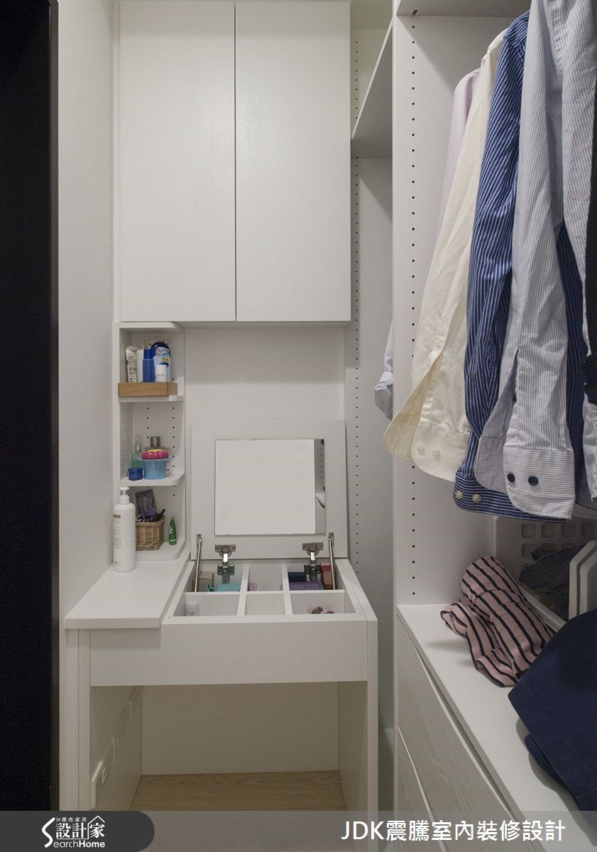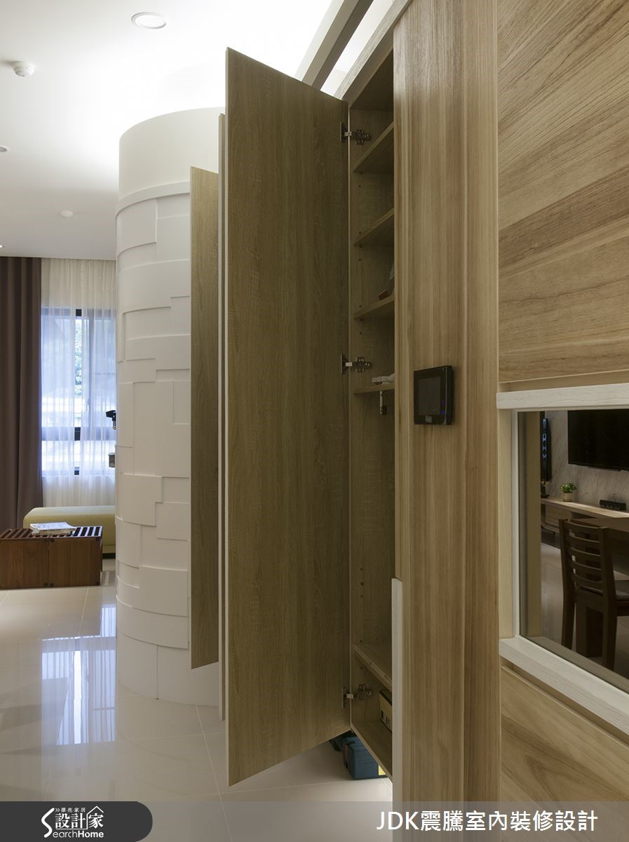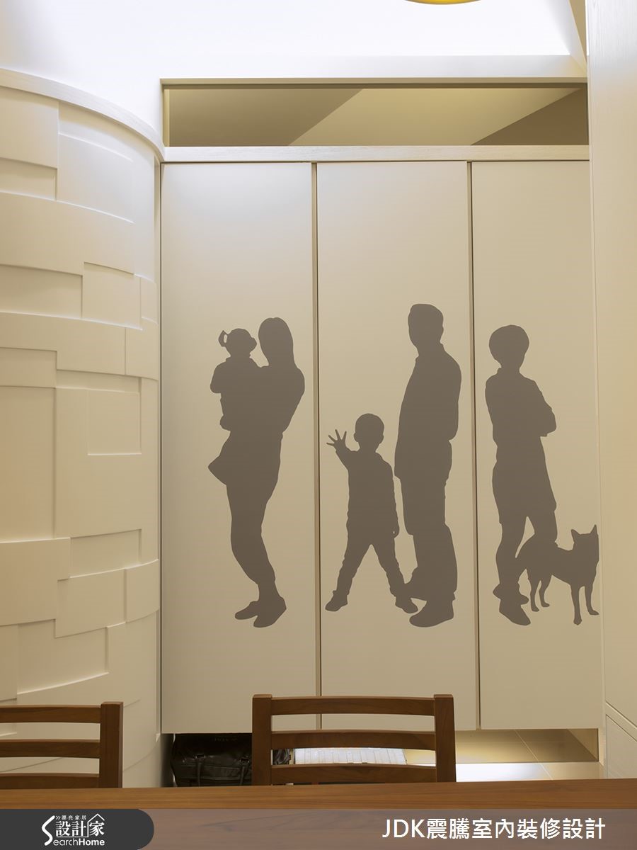 这间116平方米混搭宅,在设计师的巧思规划之下,不仅注入大量实用机能,满足屋主的储物需求。更精心做出客制设计,于墙面融入守护一家人翦影图像,快一起来看看这间充满独到记忆的住宅吧。 【整合收纳,扩大实用性】进入玄关,即看到左侧墙面嵌上隔板,把相片化为静物摆饰;右侧立面则让收纳柜一路延伸,并顺势沿柱体设置圆弧的储物间,扩充大量收纳。柜面发挥巧思,加入全家福翦影设计,打造匠心独具的客制装饰,增添立体表情。公领域整体结合家具、灯饰呈现素雅主调,且局部点缀木作材质。在天花板内嵌间接光源,使空间满溢天然轻盈的氛围,而大理石电视墙则切割成不规则几何状,勾勒出活泼的线条趣味。每间居室皆采用小而精致的设计,在不大的空间内,以轻暖的墙面色彩添注暖度,减少压迫感。空间中不乏收纳巧思,像是在衣柜置入隐藏全身镜,不仅方便实用、节省空间。又于狭长更衣室内订制小巧的梳妆台,!开启温馨十足、机能满分的生活。
