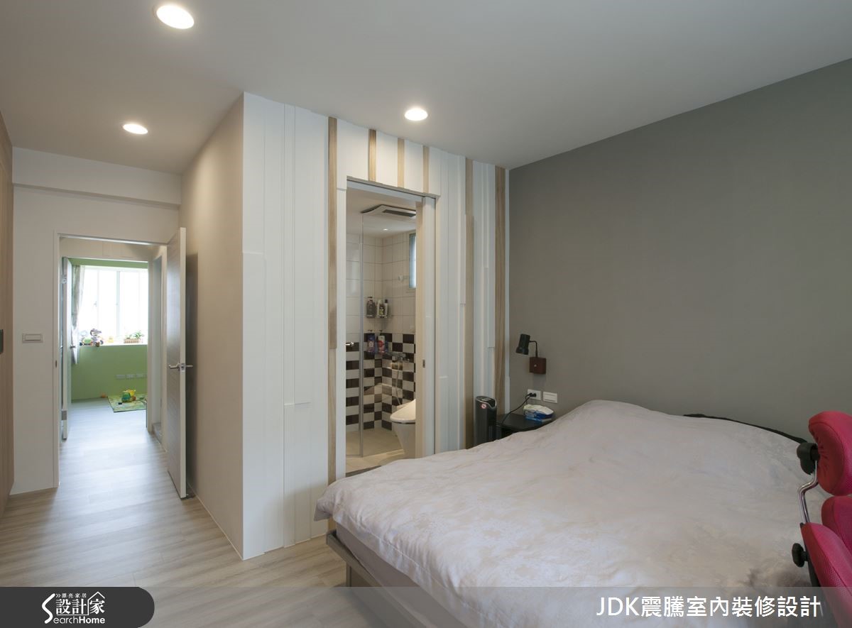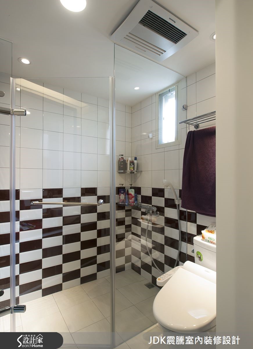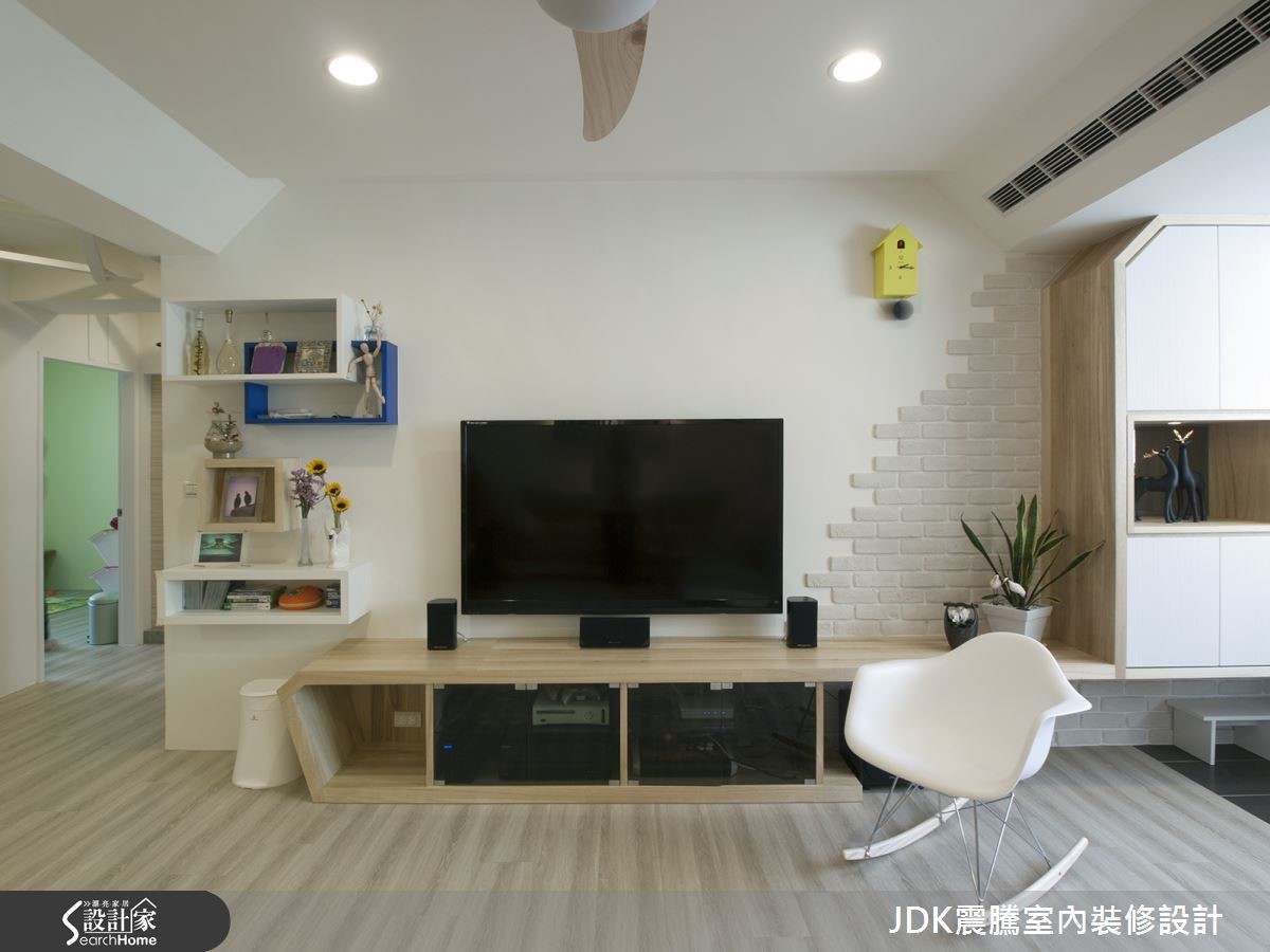 如果家中有长辈和小孩,清新自然的北欧风是不可错过的选择。此间66平方米老屋,以开放式设计结合客厅和餐厨,无论哪个角落都能和家人互动,加上流畅自然的动线与轻快活泼的色彩搭配,承载三代同堂的幸福生活。 【亮点木设计,玄关一路延伸客厅】进门后,沉稳的黑色地砖勾勒出玄关范围,浅色不规则木屏风拉出领域分界。而纯白墙面上的起伏隔板,平时可作为穿鞋区使用,下方也可以收纳常穿的鞋子。大面积的开窗将充沛的光线延伸至客厅空间,带进一室明亮光感。设计师在客厅与餐厅空间,以浅色木质调营造氛围,并妆点上明度较高的抹茶绿与海水蓝,让视觉看起来更加清新舒畅。餐厅上方以白色与浅木色穿插交错,延伸至廊道空间成为特色格栅,巧妙化解横梁的压迫不适。因为家中有两个孩子,在儿童房中设计整面黑板墙,让孩子涂鸦挥洒无限的想象。而卧室主墙面以浅褐色营造沉静舒适的氛围,推拉门后则藏着卫生间,以酒红与纯白的瓷砖拼贴表现出复古的时髦感。